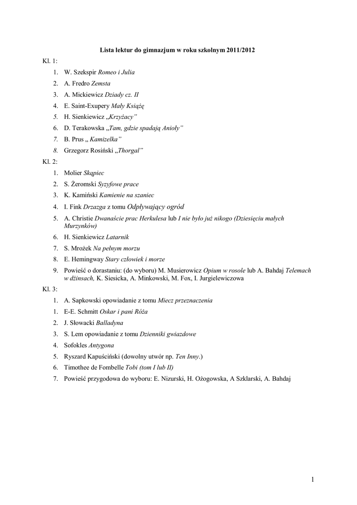 Lista lektur do gimnazjum w roku szkolnym 2011/2012 Kl. 1: 1. W. Szekspir Romeo i Julia 2. A. Fredro Zemsta 3. A. Mickiewicz Dziady cz. II 4. E. Saint-Exupery Mały Książę 5. H. Sienkiewicz „Krzyżacy” 6. D. Terakowska „Tam, gdzie spadają Anioły” 7. B. Prus „ Kamizelka” 8. Grzegorz Rosiński „Thorgal” Kl. 2: 1. Molier Skąpiec 2. S. Żeromski Syzyfowe prace 3. K. Kamiński Kamienie na szaniec 4. I. Fink Drzazga z tomu Odpływający ogród 5. A. Christie Dwanaście prac Herkulesa lub I nie było już nikogo (Dziesięciu małych Murzynków) 6. H. Sienkiewicz Latarnik 7. S. Mrożek Na pełnym morzu 8. E. Hemingway Stary człowiek i morze 9. Powieść o dorastaniu: (do wyboru) M. Musierowicz Opium w rosole lub A. Bahdaj Telemach w dżinsach, K. Siesicka, A. Minkowski, M. Fox, I. Jurgielewiczowa Kl. 3: 1. A. Sapkowski opowiadanie z tomu Miecz przeznaczenia 1. E-E. Schmitt Oskar i pani Róża 2. J. Słowacki Balladyna 3. S. Lem opowiadanie z tomu Dzienniki gwiazdowe 4. Sofokles Antygona 5. Ryszard Kapuściński (dowolny utwór np. Ten Inny.) 6. Timothee de Fombelle Tobi (tom I lub II) 7. Powieść przygodowa do wyboru: E. Nizurski, H. Ożogowska, A Szklarski, A. Bahdaj 1 Lektury uzupełniające: J. Gaarder Świat Zofii A. Libera Madame H. Sienkiewicz Potop; Qvo vadis Arkady Fiedler Dywizjon 303 Dorota Terakowska Poczwarka Paweł Huelle Weiser Dawidek Adam Mickiewicz Pan Tadeusz E. Saint-Exupery Nocny lot Antoni Czechow Śmierć urzędnika Karol Dickens Opowieść wigilijna Miguel Cerwantes Don Kichote Nancy Horwitz Kleinbaum Stowarzyszenie umarłych poetów H. Sienkiewicz Z pamiętnika poznańskiego nauczyciela B. Prus Faraon Sławomir Mrożek Wesele w Atomicach Paweł Zuchniewicz – Wujek Karol. Kapłańskie lata Papieża; Karolina Lanckorońska – Wspomnienia wojenne. Małgorzata Musierowicz Kłamczucha Krystyna Siesicka Zapałka na zakręcie John Ronald R. Tolkien Hobbit czyli tam i z powrotem Jerome David Salinger Buszujący w zbożu 2