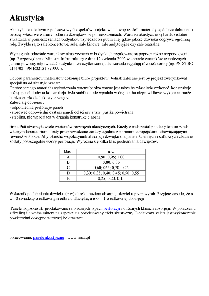 Akustyka Akustyka jest jednym z podstawowych aspektów projektowania wnętrz. Jeśli materiały są dobrze dobrane to tworzą właściwe warunki odbioru dźwięków w pomieszczeniach. Warunki akustyczne są bardzo istotne zwłaszcza w pomieszczeniach budynków użyteczności publicznej gdzie jakość dźwięku odgrywa ogromną rolę. Zwykle są to sale koncertowe, aule, sale kinowe, sale audytoryjne czy sale teatralne. Wymagania odnośnie warunków akustycznych w budynkach regulowane są poprzez różne rozporządzenia (np. Rozporządzenie Ministra Infrastruktury z dnia 12 kwietnia 2002 w sprawie warunków technicznych jakimi powinny odpowiadać budynki i ich użytkowanie). Te warunki regulują również normy (np.PN-87 BO 2151/02 ; PN B02151-3:1999 ). Doboru parametrów materiałów dokonuje biuro projektów. Jednak zalecane jest by projekt zweryfikował specjalista od akustyki wnętrz. . Oprócz samego materiału wykończenia wnętrz bardzo ważne jest także by właściwie wykonać konstrukcję nośną paneli i aby ta konstrukcja była stabilna i nie wpadała w drgania bo nieprawidłowo wykonana może bardzo zaszkodzić akustyce wnętrza. Zaleca się dobierać : - odpowiednią perforację paneli - stosować odpowiedni dystans paneli od ściany z tzw. pustką powietrzną - stabilną, nie wpadającą w drgania konstrukcję nośną firma Patt stworzyła wiele wariantów rozwiązań akustycznych. Każdy z nich został poddany testom w ich własnym laboratorium. Testy przeprowadzone zostały zgodnie z normami europejskimi, obowiązującymi również w Polsce. Aby określić współczynnik absorpcji dźwięku dla paneli ściennych i sufitowych zbadane zostały poszczególne wzory perforacji. Wyróżnia się kilka klas pochłaniania dźwięków. klasa A B C D E αw 0,90; 0,95; 1,00 0,80; 0,85 0,60; 065; 0,70; 0,75 0,30; 0,35; 0,40; 0,45; 0,50; 0,55 0,25; 0,20; 0,15 Wskaźnik pochłaniania dźwięku (α w) określa poziom absorpcji dźwięku przez wyrób. Przyjęte zostało, że α w= 0 świadczy o całkowitym odbiciu dźwięku, a α w = 1 o całkowitej absorpcji Panele TopAkustik produkowane są o różnych typach perforacji i o różnych klasach absorpcji. W połączeniu z fizeliną i i wełną mineralną zapewniają projektowany efekt akustyczny. Dodatkową zaletą jest wykończenie powierzchni dostępne w różnej kolorystyce. opracowanie: panele akustyczne - www.sasal.pl