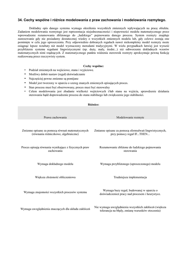 34. Cechy wspólne i różnice modelowania z praw zachowania i modelowania rozmytego. Dokładny opis danego systemu wymaga określenia wszystkich zmiennych wpływających na pracę obiektu. Zadaniem modelowania rozmytego jest reprezentacja niejednoznaczności i niepewności modelu matematycznego przez wprowadzenie rozumowania zbliżonego do „ludzkiego” pojmowania danego procesu. System rozmyty znajduje zastosowanie gdy nie posiadamy dostatecznej wiedzy o wszystkich zmiennych modelu lub, gdy celowo zostają one pominięte w celu jego uproszczenia. Przy odpowiednio dobranych regułach nawet niekompletny model rozmyty może osiągnąć lepsze rezultaty niż model wyznaczony metodami tradycyjnymi. W wielu przypadkach łatwiej jest wyrazić przybliżenie systemu regułami lingwistycznymi (np. duży, mały, średni...) niż odtworzenie dokładnych wzorów matematycznych nimi rządzących. Z matematycznego punktu widzenia sterownik rozmyty aproksymuje pewną funkcję realizowaną przez rzeczywisty system. • • • • • • Cechy wspólne: Podział zmiennych na wejściowe, stanu i wyjściowe. Możliwy dobór nastaw (reguł) doświadczanie Najczęściej pewne zmienne są pomijane Model jest tworzony w oparciu o szereg znanych zmiennych opisujących proces. Stan procesu musi być obserwowany, proces musi być sterowalny Celem modelowania jest zbadanie wielkości wejściowych i/lub stanu na wyjścia, sprawdzenie działania sterowania bądź doprowadzenie procesu do stanu stabilnego lub zwiększenie jego stabilności. Różnice: Prawa zachowania Modelowanie rozmyte Zmienne opisane za pomocą równań matematycznych (równania różniczkowe, algebraiczne) Zmianne opisane za pomocą sformułwań lingwistycznych, przy pomocy reguł IF...THEN... Proces opisują równania wynikające z fizycznych praw zachowania Rozumowanie zbliżone do ludzkiego pojmowania sterowania Wymaga dokładnego modelu Wymaga przybliżonego (uproszczonego) modelu Większa złożoność obliczeniowa Trudniejsza implementacja Wymaga znajomości wszystkich procesów systemu Wymaga bazy reguł, budowanej w oparciu o doświadczenież pracy nad procesem i heurystyce. Wymaga uwzględnienia znaczących dla układu zakłóceń Nie wymaga uwzględnienia wszystkich zakłóceń (większa tolerancja na błędy, zmianę warunków otoczenia)