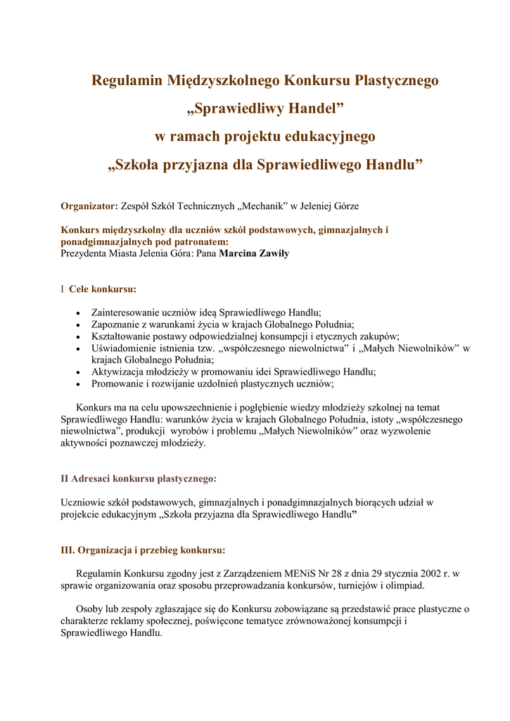 Regulamin Międzyszkolnego Konkursu Plastycznego „Sprawiedliwy Handel” w ramach projektu edukacyjnego „Szkoła przyjazna dla Sprawiedliwego Handlu” Organizator: Zespół Szkół Technicznych „Mechanik” w Jeleniej Górze Konkurs międzyszkolny dla uczniów szkół podstawowych, gimnazjalnych i ponadgimnazjalnych pod patronatem: Prezydenta Miasta Jelenia Góra: Pana Marcina Zawiły I Cele konkursu: Zainteresowanie uczniów ideą Sprawiedliwego Handlu; Zapoznanie z warunkami życia w krajach Globalnego Południa; Kształtowanie postawy odpowiedzialnej konsumpcji i etycznych zakupów; Uświadomienie istnienia tzw. „współczesnego niewolnictwa” i „Małych Niewolników” w krajach Globalnego Południa; Aktywizacja młodzieży w promowaniu idei Sprawiedliwego Handlu; Promowanie i rozwijanie uzdolnień plastycznych uczniów; Konkurs ma na celu upowszechnienie i pogłębienie wiedzy młodzieży szkolnej na temat Sprawiedliwego Handlu: warunków życia w krajach Globalnego Południa, istoty „współczesnego niewolnictwa”, produkcji wyrobów i problemu „Małych Niewolników” oraz wyzwolenie aktywności poznawczej młodzieży. II Adresaci konkursu plastycznego: Uczniowie szkół podstawowych, gimnazjalnych i ponadgimnazjalnych biorących udział w projekcie edukacyjnym „Szkoła przyjazna dla Sprawiedliwego Handlu” III. Organizacja i przebieg konkursu: Regulamin Konkursu zgodny jest z Zarządzeniem MENiS Nr 28 z dnia 29 stycznia 2002 r. w sprawie organizowania oraz sposobu przeprowadzania konkursów, turniejów i olimpiad. Osoby lub zespoły zgłaszające się do Konkursu zobowiązane są przedstawić prace plastyczne o charakterze reklamy społecznej, poświęcone tematyce zrównoważonej konsumpcji i Sprawiedliwego Handlu. Prace powinny poruszać co najmniej jeden z poniższych tematów: Warunki życia w krajach Globalnego Południa; Bądźmy fair: na czym polega idea Sprawiedliwego Handlu; Uprawy ekologiczne: wysoka jakość w połączeniu z poszanowaniem środowiska naturalnego; Etyczne zakupy: liczy się nie tylko cena; Mali niewolnicy: praca dzieci w krajach Globalnego Południa; Odpowiedzialni konsumenci, odpowiedzialne firmy. Prace konkursowe: w formacie A3 lub A2 mogą mieć dowolną formę plastyczną; Każda praca zawierać powinna: imię i nazwisko autora lub imiona i nazwiska autorów (w przypadku pracy zbiorowej), imię i nazwisko opiekuna, adres szkoły i telefon. Termin konkursu: prace plastyczne prosimy przekazać do Szkolnego Centrum Informacji w ZST „Mechanik” w Jeleniej Górze do dnia 15 maja 2013 roku. Rozstrzygnięcie konkursu i wręczenie nagród: odbędzie się 24 maja 2013 roku podczas uroczystej gali „Jeleniogórskich Dni Sprawiedliwego Handlu” w ZST „Mechanik” IV Postanowienia końcowe: Decyzje komisji konkursowej są ostatecznie i nie ma od nich odwołania. Wszystkie prace biorące udział w konkursie zostaną zatrzymane przez organizatorów i wzbogacą zbiory biblioteki szkolnej. Organizatorzy zastrzegają sobie prawo do umieszczenia pracy (lub jej fragmentów) na stronie internetowej. Wszelkich informacji związanych z przebiegiem konkursu udziela Danuta Kotowska w ZST „Mechanik” w Jeleniej Górze, adres e-mail – [email protected] lub telefonicznie 75-7525031; Regulamin opracował zespół w składzie: Aneta Palińska, Danuta Kotowska