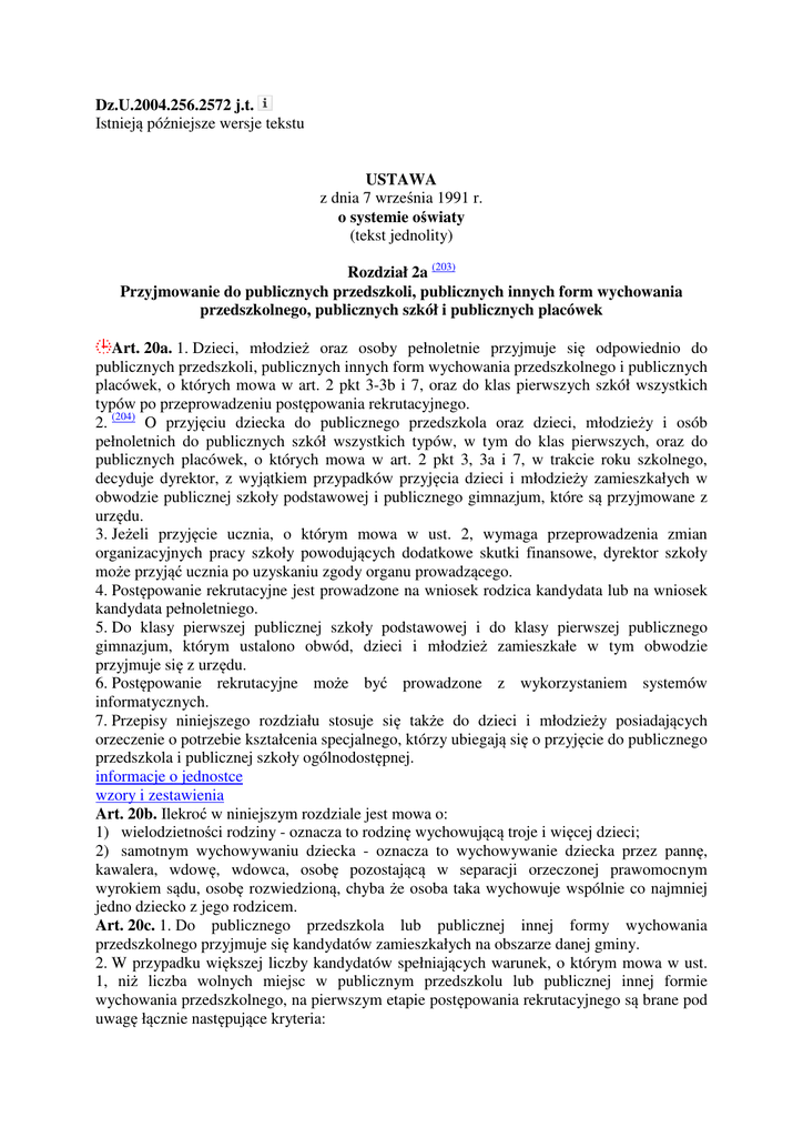 Dz.U.2004.256.2572 j.t. Istnieją późniejsze wersje tekstu USTAWA z dnia 7 września 1991 r. o systemie oświaty (tekst jednolity) Rozdział 2a (203) Przyjmowanie do publicznych przedszkoli, publicznych innych form wychowania przedszkolnego, publicznych szkół i publicznych placówek Art. 20a. 1. Dzieci, młodzież oraz osoby pełnoletnie przyjmuje się odpowiednio do publicznych przedszkoli, publicznych innych form wychowania przedszkolnego i publicznych placówek, o których mowa w art. 2 pkt 3-3b i 7, oraz do klas pierwszych szkół wszystkich typów po przeprowadzeniu postępowania rekrutacyjnego. 2. (204) O przyjęciu dziecka do publicznego przedszkola oraz dzieci, młodzieży i osób pełnoletnich do publicznych szkół wszystkich typów, w tym do klas pierwszych, oraz do publicznych placówek, o których mowa w art. 2 pkt 3, 3a i 7, w trakcie roku szkolnego, decyduje dyrektor, z wyjątkiem przypadków przyjęcia dzieci i młodzieży zamieszkałych w obwodzie publicznej szkoły podstawowej i publicznego gimnazjum, które są przyjmowane z urzędu. 3. Jeżeli przyjęcie ucznia, o którym mowa w ust. 2, wymaga przeprowadzenia zmian organizacyjnych pracy szkoły powodujących dodatkowe skutki finansowe, dyrektor szkoły może przyjąć ucznia po uzyskaniu zgody organu prowadzącego. 4. Postępowanie rekrutacyjne jest prowadzone na wniosek rodzica kandydata lub na wniosek kandydata pełnoletniego. 5. Do klasy pierwszej publicznej szkoły podstawowej i do klasy pierwszej publicznego gimnazjum, którym ustalono obwód, dzieci i młodzież zamieszkałe w tym obwodzie przyjmuje się z urzędu. 6. Postępowanie rekrutacyjne może być prowadzone z wykorzystaniem systemów informatycznych. 7. Przepisy niniejszego rozdziału stosuje się także do dzieci i młodzieży posiadających orzeczenie o potrzebie kształcenia specjalnego, którzy ubiegają się o przyjęcie do publicznego przedszkola i publicznej szkoły ogólnodostępnej. informacje o jednostce wzory i zestawienia Art. 20b. Ilekroć w niniejszym rozdziale jest mowa o: 1) wielodzietności rodziny - oznacza to rodzinę wychowującą troje i więcej dzieci; 2) samotnym wychowywaniu dziecka - oznacza to wychowywanie dziecka przez pannę, kawalera, wdowę, wdowca, osobę pozostającą w separacji orzeczonej prawomocnym wyrokiem sądu, osobę rozwiedzioną, chyba że osoba taka wychowuje wspólnie co najmniej jedno dziecko z jego rodzicem. Art. 20c. 1. Do publicznego przedszkola lub publicznej innej formy wychowania przedszkolnego przyjmuje się kandydatów zamieszkałych na obszarze danej gminy. 2. W przypadku większej liczby kandydatów spełniających warunek, o którym mowa w ust. 1, niż liczba wolnych miejsc w publicznym przedszkolu lub publicznej innej formie wychowania przedszkolnego, na pierwszym etapie postępowania rekrutacyjnego są brane pod uwagę łącznie następujące kryteria: 1) wielodzietność rodziny kandydata; 2) niepełnosprawność kandydata; 3) niepełnosprawność jednego z rodziców kandydata; 4) niepełnosprawność obojga rodziców kandydata; 5) niepełnosprawność rodzeństwa kandydata; 6) samotne wychowywanie kandydata w rodzinie; 7) objęcie kandydata pieczą zastępczą. 3. Kryteria, o których mowa w ust. 2, mają jednakową wartość. 4. W przypadku równorzędnych wyników uzyskanych na pierwszym etapie postępowania rekrutacyjnego lub jeżeli po zakończeniu tego etapu dane publiczne przedszkole albo dana publiczna inna forma wychowania przedszkolnego nadal dysponuje wolnymi miejscami, na drugim etapie postępowania rekrutacyjnego są brane pod uwagę kryteria określone przez organ prowadzący, z uwzględnieniem zapewnienia jak najpełniejszej realizacji potrzeb dziecka i jego rodziny, zwłaszcza potrzeb rodziny, w której rodzice albo rodzic samotnie wychowujący kandydata muszą pogodzić obowiązki zawodowe z obowiązkami rodzinnymi, oraz lokalnych potrzeb społecznych. Organ prowadzący określa dokumenty niezbędne do potwierdzenia tych kryteriów. 5. Na drugim etapie postępowania rekrutacyjnego może być brane pod uwagę kryterium dochodu na osobę w rodzinie kandydata. Kryterium dochodu określa organ prowadzący w stosunku procentowym do kwoty, o której mowa w art. 5 ust. 1 ustawy z dnia 28 listopada 2003 r. o świadczeniach rodzinnych (Dz. U. z 2013 r. poz. 1456, 1623 i 1650). Spełnianie tego kryterium jest potwierdzane oświadczeniem rodzica kandydata. 6. Organ prowadzący określa nie więcej niż 6 kryteriów, o których mowa w ust. 4 i 5, oraz przyznaje każdemu kryterium określoną liczbę punktów, przy czym każde kryterium może mieć różną wartość. 7. Kandydaci zamieszkali poza obszarem danej gminy mogą być przyjęci do publicznego przedszkola lub publicznej innej formy wychowania przedszkolnego na terenie tej gminy, jeżeli po przeprowadzeniu postępowania rekrutacyjnego zgodnie z ust. 1-6, dana gmina nadal dysponuje wolnymi miejscami w tym przedszkolu lub tej innej formie wychowania przedszkolnego. W przypadku większej liczby kandydatów zamieszkałych poza obszarem danej gminy przeprowadza się postępowanie rekrutacyjne. Przepisy ust. 2-6 stosuje się odpowiednio. 8. Przepisy ust. 1-7, 9 i 10 stosuje się odpowiednio do postępowania rekrutacyjnego do publicznego przedszkola integracyjnego i oddziału integracyjnego w publicznym przedszkolu ogólnodostępnym, w przypadku dzieci nieposiadających orzeczenia o potrzebie kształcenia specjalnego wydanego ze względu na niepełnosprawność. 9. Pod pojęciem dochodu, o którym mowa w ust. 5, rozumie się dochód, o którym mowa w art. 3 pkt 1 ustawy z dnia 28 listopada 2003 r. o świadczeniach rodzinnych, z tym że w przypadku przychodów podlegających opodatkowaniu na zasadach określonych w art. 27, art. 30b, art. 30c i art. 30e ustawy z dnia 26 lipca 1991 r. o podatku dochodowym od osób fizycznych (Dz. U. z 2012 r. poz. 361, z późn. zm.), pomniejsza się je o koszty uzyskania przychodu, zaliczki na podatek d