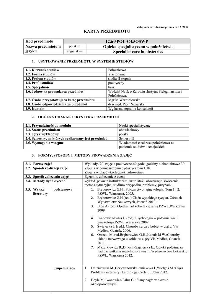Załącznik nr 1 do zarządzenia nr 12 /2012 KARTA PRZEDMIOTU Kod przedmiotu Nazwa przedmiotu w języku 12.6-3POŁ-C4.5OSWP Opieka specjalistyczna w położnictwie Specialist care in obstetrics polskim angielskim 1. USYTUOWANIE PRZEDMIOTU W SYSTEMIE STUDIÓW 1.1. Kierunek studiów 1.2. Forma studiów 1.3. Poziom studiów 1.4. Profil studiów 1.5. Specjalność 1.6. Jednostka prowadząca przedmiot 1.7. Osoba przygotowująca kartę przedmiotu 1.8. Osoba odpowiedzialna za przedmiot 1.9. Kontakt Położnictwo stacjonarne studia II stopnia praktyczny brak Wydział Nauk o Zdrowiu .Instytut Pielęgniarstwa i Położnictwa. Mgr M.Wrześniewska dr n med. Piotr Niziurski Wg harmonogramu konsultacji 2. OGÓLNA CHARAKTERYSTYKA PRZEDMIOTU 2.1. Przynależność do modułu 2.2. Status przedmiotu 2.3. Język wykładowy 2.4. Semestry, na których realizowany jest przedmiot 2.5. Wymagania wstępne Nauki specjalistyczne obowiązkowy polski Semestr II Wiadomości z zakresu położnictwa na poziomie studiów licencjackich. 3. FORMY, SPOSOBY I METODY PROWADZENIA ZAJĘĆ 3.1. Formy zajęć 3.2. Sposób realizacji zajęć 3.3. Sposób zaliczenia zajęć 3.4. Metody dydaktyczne 3.5. Wykaz literatury podstawowa Wykłady- 20, zajęcia praktyczne-40 godz, godziny niekontaktowe 30 Zajęcia w pomieszczeniu dydaktycznym UJK. Zajęcia w placówkach opieki zdrowotnej. Egzamin, zaliczenie z oceną wykład ,pokaz z instruktażem, instruktaż, obserwacja, ćwiczenia, metoda sytuacyjna, studium przypadku, problemy, przypadki. 1. Bręborowicz G.H.: Położnictwo i ginekologia. Tom 1 i 2. PZWL, Warszawa, 2005. 2. Bręborowicz G.H.(red.):Ciąża wysokiego ryzyka. Ośrodek Wydawnictw Naukowych, Poznań 2010. 3. Bień A.(red).:Opieka nad kobietą ciężarną.PZWL,Warszawa 2009 4. Iwanowicz-Palus G.(red).:Psychologia w położnictwie i ginekologii.PZWL,Warszawa 2009. 5. Świątecka J. [red.]: Choroby serca u kobiet w ciąży. Via Medica, Gdańsk, 2006. 6. Owecki M.,red.Bręborowicz G.H.,Kozubski W.:Choroby układu nerwowego u kobiet w ciąży.Via Medica, Gdańsk 2011. 7. Mazurkiewicz B.,Dmoch-Gajzlerska E.: Opieka położnicza nad pacjentkami niepełnosprawnymi.Wydawnictwo Lekarskie PZWL, Warszawa 2012. uzupełniająca 1. Dłużniewski M.,Grzywanowska-łaniewska I.,Wielgoś M.:Ciąża. Problemy internisty i kardiologa.Czelej, Lublin 2012. 2. Boyle M.,Iwanowicz-Palus G.: Stany nagłe w okresie okołoporodowym. 3. Baudet J.i wsp.: Choroby niepołożnicze u ciężarnych. PZWL,Warszawa 1990 4. Kołodziejczak M.(red.):Leczenie chorób proktologicznych w okresie ciąży i porodu.Wydawnictwo Borqis Sp.z.o.o. 2011. 4. CELE, TREŚCI I EFEKTY KSZTAŁCENIA 4.1. Cele przedmiotu C1-zapoznanie z zasadami opieki nad kobietą ciężarną,rodzącą, położnicą z chorobami układowymi, z zaburzeniami metabolicznymi i endokrynologicznymi w oparciu o aktualne standardy postępowania w opiece położniczej. C2- kształtowanie umiejętności w zakresie postępowania diagnostycznego i profilaktyczno-leczniczego w odniesieniu do kobiety ciężarnej, rodzącej, położnicy z chorobami układowymi, z zaburzeniami metabolicznymi i endokrynologicznymi, z zaburzeniami psychicznymi, C3-przygotowanie do prowadzenia procesu pielęgnowania wobec kobiety ciężarnej, rodzącej, położnicy ze współistniejącymi chorobami i zaburzeniami układowymi, z zaburzeniami metabolicznymi i endokrynologicznymi, z zaburzeniami psychicznymi, C4-kształtowanie umiejętności organizowania wsparcia ciężarnej, rodzącej, położnicy i jej rodzinie w przypadku choroby przewlekłej, niepełnosprawności,śmierci dziecka uwzględniając je indywidualną sytuację społeczną. 4.2. Treści programowe: Wykłady: -postępowanie diagnostyczno-terapeutyczne w chorobach układowych, zaburzeniach metabolicznych, endokrynologicznych, zaburzeniach psychicznych w ciąży, w czasie porodu i połogu. Zajęcia praktyczne: -zasady postępowania położnej w opiece nad ciężarną, rodzącą, położnicą z chorobami układowymi, z zaburzeniami metabolicznymi i endokrynologicznymi, zaburzeniami psychicznymi, -udział położnej w rozpoznaniu patologii w przebiegu ciąży porodu i połogu, -zasady planowania opieki położniczej nad ciężarną, rodzącą, położnicą z chorobami układowymi, z zaburzeniami metabolicznymi i endokrynologicznymi, zaburzeniami psychicznymi, -przygotowanie ciężarnej, rodzącej i położnicy z chorobami układowymi, z zaburzeniami endokrynologicznymi i psychicznymi do samoopieki , -zasady opieki nad ciężarną , rodzącą i położnicą z chorobami niepołożniczymi, -metody wsparcia ciężarnej, rodzącej,położnicy i jej rodziny w przypadkach choroby przewlekłej, niepełnosprawności, śmierci dziecka. 4.3.Efekty kształcenia dla przedmiotu kod Student, który zaliczył przedmiot w zakresie WIEDZY(wykłady i ćwiczenia): U01 U02 U05 Stopień nasycenia efektu przedmiotowego1 [+] [++] [+++] Odniesienie do efektów kształcenia dla kierunku dla obszaru/ standardu SEMESTR IV Rozpozna patologię w przebiegu ciąży, porodu , połogu na podstawie uzyskanych danych oraz ustali plan postępowania wobec podopiecznej i jej dziecka. Dobierze właściwy sposób udzielenia pomocy położniczej pacjentkom z chorobami układowymi, z zaburzeniami metabolicznymi, endokrynologicznymi i psychicznymi. Stosuje intensywny nadzór stanu ogólnego i położniczego w ciąży, podczas porodu i połogu, dopasowuje plan opieki położniczej do aktualnej [++] POŁ2P_U45 B.U13. [++] POŁ2P_U48 B.U16. [++] POŁ2P_U50 B.U18. U07 U08 sytuacji pacjentki. Monitoruje przebieg ciąży, porodu i połogu przy współistnieniu chorób niepołożniczych. Rozpozna sytuację społeczną kobiety i jej rodziny i stosuje wsparcie ciężarnej, rodzącej, położnicy i jej rodziny w przypadku choroby przewlekłej, niepełnosprawności,śmierci dziecka. [++] POŁ2P_U52 B.U20. [++] POŁ2P_U53 B.U21. w zakresie UMIEJĘTNOŚCI(zajęcia praktyczne): Rozpozna patologię w przebiegu ciąży, porodu , połogu 