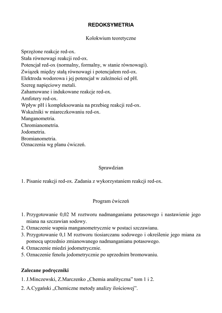 REDOKSYMETRIA Kolokwium teoretyczne Sprzężone reakcje red-ox. Stała równowagi reakcji red-ox. Potencjał red-ox (normalny, formalny, w stanie równowagi). Związek między stałą równowagi i potencjałem red-ox. Elektroda wodorowa i jej potencjał w zależności od pH. Szereg napięciowy metali. Zahamowane i indukowane reakcje red-ox. Amfotery red-ox. Wpływ pH i kompleksowania na przebieg reakcji red-ox. Wskaźniki w miareczkowaniu red-ox. Manganometria. Chromianometria. Jodometria. Bromianometria. Oznaczenia wg planu ćwiczeń. Sprawdzian 1. Pisanie reakcji red-ox. Zadania z wykorzystaniem reakcji red-ox. Program ćwiczeń 1. Przygotowanie 0,02 M roztworu nadmanganianu potasowego i nastawienie jego miana na szczawian sodowy. 2. Oznaczenie wapnia manganometrycznie w postaci szczawianu. 3. Przygotowanie 0,1 M roztworu tiosiarczanu sodowego i określenie jego miana za pomocą uprzednio zmianowanego nadmanganianu potasowego. 4. Oznaczenie miedzi jodometrycznie. 5. Oznaczenie fenolu jodometrycznie po uprzednim bromowaniu. Zalecane podręczniki 1. J.Minczewski, Z.Marczenko „Chemia analityczna” tom 1 i 2. 2. A.Cygański „Chemiczne metody analizy ilościowej”.