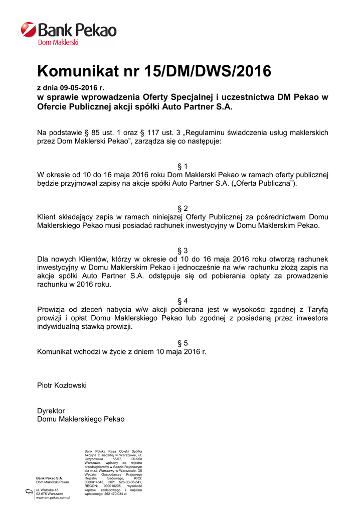 Komunikat nr 15/DM/DWS/2016 z dnia 09-05-2016 r. w sprawie wprowadzenia Oferty Specjalnej i uczestnictwa DM Pekao w Ofercie Publicznej akcji spółki Auto Partner S.A. Na podstawie § 85 ust. 1 oraz § 117 ust. 3 „Regulaminu świadczenia usług maklerskich przez Dom Maklerski Pekao”, zarządza się co następuje: §1 W okresie od 10 do 16 maja 2016 roku Dom Maklerski Pekao w ramach oferty publicznej będzie przyjmował zapisy na akcje spółki Auto Partner S.A. („Oferta Publiczna”). §2 Klient składający zapis w ramach niniejszej Oferty Publicznej za pośrednictwem Domu Maklerskiego Pekao musi posiadać rachunek inwestycyjny w Domu Maklerskim Pekao. §3 Dla nowych Klientów, którzy w okresie od 10 do 16 maja 2016 roku otworzą rachunek inwestycyjny w Domu Maklerskim Pekao i jednocześnie na w/w rachunku złożą zapis na akcje spółki Auto Partner S.A. odstępuje się od pobierania opłaty za prowadzenie rachunku w 2016 roku. §4 Prowizja od zleceń nabycia w/w akcji pobierana jest w wysokości zgodnej z Taryfą prowizji i opłat Domu Maklerskiego Pekao lub zgodnej z posiadaną przez inwestora indywidualną stawką prowizji. §5 Komunikat wchodzi w życie z dniem 10 maja 2016 r. Piotr Kozłowski Dyrektor Domu Maklerskiego Pekao Bank Pekao S.A. Dom Maklerski Pekao ul. Wołoska 18 02-675 Warszawa www.dm.pekao.com.pl Bank Polska Kasa Opieki Spółka Akcyjna z siedzibą w Warszawie, ul. Grzybowska 53/57, 00-950 Warszawa, wpisany do rejestru przedsiębiorców w Sądzie Rejonowym dla m.st. Warszawy w Warszawie, XII Wydział Gospodarczy Krajowego Rejestru Sądowego, KRS: 0000014843, NIP: 526-00-06-841, REGON: 000010205, wysokość kapitału zakładowego i kapitału wpłaconego: 262 470 034 zł. Zastrzeżenie prawne: NIE PODLEGA ROZPOWSZECHNIANIU, PUBLIKACJI BĄDŹ DYSTRYBUCJI, BEZPOŚREDNIO CZY POŚREDNIO, NA TERYTORIUM ALBO DO STANÓW ZJEDNOCZONYCH AMERYKI, AUSTRALII, KANADY ORAZ JAPONII. Niniejszy dokument (oraz informacje w nim zamieszczone) nie stanowi oferty sprzedaży ani zaproszenia do składania oferty zakupu papierów wartościowych na terytorium Stanów Zjednoczonych Ameryki. Papiery wartościowe mogą być oferowane i zbywane na terytorium Stanów Zjednoczonych Ameryki po ich zarejestrowaniu zgodnie z amerykańską ustawą o papierach wartościowych z 1933 r. ze zmianami (U.S. Securities Act of 1933, „Amerykańska Ustawa o Papierach Wartościowych”) albo na podstawie wyjątku od obowiązku rejestracyjnego przewidzianego w Amerykańskiej Ustawie o Papierach Wartościowych. Papiery wartościowe opisane w niniejszym dokumencie nie zostały ani nie zostaną zarejestrowane zgodnie z Amerykańską Ustawą o Papierach Wartościowych, ani nie są oferowane publicznie na terytorium Stanów Zjednoczonych Ameryki. Spółka nie zamierza rejestrować żadnej części Oferty w Stanach Zjednoczonych Ameryki. Niniejszy materiał ani żadna jego kopia nie może być przekazany lub w jakikolwiek sposób przesłany lub udostępniony na terytorium Stanów Zjednoczonych Ameryki. Niniejszy materiał nie jest przeznaczony do rozpowszechniania, bezpośrednio albo pośrednio, na terytorium albo do Stanów Zjednoczonych Ameryki albo w innych państwach, w których publiczne rozpowszechnianie informacji zawartych w niniejszym materiale może podlegać ograniczeniom lub być zakazane przez prawo. Niniejszy materiał nie stanowi oferty sprzedaży papierów wartościowych ani zaproszenia do składania zapisów na lub nabywania papierów wartościowych. Rozpowszechnianie tego dokumentu w niektórych państwach może być zabronione. Niedozwolona jest dystrybucja niniejszego dokumentu na terytorium Kanady, Japonii lub Australii. Informacje zawarte w załączonym dokumencie nie stanowią oferty sprzedaży ani zaproszenia do złożenia oferty nabycia papierów wartościowych w Kanadzie, Japonii lub Australii. Niniejszy dokument ma charakter wyłącznie promocyjny i nie stanowi prospektu w rozumieniu przepisów prawnych, za pośrednictwem których dokonano implementacji Dyrektywy 2003/71/WE (ze zm.) (Dyrektywa ta łącznie z przepisami prawa, za pośrednictwem których nastąpiła jej implementacja w danym Państwie Członkowskim oraz z innymi właściwymi przepisami prawa, zwana dalej „Dyrektywą Prospektową”) i nie stanowi oferty sprzedaży ani zaproszenia do nabycia papierów wartościowych. Prospekt, który został sporządzony zgodnie z postanowieniami Dyrektywy Prospektowej i zatwierdzony przez Komisję Nadzoru Finansowego w dniu 29 kwietnia 2016 r. („Prospekt”), jest jedynym prawnie wiążącym dokumentem ofertowym zawierającym informacje o Auto Partner S.A. („Spółka”) i oferowanych papierach wartościowych Spółki, a także o ich dopuszczeniu i wprowadzeniu do obrotu na rynku regulowanym prowadzonym przez Giełdę Papierów Wartościowych w Warszawie S.A. Prospekt jest dostępny na stronie internetowej Spółki www.auto-partner.pl. Niniejszy materiał nie stanowi rekomendacji w rozumieniu Rozporządzenia Ministra Finansów z dnia 19 października 2005 r. w sprawie informacji stanowiących rekomendacje dotyczące instrumentów finansowych, ich emitentów lub wystawców. Bank Pekao S.A. Dom Maklerski Pekao ul. Wołoska 18 02-675 Warszawa www.dm.pekao.com.pl Bank Polska Kasa Opieki Spółka Akcyjna z siedzibą w Warszawie, ul. Grzybowska 53/57, 00-950 Warszawa, wpisany do rejestru przedsiębiorców w Sądzie Rejonowym dla m.st. Warszawy w Warszawie, XII Wydział Gospodarczy Krajowego Rejestru Sądowego, KRS: 0000014843, NIP: 526-00-06-841, REGON: 000010205, wysokość kapitału zakładowego i kapitału wpłaconego: 262 470 034 zł.