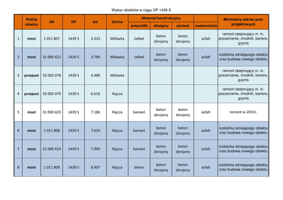 Wykaz obiektów w ciągu DP 1439 S Materiał konstrukcyjny Rodzaj obiektu JNI 1 most 1 011 807 1439 S 3.323 2 most 31 000 422 1439 S 3.790 DP km Gmina Minimalny zakres prac projektowych przyczółki dźwigary pomost nawierzchnia Milówka żelbet beton zbrojony beton zbrojony asfalt remont obejmujący m. in. poszerzenie, chodnik, bariere, gzyms Milówka żelbet beton zbrojony beton zbrojony asfalt rozbiórka istniejącego obiektu oraz budowa nowego obiektu 3 przepust 35 005 078 1439 S 4.489 Milówka remont obejmujący m. in. poszerzenie, chodnik, bariere, gzyms 4 przepust 35 005 079 1439 S 6.616 Rajcza remont obejmujący m. in. poszerzenie, chodnik, bariere, gzyms 5 most 31 000 423 1439 S 7.186 Rajcza kamień beton zbrojony beton zbrojony asfalt remont w 2015r. 6 most 1 011 808 1439 S 7.624 Rajcza kamień beton zbrojony beton zbrojony asfalt rozbiórka istniejącego obiektu oraz budowa nowego obiektu 7 most 31 000 424 1439 S 7.993 Rajcza kamień beton zbrojony beton zbrojony asfalt rozbiórka istniejącego obiektu oraz budowa nowego obiektu 8 most 1 011 809 1439 S 8.407 Rajcza beton beton zbrojony beton zbrojony asfalt rozbiórka istniejącego obiektu oraz budowa nowego obiektu Wykaz obiektów w ciągu DP 1439 S Materiał konstrukcyjny Rodzaj obiektu JNI 9 most 35 000 702 1439 S 9.815 10 most 35 000 703 1439 S 11 most 35 000 704 12 most 13 14 DP km Gmina Minimalny zakres prac projektowych przyczółki dźwigary pomost nawierzchnia Rajcza beton beton zbrojony płyty żelbetowe asfalt rozbiórka istniejącego obiektu oraz budowa nowego obiektu 10.619 Rajcza beton beton zbrojony beton zbrojony asfalt rozbiórka istniejącego obiektu oraz budowa nowego obiektu 1439 S 11.519 Ujsoły kamień beton zbrojony beton zbrojony asfalt rozbiórka istniejącego obiektu oraz budowa nowego obiektu 1 011 810 1439 S 13.735 Ujsoły żelbet beton zbrojony beton zbrojony asfalt remont obejmujący m. in. chodnik, bariere, gzyms, izolacja most 31 000 425 1439 S 14.812 Ujsoły kamień beton zbrojony beton zbrojony asfalt rozbiórka istniejącego obiektu oraz budowa nowego obiektu most 1 011 811 1439 S 18.088 Ujsoły nasyp beton zbrojony beton zbrojony asfalt rozbiórka istniejącego obiektu oraz budowa nowego obiektu 15 przepust x 1439 S 18.244 Ujsoły remont obejmujący m. in. wykonanie nowych głowic 16 przepust x 1439 S 18.446 Ujsoły remont obejmujący m. in. wykonanie nowych głowic