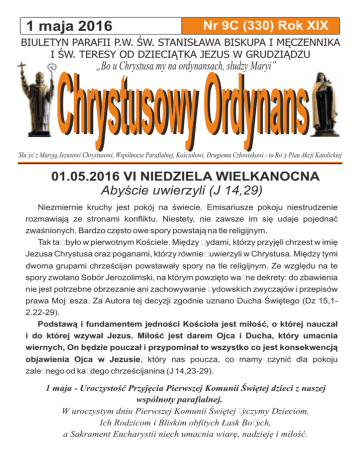 1 maja 2016 Nr 9C (330) Rok XIX BIULETYN PARAFII P.W. ŚW. STANISŁAWA BISKUPA I MĘCZENNIKA I ŚW. TERESY OD DZIECIĄTKA JEZUS W GRUDZIĄDZU „Bo u Chrystusa my na ordynansach, słudzy Maryi” Chrystusowy Ordynans Służyć z Maryją Jezusowi Chrystusowi, Wspólnocie Parafialnej, Kościołowi, Drugiemu Człowiekowi - to Boży Plan Akcji Katolickiej 01.05.2016 VI NIEDZIELA WIELKANOCNA Abyście uwierzyli (J 14,29) Niezmiernie kruchy jest pokój na świecie. Emisariusze pokoju niestrudzenie rozmawiają ze stronami konfliktu. Niestety, nie zawsze im się udaje pojednać zwaśnionych. Bardzo często owe spory powstają na tle religijnym. Tak taż było w pierwotnym Kościele. Między Żydami, którzy przyjęli chrzest w imię Jezusa Chrystusa oraz poganami, którzy również uwierzyli w Chrystusa. Między tymi dwoma grupami chrześcijan powstawały spory na tle religijnym. Ze względu na te spory zwołano Sobór Jerozolimski, na którym powzięto ważne dekrety: do zbawienia nie jest potrzebne obrzezanie ani zachowywanie żydowskich zwyczajów i przepisów prawa Mojżesza. Za Autora tej decyzji zgodnie uznano Ducha Świętego (Dz 15,12.22-29). Podstawą i fundamentem jedności Kościoła jest miłość, o której nauczał i do której wzywał Jezus. Miłość jest darem Ojca i Ducha, który umacnia wiernych, On będzie pouczał i przypominał to wszystko co jest konsekwencją objawienia Ojca w Jezusie, który nas poucza, co mamy czynić dla pokoju zależnego od każdego chrześcijanina (J 14,23-29). 1 maja - Uroczystość Przyjęcia Pierwszej Komunii Świętej dzieci z naszej wspólnoty parafialnej. W uroczystym dniu Pierwszej Komunii Świętej życzymy Dzieciom, Ich Rodzicom i Bliskim obfitych Łask Bożych, a Sakrament Eucharystii niech umacnia wiarę, nadzieję i miłość. Chrystusowy Ordynans 1.05.2016 03.05.2016 NAJŚWIĘTSZEJ MARYI PANNY KRÓLOWEJ POLSKI Tyś wielką chlubą naszego narodu (refren psalmu) Jesteśmy dumni, że Maryja jest naszą Królową. Dzień 3 maja jest świętem nie tylko kościelnym, ale i państwowym. Jak tylko potrafimy, tak łączymy te dwie wartości. Mamy bardzo wiele powodów do dumy z tego, że jesteśmy Polakami. Czerpiemy je nie tylko z poezji Cypriana Kamila Norwida, „Pana Tadeusza” Adama Mickiewicza, „Trylogii” Henryka Sienkiewicza, wierszy księdza Jana Twardowskiego, ale także z maryjnej religijności wielu Polaków. Maryja jest owym znakiem Niewiasty z Apokalipsy – Jej Syn zwycięża złego ducha i umierając na krzyżu daje Jej swego ucznia Jana za syna, a Janowi Maryję za Matkę. Radują się wraz z Maryją pierwsi chrześcijanie, gdyż w Dniu Pięćdziesiątnicy dary Pocieszyciela rozlały się na wszystkich (Ap 11,19a;12,1.3-6a.10ab i Ewangelia, J 19,25-27). W tym roku świętujemy 1050. rocznicę Chrztu Polski. Od roku 966 wraz z Maryją trwamy w wierze, wiernie stoimy pod krzyżem Chrystusa. Strona 2 Chrystusowy Ordynans 1.05.2016 08.05.2016 WNIEBOWSTĄPIENIE PAŃSKIE Z wielką radością wrócili do Jerozolimy (Łk 24,52) Tę radość mieli Apostołowie, którzy przebywali wspólnie z Mistrzem, spożywali z Nim posiłek. Zgodnie z wolą Chrystusa pozostali w Jerozolimie. W trakcie rozmowy z nimi Pan na ich oczach wzniósł się w górę i obłok, symbol Bożej obecności i bóstwa Nauczyciela, zasłonił Go. Ten fragment stanowi zakończenie Ewangelii. Zmartwychwstały Pan posyła Jedenastu na cały świat, aby głosili Ewangelię. Tajemnica wniebowstąpienia i rozszerzanie się Dobrej Nowiny rozchodzi się po całej ziemi. (Łk 24,46-53). Sam fakt Wniebowstąpienia miał miejsce w okolicach Góry Oliwnej, na drodze ku Betanii. Przed wniebowstąpieniem do nieba, czyli do Ojca, Chrystus pobłogosławił swych uczniów. Odpust parafialny przypada 8. maja w liturgiczne wspomnienie Świętego Stanisława BM, patrona naszej parafii. W tym roku ze względu na Niedzielę Wielkanocną, odpust parafialny odbędzie się 9. maja w poniedziałek. Uroczysta suma odpustowa o godz. 18.00. Zapraszamy do licznego udziału w tej uroczystości. Strona 3 Chrystusowy Ordynans 1.05.2016 09.05.2016 UROCZYSTOŚĆ ŚW. STANISŁAWA, BISKUPA I MĘCZENNIKA ODPUST PARAFIALNY Uważajcie na samych siebie na całe stado (Dz 20,28) Święty Paweł wciąż podtrzymywał kontakt z biskupami, pouczał, jak mają się zachować podczas prześladowań i wystąpień ludzi głoszących przewrotne nauki. Nawołuje ich do czujności i poleca Bogu: „Uważajcie na samych siebie i na całe stado, nad którymi Duch Święty ustanowił was biskupami”. Mówił także : „Jeżeli Bóg z nami, któż przeciwko nam?” „Któż nas może odłączyć od miłości Chrystusowej?” (Dz 20,17-18a.28-32.36). Chrystus poucza faryzeuszy, że to właśnie On jest dobrym pasterzem i zna swoje owce, i woła je po imieniu. Więź z Chrystusem odczuwał w stopniu doskonałym biskup Stanisław ze Szczepanowa. Stał na straży ładu moralnego i praw Kościoła w Polsce. W wyniku konfliktu z królem Bolesławem Śmiałym został zabity 11 kwietnia 1079 r. podczas sprawowania Eucharystii w Krakowie w kościele św. Michała na Skałce. Jego kult szybko się rozpowszechnił. Jedenaście lat później ciało świętego męczennika zostało przeniesione na Wawel. 8 września 1253, w bazylice świętego Franciszka w Asyżu, Stanisław został kanonizowany przez papieża Innocentego IV, bullą datowaną na 18 września 1253. Uroczystość podniesienia relikwii Świętego i ogłoszenia jego kanonizacji w Polsce odbyła się 8 maja 1254 roku. Święty Stanisław Biskup i Męczennik jest głównym Patronem Polski. Jest też patronem naszej parafii. Uroczysta suma odpustowa 9 maja w poniedziałek o godz. 18.00. Strona 4 Chrystusowy Ordynans 1.05.2016 W naszej wspólnocie parafialnej Dobry Pasterz w witrażu W naszym kościele pojawił się nowy witraż. Nad bocznym wejściem do kościoła od strony plebanii zamontowano witraż Jezusa, Dobrego Pasterza. To pierwszy z dwóch planowanych na ten rok 