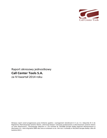 Raport okresowy jednostkowy Call Center Tools S.A. za IV kwartał 2014 roku Niniejszy raport został przygotowany przez Emitenta zgodnie z wymaganiami określonymi § 5 ust. 4.1. Załącznika Nr 3 do Regulaminu Alternatywnego Systemu Obrotu „Informacje bieżące i okresowe przekazywane w alternatywnym systemie obrotu na rynku NewConnect”, stanowiącego Załącznik nr 1 do Uchwały Nr 733/2009 Zarządu Giełdy Papierów Wartościowych w Warszawie S.A. z dnia 18 grudnia 2009 roku wraz ze zmianami w zw. Z & 6 ust. 3 Uchwały nr 451/2013 Zarządu Giełdy z dnia 29 kwietnia 2013 r. Niniejszy raport zawiera 1. Podstawowe informacje o Emitencie ......................................................................................................................... 3 1.2 Informacje dotyczące liczby osób zatrudnionych przez Emitenta w przeliczeniu na pełne etaty............................. 5 1.3 Zarząd ....................................................................................................................................................................... 5 1.4 Rada Nadzorcza ........................................................................................................................................................ 5 1.5 Podstawowe informacje rejestrowe......................................................................................................................... 6 1.6 Informacja o strukturze akcjonariatu Emitenta ze wskazaniem akcjonariuszy posiadających na dzień sporządzenia raportu co najmniej 5% głosów na walnym zgromadzeniu ................................................................ 7 2. Charakterystyka istotnych dokonań lub niepowodzeń Emitenta w okresie którego dotyczy raport wraz z opisem najważniejszych czynników i zdarzeń, w szczególności o nietypowym charakterze, mających wpływ na osiągnięte wyniki ....................................................................................................................................................................... 9 3. Aktywność w obszarze rozwoju prowadzonej działalności ....................................................................................... 10 4. Dane finansowe ........................................................................................................................................................ 11 4.1 Rachunek zysków i strat ......................................................................................................................................... 13 4.2 Bilans ...................................................................................................................................................................... 15 4.3 Rachunek Przepływów Pieniężnych ........................................................................................................................ 16 4.4 Zestawienie zmian w kapitale własnym ................................................................................................................. 16 4.5 Stanowisko odnośnie możliwości zrealizowania publikowanych prognoz wyników na dany rok, w świetle wyników zaprezentowanych w niniejszym raporcie okresowym kwartalnym ....................................................... 17 5. Informacje o zasadach przyjętych przy sporządzaniu raportu, w tym o zmianach stosowanych zasad [polityki] rachunkowości ....................................................................................................................................................... 18 6. Kontakt – Relacje Inwestorskie................................................................................................................................. 23 2015-02-16 Strona | 2 z 23 Raport okresowy jednostkowy 1. Podstawowe informacje o Emitencie Podstawową działalność Emitenta stanowi świadczenie usług w zakresie wsparcia działalności typu Call & Contact Center oraz rozwijanie narzędzi mających służyć zwiększeniu skuteczności działań telemarketingowych. Najważniejsze produkty Emitenta to Usługa Zmiennej Identyfikacji Połączeń – ZIP która w sposób istotny zwiększa odbieralność połączeń wychodzących z Call Centers do ich klientów lub dłużników. Dotychczasowe testy i doświadczenia jednoznacznie wskazują, iż skuteczność dzięki stosowaniu rozwiązania istotnie wzrasta. Przeciętnie w przedziale od 30 do 60 procent. Przekłada się to bezpośrednio na realne oszczędności i większe przychody dla klientów Emitenta. System Utrzymania Łączności - CCT Safety, który Gwarantuje niespotykany dotychczas w poziom niezawodności w łączności uwzgledniający specyfikę i potrzeby organizacji Call Centers. System Detekcji Poczty – SDP, umożliwiający osiąganie znaczących oszczędności przez organizacje Call Centers dzięki wyeliminowaniu opłat ponoszonych z tytułu dodzwaniania się na pocztę głosową abonenta. A także Enhanced Status Reporting System – ESRS, który służy do monitorowania i raportowania stanu łączy telekomunikacyjnych wykorzystywanych przez klienta (produkt finalizowany w ramach projektu dofinansowywanego ze środków Unii Europejskiej w ramach programu POIG 8.2) oraz usługa weryfikacji baz danych na ich zgodność z najbardziej aktualnymi danymi abonentów (usługa rozwijana po przejęciu spółki IPOM Sp. z o.o.). Oferowane rozwiązania znajdują zastosowanie przede wszystkim w takich obszarach jak: telesprzedaż, windykacja oraz badania opinii publicznej. Wymienione obszary biznesowe systematycznie rozwijają się a zapotrzebowanie na usługi związane z telemarketingiem dynamicznie rośnie. Spółka w ciągu minionych lat pozyskała cennych i rozwojowych klientów oraz nadal konsekwentnie rozbudowuje zaplecze abonenckie o przedsiębiorstwa będące liderami w swoich branżach. Spośród znaczących klientów można wymienić: Centra outsourcingowe Banki i ubezpieczyciele Firmy windykacyjne i 