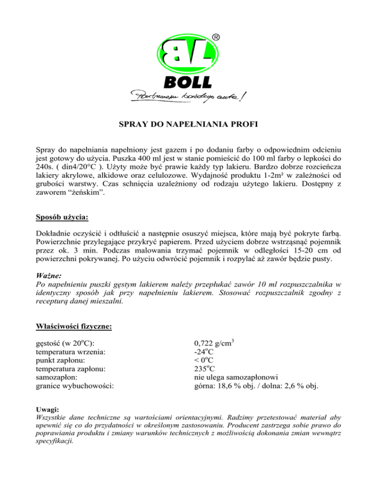 SPRAY DO NAPEŁNIANIA PROFI Spray do napełniania napełniony jest gazem i po dodaniu farby o odpowiednim odcieniu jest gotowy do użycia. Puszka 400 ml jest w stanie pomieścić do 100 ml farby o lepkości do 240s. ( din4/20°C ). Użyty może być prawie każdy typ lakieru. Bardzo dobrze rozcieńcza lakiery akrylowe, alkidowe oraz celulozowe. Wydajność produktu 1-2m² w zależności od grubości warstwy. Czas schnięcia uzależniony od rodzaju użytego lakieru. Dostępny z zaworem “żeńskim”. Sposób użycia: Dokładnie oczyścić i odtłuścić a następnie osuszyć miejsca, które mają być pokryte farbą. Powierzchnie przylegające przykryć papierem. Przed użyciem dobrze wstrząsnąć pojemnik przez ok. 3 min. Podczas malowania trzymać pojemnik w odległości 15-20 cm od powierzchni pokrywanej. Po użyciu odwrócić pojemnik i rozpylać aż zawór będzie pusty. Ważne: Po napełnieniu puszki gęstym lakierem należy przepłukać zawór 10 ml rozpuszczalnika w identyczny sposób jak przy napełnieniu lakierem. Stosować rozpuszczalnik zgodny z recepturą danej mieszalni. Właściwości fizyczne: gęstość (w 20oC): temperatura wrzenia: punkt zapłonu: temperatura zapłonu: samozapłon: granice wybuchowości: 0,722 g/cm3 -24oC < 0 oC 235oC nie ulega samozapłonowi górna: 18,6 % obj. / dolna: 2,6 % obj. Uwagi: Wszystkie dane techniczne są wartościami orientacyjnymi. Radzimy przetestować materiał aby upewnić się co do przydatności w określonym zastosowaniu. Producent zastrzega sobie prawo do poprawiania produktu i zmiany warunków technicznych z możliwością dokonania zmian wewnątrz specyfikacji.