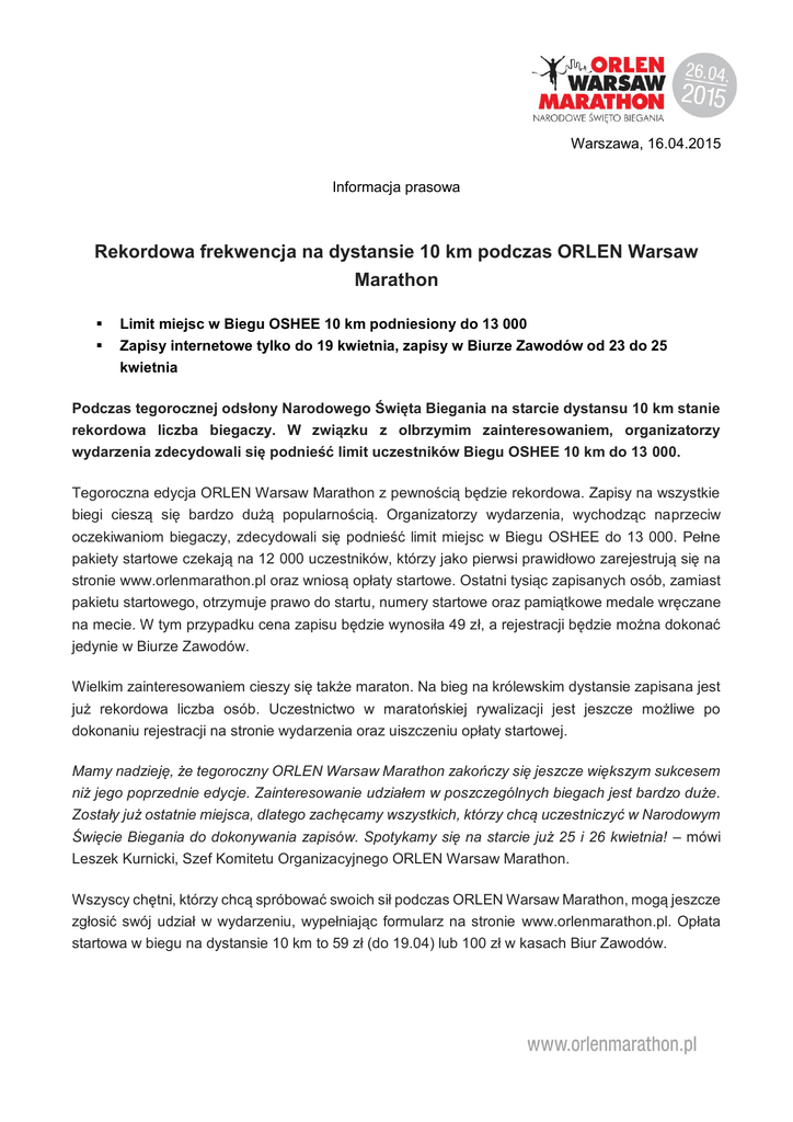 Warszawa, 16.04.2015 Informacja prasowa Rekordowa frekwencja na dystansie 10 km podczas ORLEN Warsaw Marathon Limit miejsc w Biegu OSHEE 10 km podniesiony do 13 000 Zapisy internetowe tylko do 19 kwietnia, zapisy w Biurze Zawodów od 23 do 25 kwietnia Podczas tegorocznej odsłony Narodowego Święta Biegania na starcie dystansu 10 km stanie rekordowa liczba biegaczy. W związku z olbrzymim zainteresowaniem, organizatorzy wydarzenia zdecydowali się podnieść limit uczestników Biegu OSHEE 10 km do 13 000. Tegoroczna edycja ORLEN Warsaw Marathon z pewnością będzie rekordowa. Zapisy na wszystkie biegi cieszą się bardzo dużą popularnością. Organizatorzy wydarzenia, wychodząc naprzeciw oczekiwaniom biegaczy, zdecydowali się podnieść limit miejsc w Biegu OSHEE do 13 000. Pełne pakiety startowe czekają na 12 000 uczestników, którzy jako pierwsi prawidłowo zarejestrują się na stronie www.orlenmarathon.pl oraz wniosą opłaty startowe. Ostatni tysiąc zapisanych osób, zamiast pakietu startowego, otrzymuje prawo do startu, numery startowe oraz pamiątkowe medale wręczane na mecie. W tym przypadku cena zapisu będzie wynosiła 49 zł, a rejestracji będzie można dokonać jedynie w Biurze Zawodów. Wielkim zainteresowaniem cieszy się także maraton. Na bieg na królewskim dystansie zapisana jest już rekordowa liczba osób. Uczestnictwo w maratońskiej rywalizacji jest jeszcze możliwe po dokonaniu rejestracji na stronie wydarzenia oraz uiszczeniu opłaty startowej. Mamy nadzieję, że tegoroczny ORLEN Warsaw Marathon zakończy się jeszcze większym sukcesem niż jego poprzednie edycje. Zainteresowanie udziałem w poszczególnych biegach jest bardzo duże. Zostały już ostatnie miejsca, dlatego zachęcamy wszystkich, którzy chcą uczestniczyć w Narodowym Święcie Biegania do dokonywania zapisów. Spotykamy się na starcie już 25 i 26 kwietnia! – mówi Leszek Kurnicki, Szef Komitetu Organizacyjnego ORLEN Warsaw Marathon. Wszyscy chętni, którzy chcą spróbować swoich sił podczas ORLEN Warsaw Marathon, mogą jeszcze zgłosić swój udział w wydarzeniu, wypełniając formularz na stronie www.orlenmarathon.pl. Opłata startowa w biegu na dystansie 10 km to 59 zł (do 19.04) lub 100 zł w kasach Biur Zawodów. W przypadku ostatniego tysiąca osób uczestniczących w Biegu OSHEE 10 km, opłata za udział wynosi 49 zł i może zostać uiszczona jedynie w kasie Biura Zawodów. Opłata za udział w maratonie wynosi natomiast 89 zł (do 19.04) lub 150 zł w kasach Biur Zawodów. Dokonywanie opłat w Biurze Zawodów będzie możliwe tylko w sytuacji, gdy na poszczególne biegi zostaną jeszcze wolne miejsca. Biura zawodów: Lokalizacja: Błonia Stadionu Narodowego, wzdłuż Al. Zielenieckiej 23.04.2015 r.: (czwartek) w godz.: 14.00 – 20.00 24.04.2015 r.: (piątek) w godz.: 10.00 – 21.00 25.04.2015 r. (sobota) w godz.: 09.00 – 22.00* *Biuro Zawodów Charytatywnego Marszobiegu „Biegam, Bo Lubię POMAGAM” 4,6 km w dniu 25. 04. 2015 r. będzie otwarte w godzinach: 09:00 – 14:00. Akredytacje prasowe można uzyskać wyłącznie wypełniając formularz na stronie: http://akredytacje.live.com.pl/orlen_warsaw_marathon_2015 Więcej informacji: www.orlenmarathon.pl www.facebook.com/orlenmarathon Kontakt dla mediów: Tomasz Ignatowicz, LIVE, tel.: 600 384 484 Martyna W. Nowak, LIVE, tel.: 784 011 048 Katarzyna Walczak, LIVE, tel.: 600 802 200 e-mail: [email protected] ORLEN Warsaw Marathon to największa impreza biegowa w Polsce, która odbywa się pod hasłem Narodowego Święta Biegania. Do tej pory odbyły się dwie edycje, które łącznie zgromadziły na starcie ponad 56 tys. biegaczy na wszystkich dystansach. W ramach ORLEN Warsaw Marathon organizowane są Mistrzostwa Polski w Maratonie Mężczyzn, a pula nagród pieniężnych porównywalna jest z czołowymi imprezami biegowymi w Europie. W tym samym dniu odbywa się również bieg OSHEE 10 km, a dzień wcześniej ma miejsce Charytatywny Marszobieg „Biegam, Bo Lubię POMAGAM” 4,6 km. Kontakt z IAAF: [email protected] lub [email protected]
