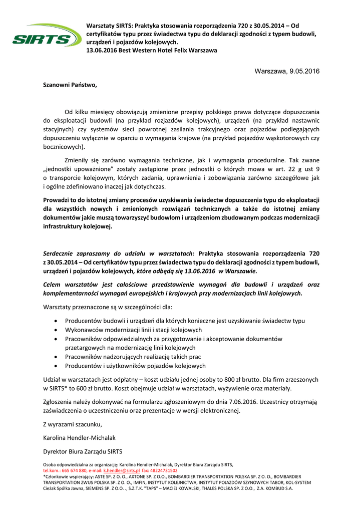 Warsztaty SIRTS: Praktyka stosowania rozporządzenia 720 z 30.05.2014 – Od certyfikatów typu przez świadectwa typu do deklaracji zgodności z typem budowli, urządzeń i pojazdów kolejowych. 13.06.2016 Best Western Hotel Felix Warszawa Warszawa, 9.05.2016 Szanowni Państwo, Od kilku miesięcy obowiązują zmienione przepisy polskiego prawa dotyczące dopuszczania do eksploatacji budowli (na przykład rozjazdów kolejowych), urządzeń (na przykład nastawnic stacyjnych) czy systemów sieci powrotnej zasilania trakcyjnego oraz pojazdów podlegających dopuszczeniu wyłącznie w oparciu o wymagania krajowe (na przykład pojazdów wąskotorowych czy bocznicowych). Zmieniły się zarówno wymagania techniczne, jak i wymagania proceduralne. Tak zwane „jednostki upoważnione” zostały zastąpione przez jednostki o których mowa w art. 22 g ust 9 o transporcie kolejowym, których zadania, uprawnienia i zobowiązania zarówno szczegółowe jak i ogólne zdefiniowano inaczej jak dotychczas. Prowadzi to do istotnej zmiany procesów uzyskiwania świadectw dopuszczenia typu do eksploatacji dla wszystkich nowych i zmienionych rozwiązań technicznych a także do istotnej zmiany dokumentów jakie muszą towarzyszyć budowlom i urządzeniom zbudowanym podczas modernizacji infrastruktury kolejowej. Serdecznie zapraszamy do udziału w warsztatach: Praktyka stosowania rozporządzenia 720 z 30.05.2014 – Od certyfikatów typu przez świadectwa typu do deklaracji zgodności z typem budowli, urządzeń i pojazdów kolejowych, które odbędą się 13.06.2016 w Warszawie. Celem warsztatów jest całościowe przedstawienie wymagań dla budowli i urządzeń oraz komplementarności wymagań europejskich i krajowych przy modernizacjach linii kolejowych. Warsztaty przeznaczone są w szczególności dla: Producentów budowli i urządzeń dla których konieczne jest uzyskiwanie świadectw typu Wykonawców modernizacji linii i stacji kolejowych Pracowników odpowiedzialnych za przygotowanie i akceptowanie dokumentów przetargowych na modernizację linii kolejowych Pracowników nadzorujących realizację takich prac Producentów i użytkowników pojazdów kolejowych Udział w warsztatach jest odpłatny – koszt udziału jednej osoby to 800 zł brutto. Dla firm zrzeszonych w SIRTS* to 600 zł brutto. Koszt obejmuje udział w warsztatach, wyżywienie oraz materiały. Zgłoszenia należy dokonywać na formularzu zgłoszeniowym do dnia 7.06.2016. Uczestnicy otrzymają zaświadczenia o uczestniczeniu oraz prezentacje w wersji elektronicznej. Z wyrazami szacunku, Karolina Hendler-Michalak Dyrektor Biura Zarządu SIRTS Osoba odpowiedzialna za organizację: Karolina Hendler-Michalak, Dyrektor Biura Zarządu SIRTS, tel.kom.: 665 674 880, e-mail: [email protected] fax: 48224731502 *Członkowie wspierający: ASTE SP. Z O. O., AXTONE SP. Z O.O., BOMBARDIER TRANSPORTATION POLSKA SP. Z O. O., BOMBARDIER TRANSPORTATION ZWUS POLSKA SP. Z O. O., IMFIN, INSTYTUT KOLEJNICTWA, INSTYTUT POJAZDÓW SZYNOWYCH TABOR, KOL-SYSTEM Cieżak Spółka Jawna, SIEMENS SP. Z O.O. ., S.Z.T.K. "TAPS" – MACIEJ KOWALSKI, THALES POLSKA SP. Z O.O., Z.A. KOMBUD S.A. Warsztaty SIRTS: Praktyka stosowania rozporządzenia 720 z 30.05.2014 – Od certyfikatów typu przez świadectwa typu do deklaracji zgodności z typem budowli, urządzeń i pojazdów kolejowych. 13.06.2016 Best Western Hotel Felix Warszawa Program 9:45 – 11:30 Rozpoczęcie warsztatów, Sesja I 1. 2. Uwarunkowania prawne uzyskiwania certyfikatów oraz świadectw typu i wystawiania deklaracji zgodności z typem. Marek Pawlik, Instytut Kolejnictwa /potwierdzone Dopuszczenie do eksploatacji pojazdów podlegających wyłącznie wymaganiom krajowym. Urząd Transportu Kolejowego /potwierdzone Dyskusja 11:30 – 11:50 Przerwa 11:50 – 13:50 Sesja II 3. 4. 5. Certyfikacja nowych typów budowli na przykładzie rozjazdów kolejowych. Jerzy Cejmer, Instytut Kolejnictwa/potwierdzone Certyfikacja nowych typów urządzeń na przykładzie nastawnicy stacyjnej. Andrzej Białoń, Instytut Kolejnictwa /potwierdzone Certyfikacja nowych typów urządzeń na przykładzie wyłącznika szybkiego. Artur Rojek, Instytut Kolejnictwa. /potwierdzone Dyskusja 13:50 – 14:40 Obiad 14:40-16:40 Sesja II 6. 7. 8. Certyfikacja nowego typu pojazdu na przykładzie pojazdów metra. Instytut Pojazdów Szynowych Tabor/potwierdzone Lista prezesa UTK. Urząd Transportu Kolejowego /potwierdzone Dokumenty wymagane dla budowli , urządzeń i składników interoperacyjności przy modernizacji linii kolejowej – komplementarność krajowych i europejskich procesów oceny zgodności z wymaganiami. Marek Pawlik, Instytut Kolejnictwa /potwierdzone Dyskusja 16:45 Zakończenie warsztatów, rozdanie prezentacji w wersji elektronicznej, rozdanie zaświadczeń o uczestniczeniu. Osoba odpowiedzialna za organizację: Karolina Hendler-Michalak, Dyrektor Biura Zarządu SIRTS, tel.kom.: 665 674 880, e-mail: [email protected] fax: 48224731502 *Członkowie wspierający: ASTE SP. Z O. O., AXTONE SP. Z O.O., BOMBARDIER TRANSPORTATION POLSKA SP. Z O. O., BOMBARDIER TRANSPORTATION ZWUS POLSKA SP. Z O. O., IMFIN, INSTYTUT KOLEJNICTWA, INSTYTUT POJAZDÓW SZYNOWYCH TABOR, KOL-SYSTEM Cieżak Spółka Jawna, SIEMENS SP. Z O.O. ., S.Z.T.K. "TAPS" – MACIEJ KOWALSKI, THALES POLSKA SP. Z O.O., Z.A. KOMBUD S.A. Warsztaty SIRTS: Praktyka stosowania rozporządzenia 720 z 30.05.2014 – Od certyfikatów typu przez świadectwa typu do deklaracji zgodności z typem budowli, urządzeń i pojazdów kolejowych. 13.06.2016 Best Western Hotel Felix Warszawa Formularz zgłoszeniowy Prosimy o przesłanie wypełnionego formularza do Biura Zarządu SIRTS e-mailem [email protected] lub faxem na numer + 48 22 473 15 02 do 7.06.2016r. Dane uczestnika Nazwisko Imiona E-mail Tel. bezp. Stanowisko służbowe Tel. kom. Dane uczestnika Nazwisko Imiona E-mail Tel. bezp. Stanowisko służbowe Tel. kom. Dane przedsiębiorstwa do wystawienia faktury: Nazwa Ulica Nr Kod pocztowy
