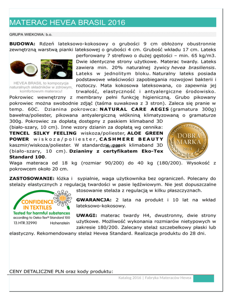 MATERAC HEVEA BRASIL 2016 GRUPA WIEKOWA: b.o. BUDOWA: Rdzeń lateksowo-kokosowy o grubości 9 cm obłożony obustronnie zewnętrzną warstwą pianki lateksowej o grubości 4 cm. Grubość wkładu 17 cm. Lateks perforowany 7 strefowo o dużej gęstości – min. 65 kg/m3. Dwie identyczne strony użytkowe. Materac twardy. Lateks zawiera min. 20% naturalnej żywicy hevea brasiliensis. Lateks w jednolitym bloku. Naturalny lateks posiada podstawowe właściwości zapobiegania rozwojowi bakterii i roztoczy. Mata kokosowa lateksowana, co zapewnia jej trwałość, elastyczność i antyalergiczne środowisko. Pokrowiec wewnętrzny z membrany pełni funkcję higieniczną. Grubo pikowany pokrowiec można swobodnie zdjąć (taśma suwakowa z 3 stron). Zaleca się pranie w temp. 60C. Dzianina pokrowca: NATURAL CARE AEGIS (gramatura 300g) bawełna/poliester, pikowana antyalergiczną włókniną klimatyzowaną o gramaturze 300g. Pokrowiec za dopłatą dostępny z paskiem klimaband 3D (biało-szary, 10 cm). Inne wzory dzianin za dopłatą wg cennika: TENCEL SILKY FEELING wiskoza/poliester, ALOE GREEN POWER w i s k o z a / p o l i e s t e r , C A S H M E R E B E A U T Y kaszmir/wiskoza/poliester. W standardzie pasek klimaband 3D (biało-szary, 10 cm). Dzianiny z certyfikatem Eko-Tex Standard 100. Waga materaca od 18 kg (rozmiar 90/200) do 40 kg (180/200). Wysokość z pokrowcem około 20 cm. ZASTOSOWANIE: łóżka i sypialnie, waga użytkownika bez ograniczeń. Polecany do stelaży elastycznych z regulacją twardości w pasie lędźwiowym. Nie jest dopuszczalne stosowanie stelaża z regulacją w kilku płaszczyznach. GWARANCJA: 2 lata na produkt i 10 lat na wkład lateksowo-kokosowy. UWAGI: materac twardy H4, dwustronny, dwie strony użytkowe. Możliwość wykonania rozmiarów nietypowych w zakresie 180/200. Zalecany stelaż szczebelkowy płaski lub elastyczny. Rekomendowany stelaż Hevea Standard. Realizacja produktu do 28 dni. CENY DETALICZNE PLN oraz kody produktu: Katalog 2016 | Fabryka Materaców Hevea POKROWIEC AEGIS NATURAL CARE* Materac Materac Materac Materac Hevea Hevea Hevea Hevea Brasil Brasil Brasil Brasil 90/200 140/200 160/200 180/200 590160210391 590160210392 590160210393 590160210394 1631 2372 2671 2893 POKROWCE TENCEL SILKY FEELING, ALOE GREEN POWER, CASHMERE BEAUTY Materac Materac Materac Materac Hevea Hevea Hevea Hevea Brasil Brasil Brasil Brasil 90/200 140/200 160/200 180/200 590160210391 590160210392 590160210393 590160210394 1696 2462 2761 2983 *cena w pokrowcu bez paska klimaband 3D Katalog 2016 | Fabryka Materaców Hevea Katalog 2016 | Fabryka Materaców Hevea