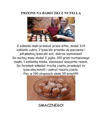 PRZEPIS NA BABECZKI Z NUTELLĄ 2 szklanki mąki przesiać przez sitko, dodać 3/4 szklanki cukru, 2 łyżeczki proszku do pieczenia i pół płaskiej łyżeczki soli, dobrze wymieszać! Do suchej masy dodać 2 jajka, 100 gram roztopionego masła, 1 szklankę mleka, zamieszać wszystko razem. Do foremek wkładać trochę ciasta, przełożyć to łyżeczką nutelli i zakryć resztą ciasta. Piec w 190 stopniach około 35 minut!!!!! SMACZNEGO!
