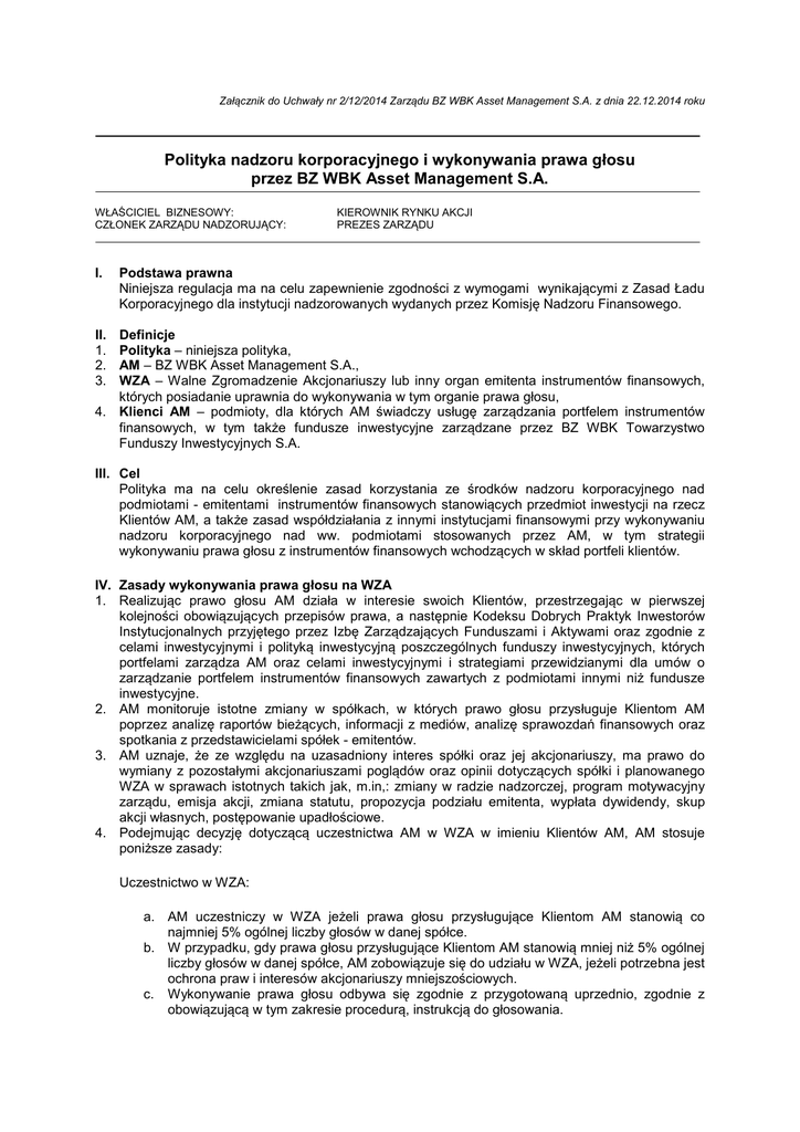 Załącznik do Uchwały nr 2/12/2014 Zarządu BZ WBK Asset Management S.A. z dnia 22.12.2014 roku Polityka nadzoru korporacyjnego i wykonywania prawa głosu przez BZ WBK Asset Management S.A. WŁAŚCICIEL BIZNESOWY: CZŁONEK ZARZĄDU NADZORUJĄCY: I. KIEROWNIK RYNKU AKCJI PREZES ZARZĄDU Podstawa prawna Niniejsza regulacja ma na celu zapewnienie zgodności z wymogami wynikającymi z Zasad Ładu Korporacyjnego dla instytucji nadzorowanych wydanych przez Komisję Nadzoru Finansowego. II. 1. 2. 3. Definicje Polityka – niniejsza polityka, AM – BZ WBK Asset Management S.A., WZA – Walne Zgromadzenie Akcjonariuszy lub inny organ emitenta instrumentów finansowych, których posiadanie uprawnia do wykonywania w tym organie prawa głosu, 4. Klienci AM – podmioty, dla których AM świadczy usługę zarządzania portfelem instrumentów finansowych, w tym także fundusze inwestycyjne zarządzane przez BZ WBK Towarzystwo Funduszy Inwestycyjnych S.A. III. Cel Polityka ma na celu określenie zasad korzystania ze środków nadzoru korporacyjnego nad podmiotami - emitentami instrumentów finansowych stanowiących przedmiot inwestycji na rzecz Klientów AM, a także zasad współdziałania z innymi instytucjami finansowymi przy wykonywaniu nadzoru korporacyjnego nad ww. podmiotami stosowanych przez AM, w tym strategii wykonywaniu prawa głosu z instrumentów finansowych wchodzących w skład portfeli klientów. IV. Zasady wykonywania prawa głosu na WZA 1. Realizując prawo głosu AM działa w interesie swoich Klientów, przestrzegając w pierwszej kolejności obowiązujących przepisów prawa, a następnie Kodeksu Dobrych Praktyk Inwestorów Instytucjonalnych przyjętego przez Izbę Zarządzających Funduszami i Aktywami oraz zgodnie z celami inwestycyjnymi i polityką inwestycyjną poszczególnych funduszy inwestycyjnych, których portfelami zarządza AM oraz celami inwestycyjnymi i strategiami przewidzianymi dla umów o zarządzanie portfelem instrumentów finansowych zawartych z podmiotami innymi niż fundusze inwestycyjne. 2. AM monitoruje istotne zmiany w spółkach, w których prawo głosu przysługuje Klientom AM poprzez analizę raportów bieżących, informacji z mediów, analizę sprawozdań finansowych oraz spotkania z przedstawicielami spółek - emitentów. 3. AM uznaje, że ze względu na uzasadniony interes spółki oraz jej akcjonariuszy, ma prawo do wymiany z pozostałymi akcjonariuszami poglądów oraz opinii dotyczących spółki i planowanego WZA w sprawach istotnych takich jak, m.in,: zmiany w radzie nadzorczej, program motywacyjny zarządu, emisja akcji, zmiana statutu, propozycja podziału emitenta, wypłata dywidendy, skup akcji własnych, postępowanie upadłościowe. 4. Podejmując decyzję dotyczącą uczestnictwa AM w WZA w imieniu Klientów AM, AM stosuje poniższe zasady: Uczestnictwo w WZA: a. AM uczestniczy w WZA jeżeli prawa głosu przysługujące Klientom AM stanowią co najmniej 5% ogólnej liczby głosów w danej spółce. b. W przypadku, gdy prawa głosu przysługujące Klientom AM stanowią mniej niż 5% ogólnej liczby głosów w danej spółce, AM zobowiązuje się do udziału w WZA, jeżeli potrzebna jest ochrona praw i interesów akcjonariuszy mniejszościowych. c. Wykonywanie prawa głosu odbywa się zgodnie z przygotowaną uprzednio, zgodnie z obowiązującą w tym zakresie procedurą, instrukcją do głosowania. 5. 6. 7. 8. 9. 10. d. AM może zrezygnować z udziału w WZA jeśli uzna, że koszty uczestnictwa są niewspółmierne do korzyści, które Klienci AM odnieśliby z uczestnictwa AM w WZA lub jeśli w opinii AM przyjęcie uchwał ogłoszonych w porządku obrad WZA nie narusza interesów akcjonariuszy spółki. e. AM może wykonywać prawo głosu podczas WZA tylko z części akcji przysługujących Klientom AM. AM wspiera wszelkie działania zwiększające niezależność rad nadzorczych emitentów. AM może zgłaszać kandydatów do rad nadzorczych emitentów. Zgłaszanie kandydatów do rad nadzorczych następuje przy uwzględnieniu poniższych zasad: a. AM informuje o zgłaszanych kandydatach do rad nadzorczych spółek, w których może wykonywać prawo głosu, na co najmniej 7 dni przed dniem WZA. b. Kandydaci zgłaszani przez AM będą spełniali kryteria przewidziane dla niezależnych członków rad nadzorczych w postanowieniach Kodeksu Dobrych Praktyk Inwestorów Instytucjonalnych. Podejmując decyzję o sposobie głosowania uchwał WZA dotyczących wprowadzenia i zmiany programów motywacyjnych u emitentów AM uwzględnia poniższe zasady przy uwzględnieniu specyficznej sytuacji emitenta: a. AM uznaje za zasadne wiązanie wynagrodzenia zarządu emitentów z wynikami spółek. b. AM nie popiera wprowadzania programów motywacyjnych, jeśli ich wynikiem miałby być nadmierny (nieuzasadniony) wzrost emisji akcji lub brak jasnego bezpośredniego uzasadnienia w postaci aktualnie osiąganych wyników. c. AM uznaje za niezasadne wprowadzanie programów menedżerskich, w których cena przyznania opcji lub sprzedaży akcji jest niższa od wartości rynkowej akcji lub które charakteryzują się krótkim okresem trwania. d. AM uznaje za niezasadne wprowadzanie programów motywacyjnych obejmujących bardzo niewielką grupę osób, a zwłaszcza jedną osobę. Podejmując decyzję o sposobie głosowania uchwał WZA dotyczących zmiany statutu AM uwzględnia poniższe zasady przy uwzględnieniu specyficznej sytuacji emitenta: a. AM popiera takie zmiany statutu, których efektem będzie równouprawnienie wszystkich akcji z poszanowaniem praw akcjonariuszy mniejszościowych. b. AM jest przeciwne podejmowaniu przez spółki działań prawnych, których jedynym lub podstawowym celem jest zapobieganiu przejęciu kontroli nad spółką. AM będzie popierać wszystkie zmiany ułatwiające przejęcie kontroli nad spółką jako element motywujący zarząd do kreowania wartości dla akcjonariuszy. c. AM jest przeciwne wszelkim zmianom statutu emitenta, w wyni