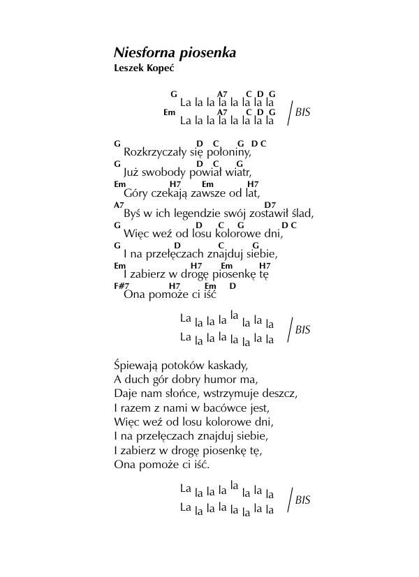 Niesforna piosenka Leszek Kopeæ G Em G G A7 C D G A7 C D G La la la la la la la la BIS La la la la la la la la D C G DC D C G Rozkrzycza³y siê po³oniny, Ju¿ swobody powia³ wiatr, Em H7 Em H7 Góry czekaj¹ zawsze od lat, A7 D7 Byœ w ich legendzie swój zostawi³ œlad, G G D C G DC Wiêc weŸ od losu kolorowe dni, D C G I na prze³êczach znajduj siebie, Em H7 Em H7 I zabierz w drogê piosenkê tê F#7 H7 Em Ona pomo¿e ci iœæ D La la la la la la la la La la la la la la la la BIS Œpiewaj¹ potoków kaskady, A duch gór dobry humor ma, Daje nam s³oñce, wstrzymuje deszcz, I razem z nami w bacówce jest, Wiêc weŸ od losu kolorowe dni, I na prze³êczach znajduj siebie, I zabierz w drogê piosenkê tê, Ona pomo¿e ci iœæ. La la la la la la la la La la la la la la la la BIS
