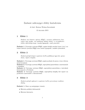 Zadanie zaliczające efekty kształcenia dr hab. Bożena Woźna-Szcześniak 12 stycznia 2015 1 Efekt 1 Student zna historie sytemu LATEX i rozumie podstawowe koncepcje tego języka, zna podstawy składu tekstu, w szczególności tekstu informatycznego, zasady typografii, znaki pisarskie. Zadanie 1. Używając systemu LATEX, napisz krótki artykuł (max 4 str.) na temat historii systemu LATEX oraz zasad typografii i znaków pisarskich. 2 Efekt 2 Student potrafi złożyć w systemie LaTex publikacje typu list, sprawdzian, raport, książka. Zadanie 1. Używając systemu LATEX, napisz podanie do pracy, wraz z listem motywacyjnym. Zadanie 2. Używając systemu LATEX, zaprojektuj sprawdzian z matematyki z ułamków. Zadanie 3. Używając systemu LATEX, zaprojektuj sprawdzian z instrukcji iteracyjnych w Pythonie. Zadanie 4. Używając systemu LATEX, zaprojektuj książkę lub raport na podstawie materiałów z laboratoriów. 3 Efekt 3 Student potrafi wykonać w systemie LaTex prezentacje multimedialną. Zadanie 1. Dane są następujące tematy: • Historia polskiej informatyki • Historia Internetu 1 • Historia systemu operacyjnego Unix i Linux • Rozwój oprogramowania do grafiki rastrowej • Rozwój oprogramowania do grafiki wektorowej • Historia języków programowania • Możliwości pakietu GasTeX(Graphs and Automata Simplified in TEX) • Możliwości pakietu Fancyhdr (Extensive control of page headers and footers in LATEX2e) • Pakiety do składania listów • Pakiety do składania prac dyplomowych • Możliwości edytora vim Zaprojektuj i wykonaj prezentację multimedialną na jeden z tematów wymienionych powyżej. Uwaga ! Poinformuj kolegę o swoim wyborze. Tematy prezentacji nie mogą się powtarzać. 4 Efekt 4 Student potrafi przystosować środowisko LaTex do własnych potrzeb. Na stronie: http://www.mimuw.edu.pl/~malcin/zpp/prezentacja-latex/ #5 Znajdują się materiały do nauki pisania makr. Proszę się z nimi zapoznać i przygotować dokument w LATEX, który ilustruje użycie makr, w szczególności tych definiujących kolory. 2