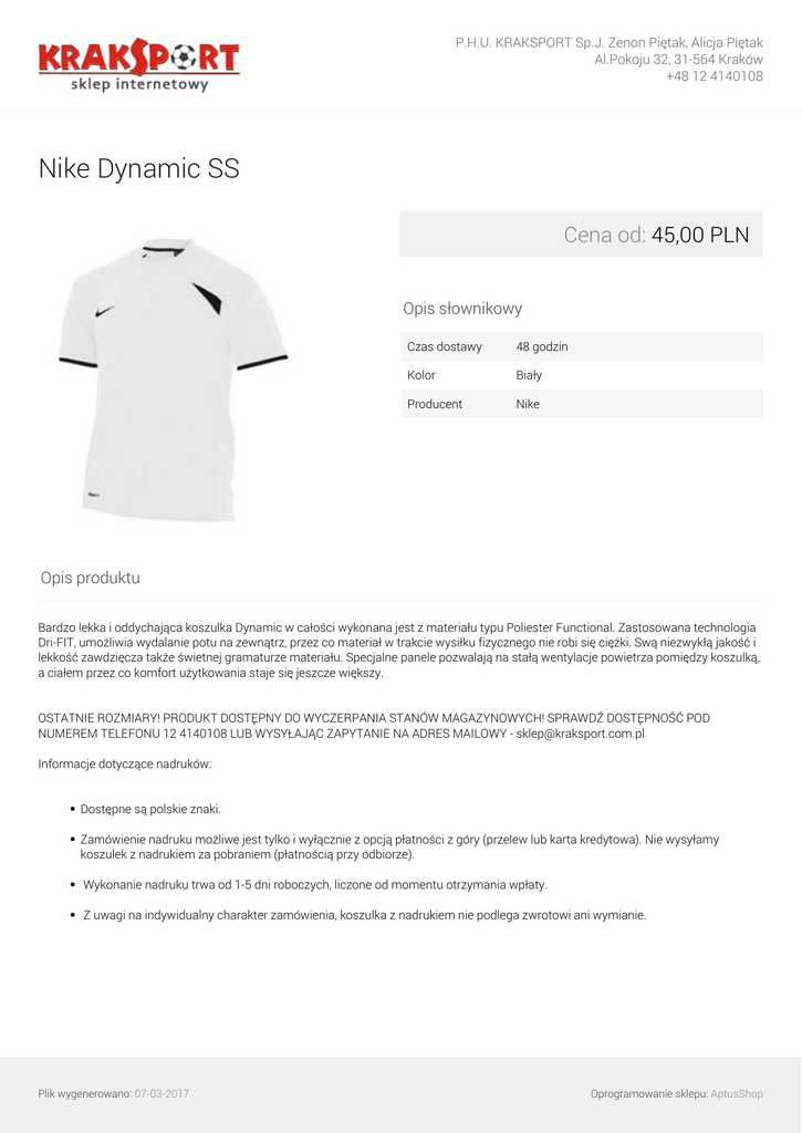 P.H.U. KRAKSPORT Sp.J. Zenon Piętak, Alicja Piętak Al.Pokoju 32, 31-564 Kraków +48 12 4140108 Nike Dynamic SS Cena od: 45,00 PLN Opis słownikowy Czas dostawy 48 godzin Kolor Biały Producent Nike Opis produktu Bardzo lekka i oddychająca koszulka Dynamic w całości wykonana jest z materiału typu Poliester Functional. Zastosowana technologia Dri-FIT, umożliwia wydalanie potu na zewnątrz, przez co materiał w trakcie wysiłku fizycznego nie robi się ciężki. Swą niezwykłą jakość i lekkość zawdzięcza także świetnej gramaturze materiału. Specjalne panele pozwalają na stałą wentylacje powietrza pomiędzy koszulką, a ciałem przez co komfort użytkowania staje się jeszcze większy. OSTATNIE ROZMIARY! PRODUKT DOSTĘPNY DO WYCZERPANIA STANÓW MAGAZYNOWYCH! SPRAWDŹ DOSTĘPNOŚĆ POD NUMEREM TELEFONU 12 4140108 LUB WYSYŁAJĄC ZAPYTANIE NA ADRES MAILOWY - [email protected] Informacje dotyczące nadruków: Dostępne są polskie znaki. Zamówienie nadruku możliwe jest tylko i wyłącznie z opcją płatności z góry (przelew lub karta kredytowa). Nie wysyłamy koszulek z nadrukiem za pobraniem (płatnością przy odbiorze). Wykonanie nadruku trwa od 1-5 dni roboczych, liczone od momentu otrzymania wpłaty. Z uwagi na indywidualny charakter zamówienia, koszulka z nadrukiem nie podlega zwrotowi ani wymianie. Plik wygenerowano: 07-03-2017 Oprogramowanie sklepu: AptusShop P.H.U. KRAKSPORT Sp.J. Zenon Piętak, Alicja Piętak Al.Pokoju 32, 31-564 Kraków +48 12 4140108 Warianty produktu Plik wygenerowano: 07-03-2017 Powered by TCPDF (www.tcpdf.org) XL 45,00 PLN XXL 45,00 PLN Oprogramowanie sklepu: AptusShop