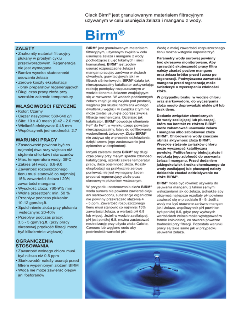 Clack Birm® jest granulowanym materiałem filtracyjnym używanym w celu usunięcia żelaza i manganu z wody. Birm® ® ZALETY • Znakomity materiał filtracyjny płukany w prostym cyklu przeciwprądowym. Regeneracja nie jest wymagana • Bardzo wysoka skuteczność usuwania żelaza • Zerowe koszty eksploatacji ZALETY regenerujących - brak preparatów • •Znakomity�materiał filtracyjny Długi czas pracy złoża przy płukany�w�prostym�cyklu szerokim zakresie temperatury • • • • • • • • • • • • • • • • • • przeciwprądowym Regeneracja�nie�jest�wymagana WŁAŚCIWOŚCI FIZYCZNE Bardzo�wysoka�skuteczność żelaza •usuwania Kolor: Czarny •Zerowe�koszty�eksploatacji�Ciężar nasypowy: 560-640 g/l •brak�preparatów�regenerujących Sito: 10 x 40 mesh (0.42 - 2.0 mm) •Długi�czas�pracy�złoża�przy Wielkość efektywna: 0.48 mm szerokim�zakresie�temperatury •Gęstość Współczynnik jednorodności: 2.7 nasypowa:�640-720�g/l WŁAŚCIWOŚCI�FIZYCZNE WARUNKI PRACY •Kolor:�Czarny Zasadowość powinna być co Gęstość najmniejnasypowa:�640-720�g/l dwa razy większa niż Wymiar�ziaren:�10�x�40�mesh stężenie chlorków i siarczanów Specific�Gravity:�2.0�gm/cc •Uziarnienie:�0.48�mm Max. temperatura wody: 38oC •Współczynnik�jednorodności:�2.7 Zakres pH wody: 6.8-9.0 • Zawartość rozpuszczonego tlenu WARUNKI�PRACY musi stanowić co najmniej Zasadowość powinna�być 15% zawartości żelaza ico�najmniej 29% dwa�razy�większa�niż stężenie zawartości manganu chlorków�i�siarczanów o •Max�temperatura Wysokość złoża: 760-915 wody: 38 Cmm •Zakres�pH�wody:�6.8-9.0 Wolna przestrzeń: min. 50 % •Zawarto Przepływ podczas płukania: ść rozpuszczonego�tlenu musi�stanowić co�najmniej�15% 10-12 gpm/sq.ft. żelaza�(lub żelaza�i •zawartości Spulchnienie złoża przy płukaniu manganu) wstecznym: 20-40% Wysokość złoża:�760-9010�mm •Wolna�przestrzeń:�min.50% Przepływ podczas pracy: 3.5 - 5 gpm/sq.ft. (przy pracy wysokości�złoża Prędkość podczas�płukania:25-30m/h okresowej prędkość filtracji może Ekspansja�złoża�podczas płukania: być kilkakrotnie większa) 20-40%�wysokości�złoża�(min.) • Prędkość podczas�pracy:�9-12�m/h OGRANICZENIA przy�pracy�okresowej�prędkość STOSOWANIA filtracji�może�być kilkukrotnie •większa Zawartość wolnego chloru musi być niższa niż 0.5 ppm OGRANICZENIA PODCZAS • Siarkowodór należy usunąć przed STOSOWANIA ZŁOŻA BIRM filtrem wypełnionym złożem BIRM • Zawartość wolnego�chloru�poniżej •0.5�ppm Woda nie może zawierać olejów ani fosforanów • Siarkowodór�należy�usunąć przed filtrem�wypełnionym�złożem�BIRM • Brak�olejów�w�wodzie • Brak�fosforanów�w�wodzie Clack�Birm jest�granulowanym�materiałem�filtracyjnym używanym�w�celu�usunięcia żelaza�i�manganu�z�wody. BIRM® jest granulowanym materiałem filtracyjnym, używanym zwykle w celu usunięcia żelaza i manganu z wody pochodzącej z ujęć lokalnych i sieci komunalnej. BIRM® jest zdolny usunąć rozpuszczone żelazo i mangan pracując zarówno w złożach otwartych, grawitacyjnych jak i w filtrach ciśnieniowych. BIRM® działa jak ® nierozpuszczalny katalizator uaktywniając BIRM�jest�granulowanym�materiałem reakcję pomiędzy rozpuszczonym w filtracyjnym,�używanym�zwykle�w�celu usunięcia żelaza�i�manganu�z�wody wodzie tlenem a żelazem znajdującym pochodzącej�z�ujęć się w roztworze. Wlokalnych�i�sieci wodach podziemnych komunalnej.�BIRM�jest�zdolny�usunąć żelazo znajduje się zwykle pod postacią rozpuszczone żelazo�i�mangan�pracując węglanu (na skutek nadmiaru wolnego zarówno�w�złożach�otwartych, dwutlenku węgla) i w związku z tym nie grawitacyjnych�jak�i�w�filtrach może zostać usunięte poprzez zwykłą ciśnieniowych.BIRM�działa�jak filtrację mechaniczną. Działając jak nierozpuszczalny�katalizator�uaktywniając reakcję pomiędzy�rozpuszczonym�w katalizator, BIRM® powoduje utlenianie 2+ 3+ wodzie�tlenem�a żelazem�znajdującym�się Fe do Fe , w wyniku czego powstaje w�roztworze.�W�wodach�podziemnych nierozpuszczalny, łatwy do odfiltrowania żelazo�znajduje�się zwykle�pod�postacią wodorotlenek żelazowy. Złoże BIRM® węglanu,�na�skutek�nadmiaru�wolnego nie zużywa się w procesie odżelaziania, dwutlenku�węgla�i�w�związku�z�tym�nie dzięki czemu jego zastosowanie jest może�zostać usunięte�poprzez�zwykłą opłacalne w eksploatacji. filtrację mechaniczną.�Działając�jak katalizator,�BIRM�powoduje�utlenianie Innymi zaletami złoża BIRM® są: długi Fe2+�do�Fe3+,�w�wyniku�czego�powstaje czas pracy przy małym spadku zdolności nierozpuszczalny, łatwy�do�odfiltrowania katalitycznej,żelazowy. szeroki zakres temperatur wodorotlenek pracy, duża pojemność złoża. Koszty Złoże�BIRM�nie�zużywa�się eksploatacji są praktyczniew�procesie zerowe odżelaziania,�dzięki�czemu�jego ponieważ nie jest wymagany żaden zastosowanie�jest�opłacalne�w preparat regenerujący złoże poza .eksploatacji . okresowym płukaniem wstecznym. Innymi�zaletami�złoża�BIRM�są:�długi�czas W przypadku zastosowania złoża BIRM® pracy�przy�małym�spadku�zdolności woda surowa nie powinna zawierać oleju katalitycznej,�szeroki�zakres�temperatur ani siarkowodoru, substancje pracy,�duża�pojemność złoża. organiczne nie powinny przekraczać stężenia 4 Koszty�eksploatacji�są praktycznie�zerowe, - 5 ppm. Zawartość rozpuszczonego ponieważ nie�jest�wymagany żaden preparat�regenerujący�złoże�poza tlenu musi stanowić co najmniej 15% okresowym
