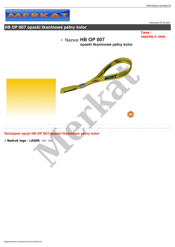 Informacje o produkcie Utworzono 07-03-2017 HB OP 007 opaski tkaninowe pełny kolor er ka t Cena : zapytaj o cenę Dostępne opcje HB OP 007 opaski tkaninowe pełny kolor M » Nadruk logo - LASER: NIE, TAK. Wygenerowano w programie www.oscGold.com