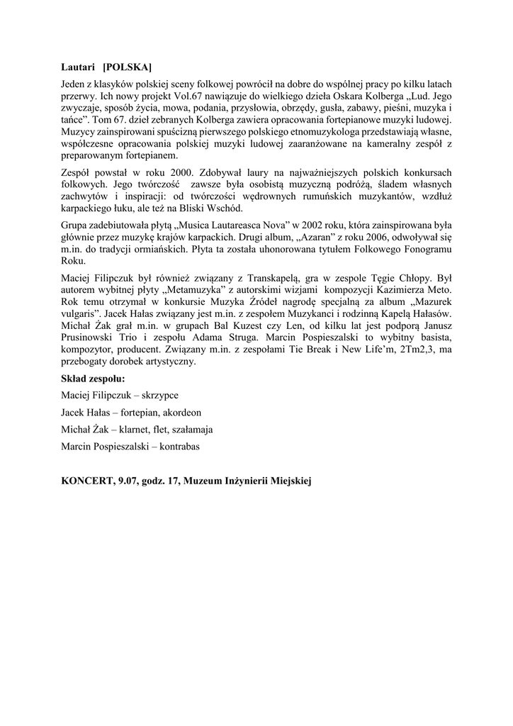 Lautari [POLSKA] Jeden z klasyków polskiej sceny folkowej powrócił na dobre do wspólnej pracy po kilku latach przerwy. Ich nowy projekt Vol.67 nawiązuje do wielkiego dzieła Oskara Kolberga „Lud. Jego zwyczaje, sposób życia, mowa, podania, przysłowia, obrzędy, gusła, zabawy, pieśni, muzyka i tańce”. Tom 67. dzieł zebranych Kolberga zawiera opracowania fortepianowe muzyki ludowej. Muzycy zainspirowani spuścizną pierwszego polskiego etnomuzykologa przedstawiają własne, współczesne opracowania polskiej muzyki ludowej zaaranżowane na kameralny zespół z preparowanym fortepianem. Zespół powstał w roku 2000. Zdobywał laury na najważniejszych polskich konkursach folkowych. Jego twórczość zawsze była osobistą muzyczną podróżą, śladem własnych zachwytów i inspiracji: od twórczości wędrownych rumuńskich muzykantów, wzdłuż karpackiego łuku, ale też na Bliski Wschód. Grupa zadebiutowała płytą „Musica Lautareasca Nova” w 2002 roku, która zainspirowana była głównie przez muzykę krajów karpackich. Drugi album, „Azaran” z roku 2006, odwoływał się m.in. do tradycji ormiańskich. Płyta ta została uhonorowana tytułem Folkowego Fonogramu Roku. Maciej Filipczuk był również związany z Transkapelą, gra w zespole Tęgie Chłopy. Był autorem wybitnej płyty „Metamuzyka” z autorskimi wizjami kompozycji Kazimierza Meto. Rok temu otrzymał w konkursie Muzyka Źródeł nagrodę specjalną za album „Mazurek vulgaris”. Jacek Hałas związany jest m.in. z zespołem Muzykanci i rodzinną Kapelą Hałasów. Michał Żak grał m.in. w grupach Bal Kuzest czy Len, od kilku lat jest podporą Janusz Prusinowski Trio i zespołu Adama Struga. Marcin Pospieszalski to wybitny basista, kompozytor, producent. Związany m.in. z zespołami Tie Break i New Life’m, 2Tm2,3, ma przebogaty dorobek artystyczny. Skład zespołu: Maciej Filipczuk – skrzypce Jacek Hałas – fortepian, akordeon Michał Żak – klarnet, flet, szałamaja Marcin Pospieszalski – kontrabas KONCERT, 9.07, godz. 17, Muzeum Inżynierii Miejskiej