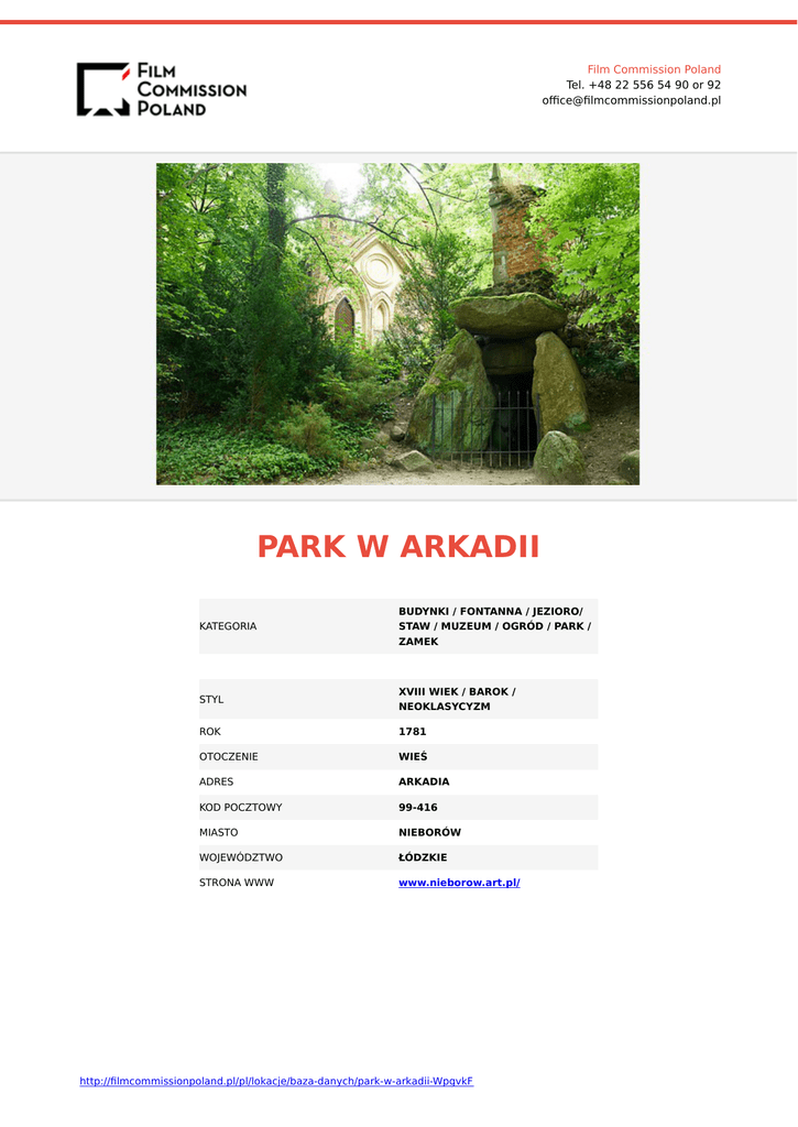 Film Commission Poland Tel. +48 22 556 54 90 or 92 office@filmcommissionpoland.pl PARK W ARKADII KATEGORIA BUDYNKI / FONTANNA / JEZIORO/ STAW / MUZEUM / OGRÓD / PARK / ZAMEK STYL XVIII WIEK / BAROK / NEOKLASYCYZM ROK 1781 OTOCZENIE WIEŚ ADRES ARKADIA KOD POCZTOWY 99-416 MIASTO NIEBORÓW WOJEWÓDZTWO ŁÓDZKIE STRONA WWW www.nieborow.art.pl/ http://filmcommissionpoland.pl/pl/lokacje/baza-danych/park-w-arkadii-WpgvkF Film Commission Poland Tel. +48 22 556 54 90 or 92 office@filmcommissionpoland.pl O LOKACJI Arkadia Park - Arkadia – wieś położona niedaleko Łowicza, w województwie łódzkim, w powiecie łowickim, w gminie Nieborów nad rzeką Skierniewką. W Arkadii mieści się ogród romantyczny w stylu angielskim założony przez Helenę z Przeździeckich, żonę Michała Hieronima Radziwiłła właściciela pobliskiego Nieborowa. Budowle powstałe w parku to między innymi: Grota Sybilli Domek Gotycki Łuk Kamienny (Łuk Grecki) Dom Murgrabiego Świątynia Diany (z plafonem J.P. Norblina Jutrzenka) Akwedukt Przybytek Arcykapłana (z płaskorzeźbą G. Staggi Nadzieja karmiąca Chimerę) Mur z Hermami Cyrk Przez park przepływa rzeczka Skierniewka, która tworzy staw z dwoma wyspami. Helena Radziwiłłowa zgromadziła w Arkadii bogatą kolekcję sztuki antycznej oraz rzeźb antykizujących i kopii dzieł antycznych, a także ,,starożytności'' średniowiecznych i renesansowych, z których utworzyła muzeum w Świątyni Diany.W 1945 Park w Arkadii wraz z pobliskim zespołem parkowopałacowym w Nieborowie stały się oddziałem Muzeum Narodowego w Warszawie. http://filmcommissionpoland.pl/pl/lokacje/baza-danych/park-w-arkadii-WpgvkF
