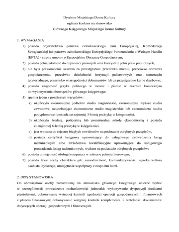 Dyrektor Miejskiego Domu Kultury ogłasza konkurs na stanowisko Głównego Księgowego Miejskiego Domu Kultury 1. WYMAGANIA 1) posiada obywatelstwo państwa członkowskiego Unii Europejskiej, Konfederacji Szwajcarskiej lub państwa członkowskiego Europejskiego Porozumienia o Wolnym Handlu (EFTA) - strony umowy o Europejskim Obszarze Gospodarczym; 2) posiada pełną zdolność do czynności prawnych oraz korzysta z pełni praw publicznych; 3) nie była prawomocnie skazana za przestępstwa: przeciwko mieniu, przeciwko obrotowi gospodarczemu, przeciwko działalności instytucji państwowych oraz samorządu terytorialnego, przeciwko wiarygodności dokumentów lub za przestępstwo karne skarbowe; 4) posiada znajomość języka polskiego w mowie i piśmie w zakresie koniecznym do wykonywania obowiązków głównego księgowego; 5) spełnia jeden z poniższych warunków: a) ukończyła ekonomiczne jednolite studia magisterskie, ekonomiczne wyższe studia zawodowe, uzupełniające ekonomiczne studia magisterskie lub ekonomiczne studia podyplomowe i posiada co najmniej 3-letnią praktykę w księgowości, b) ukończyła średnią, policealną lub pomaturalną szkołę ekonomiczną i posiada co najmniej 6-letnią praktykę w księgowości, c) jest wpisana do rejestru biegłych rewidentów na podstawie odrębnych przepisów, d) posiada certyfikat księgowy uprawniający do usługowego prowadzenia ksiąg rachunkowych albo świadectwo kwalifikacyjne uprawniające do usługowego prowadzenia ksiąg rachunkowych, wydane na podstawie odrębnych przepisów; 6) posiada umiejętność obsługi komputera w zakresie pakietu biurowego; 7) posiada takie cechy charakteru jak: samodzielność, komunikatywność, wysoka kultura osobista, dyskrecja, umiejętność współpracy z zespołem ludzi. 2. OPIS STANOWISKA Do obowiązków osoby zatrudnionej na stanowisku głównego księgowego należeć będzie w szczególności: prowadzenie rachunkowości jednostki; wykonywanie dyspozycji środkami pieniężnymi; dokonywanie wstępnej kontroli zgodności operacji gospodarczych i finansowych z planem finansowym; dokonywanie wstępnej kontroli kompletności i rzetelności dokumentów dotyczących operacji gospodarczych i finansowych. 3. OFERTA Wyłonionej w drodze konkursu osobie, po zatrudnieniu na okres próbny zaoferowana będzie umowa na czas nieokreślony w pełnym wymiarze czasu pracy z wynagrodzeniem wynikającym z rozporządzenia Ministra Kultury i Dziedzictwa Narodowego z dnia 3 października 2012 r. w sprawie wynagradzania pracowników instytucji kultury (Dz. U. z 2012 r. Poz. 1105 ). 4. WYMAGANE DOKUMENTY Osoby ubiegające się o zatrudnienie powinny złożyć w Miejskim Domu Kultury w Lublińcu przy ul. Plebiscytowej 9 lub przesłać pocztą oferty pracy zawierające niżej wymienione dokumenty w zamkniętej kopercie z dopiskiem „konkurs”, do dnia 20 listopada 2015 r. 1) podanie o przyjęcie do pracy wraz z nr telefonu, 2) życiorys ze szczególnym uwzględnieniem praktyki zawodowej, 3) kserokopię dokumentu potwierdzającego posiadanie wymaganego obywatelstwa, 4) kserokopię dokumentów potwierdzających posiadane wykształcenie i doświadczenie, 5) własnoręcznie podpisane oświadczenie o posiadaniu pełnej zdolności do czynności prawnych oraz o korzystaniu z pełni praw publicznych, 6) własnoręcznie podpisane oświadczenie o tym, iż nie była prawomocnie skazana za przestępstwa, o których mowa w pkt 1.3 ogłoszenia. Oferta pracy powinna być opatrzona własnoręcznie podpisaną klauzulą o następującej treści: „Wyrażam zgodę na przetwarzanie moich danych osobowych zawartych w ofercie pracy, zgodnie z ustawą z dnia 29 sierpnia 1997 r. o ochronie danych osobowych (tekst jedn. Dz. U. z 2014 r. Poz. 1182 z późn. zm.)”. 5. KONKURS Po ocenie ofert pracy dalsze postępowanie konkursowe będzie przebiegało w formie rozmowy kwalifikacyjnej w trakcie której, między innymi, będzie sprawdzana wiedza niezbędna do pracy na stanowisku, którego dotyczy konkurs oraz cele zawodowe.