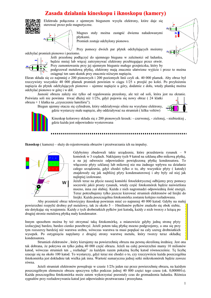 Zasada działania kineskopu i iknoskopu (kamery) Elektroda połączona z ujemnym biegunem wysyła elektrony, które daje się sterować przez pole magnetyczne. Magnes stały można zastąpić dwiema naładowanymi płytkami. Promień zostaje odchylony pionowo. Przy pomocy dwóch par płytek odchylających możemy odchylać promień pionowo i poziomo. Jeśli przesłonę podłączyć do ujemnego bieguna w zależności od ładunku, będzie mniej lub więcej zatrzymywać elektrony przebiegające przez otwór. Przy zamontowaniu przy jej ujemnym biegunie małego grzejniczka, który by podgrzewał metalową płytkę, elektrony mają znacznie ułatwione wyjście i przez to można osiągnąć ten sam skutek przy znacznie niższym napięciu. Ekran składa się co najmniej z 200 pionowych i 200 poziomych linii czyli ok. 40 000 plamek. Aby obraz był rzeczywisty wszystkie 40 000 plamek promień powinien w ciągu 1/25 s przejść po kolei. Po przyłożeniu napięcia do płytek odchylających pionowo – ujemne napięcie u góry, dodatnie z dołu, wtedy plamkę można odchylać pionowo w górę i w dół. Jasność obrazu zależy nie tylko od regulowania przesłony, ale też od soli, która jest na ekranie. Poświata soli nie powinna trwać dłużej niż 1/25s, gdyż pojawia się nowy obraz ( 24 klatki obrazu + 1 klatka na „czyszczenie lumiforu”). Biegun ujemny otacza się cylindrem, który oddziaływuje silnie na wysyłane elektrony, gdzie wystarczy małe napięcie, aby oddziaływać na strumień ( kilku voltów) Kineskop kolorowy składa się z 200 pionowych kresek: - czerwonej, - zielonej, - niebieskiej , gdzie każda jest odpowiednio wysterowana Iknoskop ( kamera) – służy do rejestrowania obrazów i przetwarzania ich na impulsy. Gdybyśmy zbudowali takie urządzenie, które przedstawia rysunek – 9 komórek w 3 rzędach. Naklejamy tych 9 katod na szklaną albo mikową płytkę, a na jej odwrocie odpowiednio powiększoną płytkę kondensatora. To włączenie płyty szklanej lub mikowej nie ma żadnego wpływu na działanie całego urządzenia, gdyż chodzi tylko o to, aby wszystkie płyty ( katody) znajdowały się jak najbliżej płyty kondensatorowej i aby były od niej jak najlepiej izolowane. Jeżeli teraz na płycie naszej komórki fotoelektrycznej odbijemy przy pomocy soczewki jakiś prosty rysunek, wtedy część fotokomórek będzie naświetlona mocno, inna zaś słabiej. Każda z nich nagromadzi odpowiednią ilość energii. Teraz potrzebujemy tylko jeszcze kierować strumień elektronów od linijki do linijki. Każda poszczególna fotokomórka zostanie kolejno rozładowana. Aby przenieść obraz telewizyjny iknoskop powinien mieć co najmniej 40 000 katod. Gdyby na małej powierzchni rozpylić drobny pył metalowy, tak że około 5 – 10milionów pyłków znalazło się obok siebie, nie dotykając się wzajemnie. Każdy z tych drobniutkich pyłków jest katodą, każdy z nich tworzy z leżącą po drugiej stronie metalową płytką mały kondensator. Innym sposobem można by też otrzymać taką fotokomórkę, a mianowicie gdyby jedną stronę płyty izolacyjnej bardzo, bardzo cienko posrebrzyć. Jeżeli potem taką płytkę mocno podgrzejemy, a ona się przy tym rozszerzy bardziej niż warstwa srebra, wówczas warstwa ta musi popękać na cały szereg drobniutkich wysepek. Po ostygnięciu napylamy z drugiej strony warstwę metalu, który tworzy teraz okładkę kondensatora. Strumień elektronów , który kierujemy na powierzchnię obrazu ma pewną określoną średnicę. Jest ona tak dobrana, że pokrywa on tylko jedną 40 000 część obrazu. Jeżeli na całej powierzchni mamy 10 milionów katod, wówczas strumień ten „ rozładuje” za każdym razem pokaźną liczbę katod równocześnie. Tę liczbę szacuje się na około 100 katod. To wystarczy, gdyż teraz nie chodzi o to, czy rzeczywiście każda poszczególna fotokomórka jest dokładnie tak wielka jak inna. Wartość sumaryczna jednej setki mikrokomórek będzie zawsze równa. Jeżeli strumień elektronów powędruje w czasie 1/25s jeden raz przez powierzchnię obrazu, na każdym poszczególnym elemencie obrazu spoczywa tylko podczas jednej 40 000 części tego czasu (ok. 0,000001s). Każda poszczególna fotokomórka może zatem wykorzystać pozostały czas do gromadzenia ładunku. Różnica sygnałów przy rozładowywaniu katod jest odpowiednio przetwarzana i przesyłana. 1
