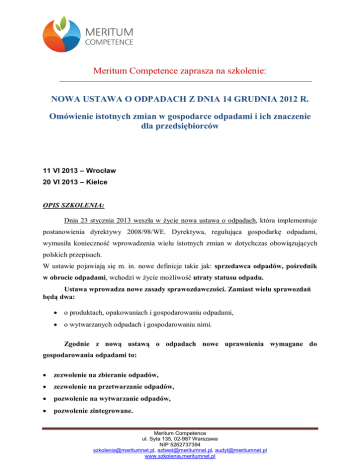 Meritum Competence zaprasza na szkolenie: NOWA USTAWA O ODPADACH Z DNIA 14 GRUDNIA 2012 R. Omówienie istotnych zmian w gospodarce odpadami i ich znaczenie dla przedsiębiorców 11 VI 2013 – Wrocław 20 VI 2013 – Kielce OPIS SZKOLENIA: Dnia 23 stycznia 2013 weszła w życie nowa ustawa o odpadach, która implementuje postanowienia dyrektywy 2008/98/WE. Dyrektywa, regulująca gospodarkę odpadami, wymusiła konieczność wprowadzenia wielu istotnych zmian w dotychczas obowiązujących polskich przepisach. W ustawie pojawiają się m. in. nowe definicje takie jak: sprzedawca odpadów, pośrednik w obrocie odpadami, wchodzi w życie możliwość utraty statusu odpadu. Ustawa wprowadza nowe zasady sprawozdawczości. Zamiast wielu sprawozdań będą dwa: o produktach, opakowaniach i gospodarowaniu odpadami, o wytwarzanych odpadach i gospodarowaniu nimi. Zgodnie z nową ustawą o odpadach nowe uprawnienia wymagane do gospodarowania odpadami to: zezwolenie na zbieranie odpadów, zezwolenie na przetwarzanie odpadów, pozwolenie na wytwarzanie odpadów, pozwolenie zintegrowane. Meritum Competence ul. Syta 135, 02-987 Warszawa NIP 5262737394 [email protected], [email protected], [email protected] www.szkolenia.meritumnet.pl Uchylone zostają: decyzje zatwierdzające program gospodarki odpadami niebezpiecznymi i decyzje zatwierdzające program gospodarki odpadami, wydane na podstawie ustawy z 2001 r. wygasają z dniem wejścia w życie ustawy, informacje o wytwarzanych odpadach i o sposobach gospodarowania wytworzonymi odpadami, złożone na podstawie przepisów dotychczasowych, tracą ważność z dniem wejścia w życie ustawy. Ponadto w terminie 24 miesięcy od dnia w życie ustawy przedsiębiorcy muszą wnioskować m. in. o nowe pozwolenia na przetwarzanie odpadów, wytwarzanie odpadów, zbieranie odpadów. PROGRAM SZKOLENIA: 10.00 Powitanie uczestników Omówienie wymagań prawnych wynikających z nowej ustawy o odpadach dotyczących wytwórców odpadów cz. 1. m.in.: 10:00 - 11:30 - definicja odpadu oraz klasyfikacja odpadów – praktyczne interpretacje oraz najczęstsze błędy, - jak w przedsiębiorstwie traktować odpady komunalne? - definicje: wytwórca odpadów, posiadacz odpadów, - podział odpowiedzialności w zakresie gospodarowania odpadami. 11:30 - 11:45 Przerwa kawowa Omówienie wymagań prawnych wynikających z nowej ustawy o odpadach dotyczących wytwórców odpadów cz. 2. 11:45 - 13:00 m.in.: - kiedy odpady można przekazywać przedsiębiorstwom a kiedy osobom fizycznym? - jakie decyzje, zgłoszenia, pozwolenia powinien uzyskać wytwórca odpadów? - jakie pozwolenia są przewidziane na zbieranie oraz transport odpadów? 13:00 - 14:00 Przerwa obiadowa Omówienie wymagań prawnych wynikających z nowej ustawy o odpadach dotyczących wytwórców odpadów cz. 3. m.in.: 14:00 - 15:00 - ewidencja odpadów - kto i jak powinien ją prowadzić? - kto podlega pod obowiązek sprawozdawczy dotyczący odpadów oraz jak poprawnie wypełnić formularz zbiorczego zestawienia? - jakie grożą kary za nieprzestrzeganie przepisów dotyczących odpadów? 15:00 - 15:15 Przerwa kawowa Omówienie najważniejszych zmian wprowadzonych nową ustawą o odpadach w porównaniu do poprzednio obowiązujących przepisów m.in.: 15:15 - 16:00 - nowe definicje, nowe wymagania, - rejestr przedsiębiorców, - nowy system kar za nieprzestrzegania przepisów, - ułatwienia w zakresie rozliczeń i prowadzenia dokumentacji. WYKŁADOWCA: Maciej Krzyczkowski - główny specjalista ds. ekozarządzania w Generalnej Dyrekcji Ochrony Środowiska. Ekspert w zakresie gospodarki odpadami oraz systemów zarządzania środowiskowego. Doktorant w Katedrze Znormalizowanych Systemów Zarządzania na Uniwersytecie Ekonomicznym w Poznaniu. Audytor i wykładowca zajmujący się doradztwem w ochronie środowiska. Autor publikacji poświęconych zagadnieniom gospodarki oraz kompleksowego zarządzania środowiskowego. odpadami LOKALIZACJA i TERMIN: 11 VI 2013 – Wrocław 20 VI 2013 – Kielce zajęcia we wszystkich lokalizacjach odbywają się w godzinach 10.00 - 16.00 (szczegółowe informacje o miejscu szkolenia otrzymają Państwo na kilka dni przed szkoleniem). KOSZT: 500 PLN netto (+ 23% VAT) za osobę; Dla instytucji zaświadczających, że szkolenie finansowane jest ze środków publicznych (w całości bądź minimum w 70%) zastosujemy stawkę VAT - "zwolniony". W KOSZT SZKOLENIA WCHODZĄ: Wykłady, Materiały szkoleniowe, Zaświadczenia uczestnictwa, Obiad, Serwis kawowy. Formularz zgłoszeniowy jest również dostępny na stronie internetowej pod adresem: www.szkolenia.meritumnet.pl w menu po lewej stronie, w zakładce: Szkolenia. Formularze zgłoszeniowe prosimy przesyłać e-mailem na adres: [email protected] lub faxem na numer: 0 22 203 40 29, tel. 728 956 434, 784 299 914 Zasady uczestnictwa: Fakturę VAT otrzymają Państwo w sposób zgodny z zaznaczonym wyborem na formularzu zgłoszeniowym. Wpłaty prosimy kierować na konto: Meritum Competence ul. Syta 135 02-987 Warszawa o numerze: 41103000190109853000352077 Przesłanie wypełnionego formularza jest równoznaczne z przyjęciem zobowiązania płatności. Rezygnacja ze szkolenia jest możliwa najpóźniej na 3 dni robocze przed datą rozpoczęcia szkolenia. W przypadku powiadomienia na mniej niż 3 dni robocze, Zleceniodawca ponosi pełne koszty szkolenia.
