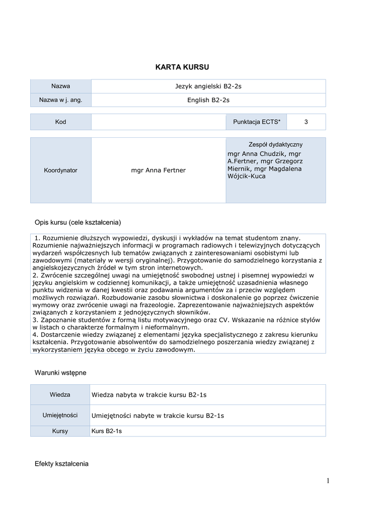 KARTA KURSU Nazwa Jezyk angielski B2-2s Nazwa w j. ang. English B2-2s Kod Punktacja ECTS* 3 Zespół dydaktyczny mgr Anna Fertner Koordynator mgr Anna Chudzik, mgr A.Fertner, mgr Grzegorz Miernik, mgr Magdalena Wójcik-Kuca Opis kursu (cele kształcenia) 1. Rozumienie dłuższych wypowiedzi, dyskusji i wykładów na temat studentom znany. Rozumienie najważniejszych informacji w programach radiowych i telewizyjnych dotyczących wydarzeń współczesnych lub tematów związanych z zainteresowaniami osobistymi lub zawodowymi (materiały w wersji oryginalnej). Przygotowanie do samodzielnego korzystania z angielskojezycznych źródeł w tym stron internetowych. 2. Zwrócenie szczególnej uwagi na umiejętność swobodnej ustnej i pisemnej wypowiedzi w języku angielskim w codziennej komunikacji, a także umiejętność uzasadnienia własnego punktu widzenia w danej kwestii oraz podawania argumentów za i przeciw względem możliwych rozwiązań. Rozbudowanie zasobu słownictwa i doskonalenie go poprzez ćwiczenie wymowy oraz zwrócenie uwagi na frazeologie. Zaprezentowanie najważniejszych aspektów związanych z korzystaniem z jednojęzycznych słowników. 3. Zapoznanie studentów z formą listu motywacyjnego oraz CV. Wskazanie na różnice stylów w listach o charakterze formalnym i nieformalnym. 4. Dostarczenie wiedzy związanej z elementami języka specjalistycznego z zakresu kierunku kształcenia. Przygotowanie absolwentów do samodzielnego poszerzania wiedzy związanej z wykorzystaniem języka obcego w życiu zawodowym. Warunki wstępne Wiedza Umiejętności Kursy Wiedza nabyta w trakcie kursu B2-1s Umiejętności nabyte w trakcie kursu B2-1s Kurs B2-1s Efekty kształcenia 1 Odniesienie do efektów kierunkowych Efekt kształcenia dla kursu W01, ... Wiedza Odniesienie do efektów kierunkowych Efekt kształcenia dla kursu U01 Student samodzielnie utworzy i wykorzysta formy wyrażające przyszłość, formy trybów warunkowych, czasowników modalnych oraz ‘gerund’/‘infinitive’. K_U01, K_U03 Umiejętności U02 Student posługuje się terminologią dotyczącą K_U01, K_U03 edukacji, uczuć i emocji, zachowań ludzkich, budowy ciała, muzyki i sztuki oraz form wypoczynku zarówno w mowie jak i w piśmie. U03 Student potrafi posługiwać się podstawowymi K_U01, K_U03, K_U21 sformułowaniami z zakresu języka specjalistycznego. Odniesienie do efektów kierunkowych Efekt kształcenia dla kursu Kompetencje społeczne Organizacja Forma zajęć Ćwiczenia w grupach Wykład (W) A K L S P E 2 Liczba godzin 40 Opis metod prowadzenia zajęć Konwersatorium: Metoda komunikacyjna Celem metody komunikacyjnej jest rozwiniecie umiejętności skutecznego i swobodnego porozumiewania się w języku obcym w sposób odpowiadający danym okolicznościom. Wykorzystywanie tej metody podczas zajęć ma na celu stworzenie różnorodnych sytuacji zbliżonych do komunikacji w życiu codziennym. Szczególnie istotne są ćwiczenia, w których uczestnicy odgrywają dialogi w parach, bądź prowadzą rozmowy w małych grupach. Metoda komunikacyjna promuje wykorzystywanie w trakcie zajęć autentycznych materiałów takich jak nagrania radiowe i telewizyjne oraz prasę. Materiały te mają przybliżyć uczących się do prawdziwych sytuacji z życia codziennego. Kryteria oceny x x x Rozmowa/ Wypowiedzi na określony temat InneInne1. Testy 2. Egzamin pisemny Egzamin ustny x x x Praca pisemna (esej) x x Referat Projekt indywidualny Praca laboratoryjna Zajęcia terenowe Ćwiczenia w szkole x Udział w dyskusji x x x x Projekt grupowy U01 U02 U03 Gry dydaktyczne E – learning Formy sprawdzania efektów kształcenia x x x Zaliczenie każdego z kursów odbywa się na podstawie oceny poszczególnych efektów kształcenia (E-nauczanie 5%, Gry dydaktyczne 5%, Projekt indywidualny 10%, Projekt grupowy 5%, Udział w dyskusji 25%, Praca pisemna (esej) 10%, Testy 15%, Rozmowa/ wypowiedź na określony temat 25%) Uwagi Treści merytoryczne (wykaz tematów) 3 Środowisko naturalne – zagrożenia wynikające z działalności człowieka, formy wyrażania przyszłości (2 godz.) Problemy społeczeństw we współczesnym świecie – praca z tekstem, ćwiczenia słownikowe (kolokacje) (3 godz.) Problemy społeczeństw we współczesnym świecie – dyskusja, time clauses (2 godz.) Systemy edukacji na świecie, okresy warunkowe 0/1 (2 godz.) Zachowania ludzkie w sytuacjach ekstremalnych – praca z tekstem (2 godz.) Uczucia i emocje, 2 okres warunkowy (2 godz.) Sztuka przetrwania – praca z tekstem, ćwiczenia fonetyczne (rytm zdania), 3 okres warunkowy (3 godz.) Problemy w komunikacji międzyludzkiej – dyskusja, czasowniki modalne – aspekt teraźniejszy (2 godz.) Zachowania ludzkie – praca z tekstem, czasowniki modalne – aspekt przeszły (3 godz.) Czasowniki o podobnej formie i różnym znaczeniu – ćwiczenia słownikowe (1 godz.) Ciało ludzkie – mimika, gesty (1 godz.) Język ciała – praca z tekstem, czasowniki zmysłów (2 godz.) Muzyka i jej wpływ na życie ludzkie – ćwiczenia słownikowe, dyskusja (2 godz.) Muzyka i sztuka – praca z tekstem, formy ‘gerund’/’infinitive’ (2 godz.) Wypoczynek – sposoby i preferencje (1 godz.) List formalny – podanie o prace (2 godz.) Powtórzenie materiału (4 godz.) Elementy języka specjalistycznego ( 4 godz.) Wykaz literatury podstawowej 1. Oxenden C., Latham-Koenig C., New English File Upper-Intermediate, OUP, Oxford 2008 2. Clanfield L., Benne R. R., Global Upper-Intermediate, Macmillan Education, Oxford 2011 3. Kay S., Jones V., New Inside Out Upper-Intermediate, Macmillan, 2009 4. Cotton D., Falvey D., Kent S., Language Leader Upper-Intermediate, Pearson Education Ltd, 2008 5. Eales F., Oakes S., Speakout Upper-Intermediate, Pearson, 2011 6. Acklam R., Crace A., Total English Upper-Intermediate, Longman, 2006 Wykaz literatury uzupełniającej 1. Murphy R., English Grammar in Use, CUP, Cambridge 1998. 2. Thomson A.J., Martinet A.V., A Practical English Gr