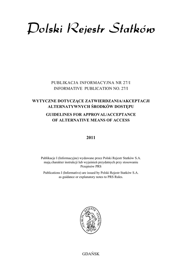 PUBLIKACJA INFORMACYJNA NR 27/I INFORMATIVE PUBLICATION NO. 27/I WYTYCZNE DOTYCZĄCE ZATWIERDZANIA/AKCEPTACJI ALTERNATYWNYCH ŚRODKÓW DOSTĘPU GUIDELINES FOR APPROVAL/ACCEPTANCE OF ALTERNATIVE MEANS OF ACCESS 2011 Publikacje I (Informacyjne) wydawane przez Polski Rejestr Statków S.A. mają charakter instrukcji lub wyjaśnień przydatnych przy stosowaniu Przepisów PRS Publications I (Informative) are issued by Polski Rejestr Statków S.A. as guidance or explanatory notes to PRS Rules. GDAŃSK PUBLIKACJA INFORMACYJNA NR 27/I INFORMATIVE PUBLICATION NO. 27/I WYTYCZNE DOTYCZĄCE ZATWIERDZANIA/AKCEPTACJI ALTERNATYWNYCH ŚRODKÓW DOSTĘPU GUIDELINES FOR APPROVAL/ACCEPTANCE OF ALTERNATIVE MEANS OF ACCESS 2011 GDAŃSK Publikacja Nr 27/I – Wytyczne dotyczące zatwierdzania/akceptacji alternatywnych środków dostępu – 2011, opierająca się na IACS Rec. No. 91 – Guidelines for Approval / Acceptance of Alternative Means of Access, Rev. 1 (Jan. 2011) oraz na IACS Rec. 78 – Safe Use of Portable Ladders for Close-up Surveys (Sep. 2002), została zatwierdzona przez Dyrektora Okrętowego Polskiego Rejestru Statków S.A. i wchodzi w życie z dniem 1 lipca 2011 r. Publication No. 27/I – Guidelines for Approval/Acceptance of Alternative Means of Access, 2011, based on IACS Rec. No. 91 – Guidelines for Approval / Acceptance of Alternative Means of Access, Rev. 1 (Jan. 2011) and IACS Rec. 78 – Safe Use of Portable Ladders for Close-up Surveys (Sep. 2002) was accepted by Director for Ship Division and enters into force on 1 July 2011. © Copyright by Polski Rejestr Statków S.A., 2011 PRS/AW, 06/2011 ISBN 978-83-7664-044-0 SPIS TREŚCI str. 1 2 3 4 Wstęp ........................................................................................................................... Określenia ................................................................................................................... Postanowienia ogólne ................................................................................................. Alternatywne środki dostępu .................................................................................... 4.1 Pojazd z wysięgnikiem hydraulicznym („cherry picker”) ................................... 4.2 Ruchomy podest roboczy .................................................................................... 4.3 Podesty przenośne ............................................................................................... 4.4 Rusztowanie ........................................................................................................ 4.5 Przeglądy wykonywane przy użyciu tratw lub łodzi ........................................... 4.6 Drabiny przenośne ............................................................................................... 4.7 Nowatorskie rozwiązania ..................................................................................... 5 5 6 7 7 8 9 11 12 15 18 CONTENTS page 1 2 3 4 Introduction ................................................................................................................ Definitions ................................................................................................................... General ........................................................................................................................ Alternative Means of Access ..................................................................................... 4.1 Hydraulic Arm Vehicles (“Cherry Picker”) ......................................................... 4.2 Wire Lift Platform ............................................................................................... 4.3 Portable Platforms ............................................................................................... 4.4 Staging ................................................................................................................. 4.5 Rafting ................................................................................................................. 4.6 Portable Ladders .................................................................................................. 4.7 Innovative Approach ........................................................................................... 21 21 22 23 23 24 25 26 27 30 32 1 WSTĘP Niniejsza Publikacja zawiera wytyczne dotyczące zatwierdzania lub akceptacji – tam, gdzie to ma zastosowanie – alternatywnych środków dostępu, które należy zapewnić na statkach zgodnie z wymaganiami prawidła II-1/3-6 z Konwencji SOLAS. Podręcznik dostępu do konstrukcji statku, zatwierdzony zgodnie z SOLAS II-1/3-6, powinien określać środki dostępu do konstrukcji statku – zarówno stałe, jak i alternatywne – niezbędne do przeprowadzania oględzin zewnętrznych i szczegółowych oraz pomiarów grubości elementów konstrukcyjnych statku. Postanowienia Publikacji dotyczą także środków dostępu używanych niezależnie albo łącznie ze stałymi środkami dostępu do rejonów, które zgodnie z wymaganiami SOLAS II-1/3-6 należy poddać przeglądowi oraz pomiarom grubości. 2 OKREŚLENIA Z a t w i e r d z e n i e – określenie to oznacza, że konstrukcja i materiały środków dostępu oraz ich zamocowania do konstrukcji statku powinny spełniać wymagania Administracji. W przypadku braku specjalnych wymagań ze strony Administracji, spełnienie wymagań niniejszej Publikacji będzie równoznaczne ze spełnieniem wymagań Administracji. A k c e p t a c j a – należy wykazać, w sposób zadowalający dla armatora, że środki dostępu dostarczone na statek były utrzymywane w należytym stanie technicznym i tam, gdzie to ma zastosowanie, są obsługiwane przez odpowiednio przeszkolonych operatorów. Powyższe należy wykazać inspektorom PRS przed użyciem urządzeń, w oparciu o dokumenty świadczące o należytym utrzymaniu urządzeń i informujące o ewentualnych ogranicze