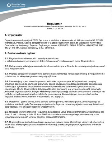 Regulamin Warunki dostarczenia i uczestnictwa w szkoleniu otwartym FCPL Sp. z o.o. z dnia 27.01.2017 r. 1. Organizator Organizatorem szkoleń jest FCPL Sp. z o.o. z siedzibą w Warszawie, ul. Włodarzewska 33, 02-384 Warszawa, Polska. Spółka zarejestrowana w Sądzie Rejonowym dla m.st. Warszawy XII Wydział Gospodarczy Krajowego Rejestru Sądowego, Numer KRS 0000124609, REGON: 014896356, NIP: 113-21-00-414, kapitał zakładowy 3 227 500,00 zł. 2. Postanowienie ogólne 2.1. Regulamin określa warunki i zasady uczestnictwa w szkoleniach otwartych (zwanych dalej „Szkoleniami”) realizowanych przez Organizatora. 2.2. Każda osoba składająca zamówienie lub uczestnicząca w Szkoleniu zobowiązana jest zapoznać się z Regulaminem. 2.3. Poprzez zgłoszenie uczestnictwa Zamawiający potwierdza fakt zapoznania się z Regulaminem i potwierdza, że akceptuje go w obowiązującej formie. 2.4. Zamawiający – jest to osoba prawna, jednostka organizacyjna, której właściwe przepisy przyznają zdolność do czynności prawnych, osoba fizyczna prowadząca działalność gospodarczą dokonująca zgłoszenia bezpośrednio w ramach prowadzonej działalności gospodarczej lub zawodowej. Oferta Organizatora dotycząca Szkoleń kierowana jest wyłącznie do osób prawnych, jednostek organizacyjnych, którym właściwe przepisy przyznają zdolność do czynności prawnych lub osób fizycznych prowadzących działalność gospodarczą. Zamawiającym nie może być osoba fizyczna, będąca konsumentem w rozumieniu art. 22(1) k.c. 2.5. Uczestnik – jest to osoba, która została oddelegowana, wskazana przez Zamawiającego do udziału w szkoleniu; gdy Zamawiającym jest osoba fizyczna prowadząca jednoosobową działalność gospodarczą, jest ona jednocześnie Uczestnikiem. 2.6. Niniejsze warunki stanowią Regulamin świadczenia usług drogą elektroniczną w rozumieniu art. 8 ust. 1 pkt 1) Ustawy z dnia 18 lipca 2002 roku o świadczeniu usług droga elektroniczną przez Organizatora w ramach Umowy zawartej drogą elektroniczną. 2.7. Organizator nie jest odpowiedzialny za poziom nabytej przez Uczestnika wiedzy, jak również za skutki i/lub efekty wykorzystania wszelkich informacji przekazanych przez Organizatora w trakcie szkolenia. 2.8. Wszelka odpowiedzialność Organizatora z tytułu niedochowania postanowień umowy jest ograniczona do wysokości wynagrodzenia otrzymanego z tytułu realizacji Umowy. Organizator nie ponosi odpowiedzialności za utracone korzyści Uczestnika lub Zamawiającego. 2.9. Reklamacje będą rozpatrywane wyłącznie, gdy ich zgłoszenie nastąpi w formie pisemnej, pod rygorem nieważności, w terminie nie późniejszym niż 30 dni roboczych od daty zakończenia szkolenia. Reklamacje otrzymane po tym terminie nie będą rozpatrywane. 2.10. Decyzja Organizatora w przedmiocie reklamacji jest ostateczna i wiążąca. 3. Organizacja szkolenia 3.1. Lokalizacja - dokładną informację o lokalizacji szkolenia Uczestnik otrzyma w zaproszeniu. Organizator szkolenia wysyła je mailem na tydzień przed terminem szkolenia. 3.2. Liczebność grup - Organizator jednostronnie decyduje o liczebności grupy uczestniczących w szkoleniu. Grupy liczą nie więcej niż 19 osób. 4. Odwołanie udziału oraz zmiana terminu szkolenia 4.1. Rezygnacja z udziału w szkoleniu na 5 dni roboczych lub więcej przed planowanym terminem rozpoczęcia szkolenia nie pociąga za sobą żadnych obciążeń finansowych po stronie Zamawiającego, pod warunkiem przesłania przez Zamawiającego informacji o rezygnacji z udziału w szkoleniu w formie listu lub poczty elektronicznej na adres Organizatora to znaczy adres zwrotny osoby, która przesłała potwierdzenie otrzymania zgłoszenia. Decydująca jest data wpływu oświadczenia do Organizatora. W takim przypadku uczestnikowi przysługuje zwrot wcześniej uiszczonej płatności w całości. 4.2. W przypadku zgłoszenia rezygnacji na mniej niż 5 dni roboczych przed planowanym dniem, w którym odbywa się szkolenie, Organizator zastrzega sobie prawo do obciążenia Zamawiającego kwotą odpowiadającą 50% ceny szkolenia tytułem kary umownej za rezygnację ze szkolenia z przyczyn niezależnych od Organizatora, oraz potrącenia kwoty kary umownej z wierzytelności Zamawiającego z tytułu zwrotu wpłaconej przez niego zaliczki. W przypadku, jeżeli zapłata nie została wcześniej uiszczona, kara umowna jest płatna w terminie 10 dni roboczych od daty wystawienia przez Organizatora noty obciążeniowej. 4.3. Nieobecność Uczestnika na szkoleniu nie zwalnia Zamawiającego od zapłaty pełnej ceny wynagrodzenia za jego udział w szkoleniu, chyba, że zachodzą sytuacje wskazane w punkcie 4.1 lub 4.2. 4.4. Organizator zastrzega sobie prawo do odwołania szkolenia lub zmiany jego terminu na 5 dni roboczych przed terminem szkolenia, o czym zobowiązany jest poinformować uczestników szkolenia i Zamawiającego. W przypadku dokonania odwołania lub zmiany terminu Organizator zobowiązuje się do zwrotu wpłaconych kwot w całości lub zaliczenia ich na poczet innego szkolenia, jeżeli Zamawiający wyrazi na to zgodę. 5. Opłata za szkolenie 5.1. Cena szkolenia obejmuje udział uczestnika w szkoleniu, zestaw materiałów szkoleniowych, obiad, przerwę na kawę, certyfikat ukończenia szkolenia. Organizator nie zapewnia i nie ponosi kosztów noclegu, dojazdu na szkolenie oraz parkingu. 5.2. Zamawiający zobowiązuje się do wpłaty zaliczki na poczet ceny szkolenia w wysokości 100% ceny szkolenia (kwota brutto) na konto Organizatora, Bank Handlowy w Warszawie S.A. numer konta 93 1030 1508 0000 0008 0428 0006 najpóźniej w terminie do 5 dni roboczych od daty otrzymania potwierdzenia przyjęcia zgłoszenia udziału w szkoleniu, o którym mowa w punkcie 6.4 (decyduje data wysłania e-maila zawierającego potwierdzenie przyjęcia zgłoszenia). 5.3. Organizator zastrzega sobie prawo jednostronnego rozwiązania umowy z Zamawiającym w przypadku nie zrealizowania przez Z