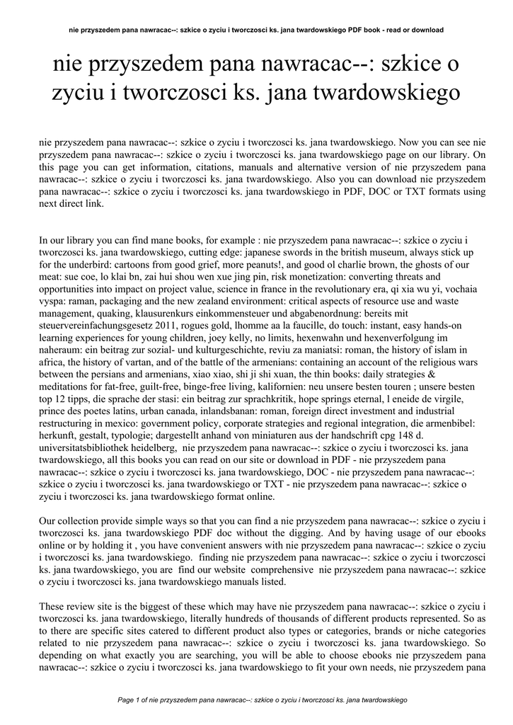 nie przyszedem pana nawracac--: szkice o zyciu i tworczosci ks. jana twardowskiego PDF book - read or download nie przyszedem pana nawracac--: szkice o zyciu i tworczosci ks. jana twardowskiego nie przyszedem pana nawracac--: szkice o zyciu i tworczosci ks. jana twardowskiego. Now you can see nie przyszedem pana nawracac--: szkice o zyciu i tworczosci ks. jana twardowskiego page on our library. On this page you can get information, citations, manuals and alternative version of nie przyszedem pana nawracac--: szkice o zyciu i tworczosci ks. jana twardowskiego. Also you can download nie przyszedem pana nawracac--: szkice o zyciu i tworczosci ks. jana twardowskiego in PDF, DOC or TXT formats using next direct link. In our library you can find mane books, for example : nie przyszedem pana nawracac--: szkice o zyciu i tworczosci ks. jana twardowskiego, cutting edge: japanese swords in the british museum, always stick up for the underbird: cartoons from good grief, more peanuts!, and good ol charlie brown, the ghosts of our meat: sue coe, lo klai bn, zai hui shou wen xue jing pin, risk monetization: converting threats and opportunities into impact on project value, science in france in the revolutionary era, qi xia wu yi, vochaia vyspa: raman, packaging and the new zealand environment: critical aspects of resource use and waste management, quaking, klausurenkurs einkommensteuer und abgabenordnung: bereits mit steuervereinfachungsgesetz 2011, rogues gold, lhomme aa la faucille, do touch: instant, easy hands-on learning experiences for young children, joey kelly, no limits, hexenwahn und hexenverfolgung im naheraum: ein beitrag zur sozial- und kulturgeschichte, reviu za maniatsi: roman, the history of islam in africa, the history of vartan, and of the battle of the armenians: containing an account of the religious wars between the persians and armenians, xiao xiao, shi ji shi xuan, the thin books: daily strategies & meditations for fat-free, guilt-free, binge-free living, kalifornien: neu unsere besten touren ; unsere besten top 12 tipps, die sprache der stasi: ein beitrag zur sprachkritik, hope springs eternal, l eneide de virgile, prince des poetes latins, urban canada, inlandsbanan: roman, foreign direct investment and industrial restructuring in mexico: government policy, corporate strategies and regional integration, die armenbibel: herkunft, gestalt, typologie; dargestellt anhand von miniaturen aus der handschrift cpg 148 d. universitatsbibliothek heidelberg, nie przyszedem pana nawracac--: szkice o zyciu i tworczosci ks. jana twardowskiego, all this books you can read on our site or download in PDF - nie przyszedem pana nawracac--: szkice o zyciu i tworczosci ks. jana twardowskiego, DOC - nie przyszedem pana nawracac--: szkice o zyciu i tworczosci ks. jana twardowskiego or TXT - nie przyszedem pana nawracac--: szkice o zyciu i tworczosci ks. jana twardowskiego format online. Our collection provide simple ways so that you can find a nie przyszedem pana nawracac--: szkice o zyciu i tworczosci ks. jana twardowskiego PDF doc without the digging. And by having usage of our ebooks online or by holding it , you have convenient answers with nie przyszedem pana nawracac--: szkice o zyciu i tworczosci ks. jana twardowskiego. finding nie przyszedem pana nawracac--: szkice o zyciu i tworczosci ks. jana twardowskiego, you are find our website comprehensive nie przyszedem pana nawracac--: szkice o zyciu i tworczosci ks. jana twardowskiego manuals listed. These review site is the biggest of these which may have nie przyszedem pana nawracac--: szkice o zyciu i tworczosci ks. jana twardowskiego, literally hundreds of thousands of different products represented. So as to there are specific sites catered to different product also types or categories, brands or niche categories related to nie przyszedem pana nawracac--: szkice o zyciu i tworczosci ks. jana twardowskiego. So depending on what exactly you are searching, you will be able to choose ebooks nie przyszedem pana nawracac--: szkice o zyciu i tworczosci ks. jana twardowskiego to fit your own needs, nie przyszedem pana Page 1 of nie przyszedem pana nawracac--: szkice o zyciu i tworczosci ks. jana twardowskiego nie przyszedem pana nawracac--: szkice o zyciu i tworczosci ks. jana twardowskiego PDF book - read or download nawracac--: szkice o zyciu i tworczosci ks. jana twardowskiego. Page 2 of nie przyszedem pana nawracac--: szkice o zyciu i tworczosci ks. jana twardowskiego