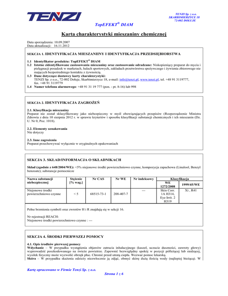TENZI Sp. z o.o. SKARBIMIERZYCE 18 72-002 DOŁUJE TopEFEKT® DIAM Karta charakterystyki mieszaniny chemicznej Data sporządzenia: 10.09.2007 Data aktualizacji: 16.11.2012 SEKCJA 1. IDENTYFIKACJA MIESZANIINY I IDENTYFIKACJA PRZEDSIĘBIORSTWA 1.1 Identyfikator produktu: TopEFEKT® DIAM 1.2 Istotne zidentyfikowane zastosowania mieszaniny oraz zastosowanie odradzane: Niskopieniący preparat do mycia i pielęgnacji posadzek w marketach, halach sportowych, zakładach przetwórstwa spożywczego i żywienia zbiorowego nie mających bezpośredniego kontaktu z żywnością. 1.3 Dane dotyczące dostawcy karty charakterystyki: TENZI Sp. z o.o., 72-002 Dołuje, Skarbimierzyce 18, e-mail: [email protected], www.tenzi.pl, tel. +48 91 3119777, fax. +48 91 3119779 1.4 Numer telefonu alarmowego: +48 91 31 19 777 (pon. - pt. 8-16) lub 998 SEKCJA 2. IDENTYFIKACJA ZAGROŻEŃ 2.1. Klasyfikacja mieszaniny Preparat nie został sklasyfikowany jako niebezpieczny w myśl obowiązujących przepisów (Rozporządzenie Ministra Zdrowia z dnia 10 sierpnia 2012 r. w sprawie kryteriów i sposobu klasyfikacji substancji chemicznych i ich mieszanin (Dz. U. Nr 0, Poz. 1018). 2.2. Elementy oznakowania Nie dotyczy 2.3. Inne zagrożenia Preparat przechowywać wyłącznie w oryginalnych opakowaniach SEKCJA 3. SKŁAD/INFORMACJA O SKŁADNIKACH Skład (zgodnie z 648/2004/WE): <5% niejonowe środki powierzchniowo czynne, kompozycja zapachowa (Linalool, Benzyl benzoate); substancje pomocnicze Nazwa substancji niebezpiecznej Niejonowe środki powierzchniowo czynne Stężenie [% wag.] Nr CAS Nr WE <5 68515-73-1 208-407-7 Nr indeksowy --- Klasyfikacja WE 1999/45/WE 1272/2008 Skin Corr. Xi , R41 1A H314, Eye Irrit. 2 H319 Pełne brzmienia symboli oraz zwrotów H i R znajdują się w sekcji 16. Nr rejestracji REACH: Niejonowe środki powierzchniowo czynne : --- SEKCJA 4. ŚRODKI PIERWSZEJ POMOCY 4.1. Opis środków pierwszej pomocy Wdychanie – W przypadku wystąpienia objawów zatrucia inhalacyjnego (kaszel, uczucie duszności, zawroty głowy) wyprowadzić poszkodowanego na świeże powietrze. Zapewnić bezwzględny spokój w pozycji półleżącej lub siedzącej, wysiłek fizyczny może wyzwolić obrzęk płuc. Chronić przed utratą ciepła. Wezwać pomoc lekarską. Skóra – W przypadku skażenia odzieży niezwłocznie ją zdjąć, obmyć skórę dużą ilością wody (najlepiej bieżącą). W Kartę opracowano w Firmie Tenzi Sp. z o.o. Strona 1 z 6 TopEFEKT® DIAM TENZI Sp. z o.o. SKARBIMIERZYCE 18 72-002 DOŁUJE przypadku wystąpienia zmian skórnych lub oparzeń skontaktować się z lekarzem. Oczy – Zanieczyszczone oczy przemyć dużą ilością chłodnej wody (co najmniej przez 15 minut) rozdzielając osobno powieki, skonsultować się z lekarzem specjalistą Spożycie – W przypadku spożycia nie wywoływać wymiotów. Podać do wypicia dużą ilość wody. Nie podawać środków zobojętniających. Niezwłocznie skonsultować się z lekarzem, jeżeli to możliwe pokazać etykietę. 4.2. Najważniejsze ostre i opóźnione objawy oraz skutki narażenia Wdychanie – nie powoduje podrażnień górnych dróg oddechowych Skóra – u osób ze skłonnością do alergii może spowodować podrażnienia skóry Oczy – w przypadku kontaktu może powodować podrażnienie Spożycie - w przypadku spożycia może spowodować podrażnienie błon śluzowych 4.3. Wskazania dotyczące wszelkiej natychmiastowej pomocy lekarskiej i szczególnego postępowania z poszkodowanym Wezwać pomoc medyczną. Na stanowisku pracy konieczny dostęp do świeżej wody oraz preparatów do przemywania oczu SEKCJA 5. POSTĘPOWANIE W PRZYPADKU POŻARU 5.1. Środki gaśnicze Odpowiednie środki gaśnicze: pożary w obecności preparatu gasić środkami gaśniczymi odpowiednimi do palącego się otoczenia. Niewłaściwe środki gaśnicze: nie są znane środki gaśnicze, których nie wolno stosować. 5.2. Szczególne zagrożenia związane z mieszaniną Preparat niepalny. 5.3. Informacje dla straży pożarnej Stosować środki izolujące drogi oddechowe i ubranie ochronne. W przypadku pożaru zawiadomić osoby znajdujące się w pobliżu o pożarze, usunąć z obszaru zagrożenia osoby postronne, powiadomić Straż Pożarną. Jeżeli to możliwe usunąć zbiorniki z preparatem z dala od działania ognia i wysokiej temperatury. Jeżeli to niemożliwe wówczas chłodzić zbiorniki znajdujące się w pobliżu ognia poprzez spryskiwanie strumieniem wody. Pozostałości po spaleniu muszą zostać całkowicie usunięte SEKCJA 6. POSTĘPOWANIE W PRZYPADKU NIEZAMIERZONEGO UWOLNIENIA DO ŚRODOWISKA 6.1. Indywidualne środki ostrożności, wyposażenie ochronne i procedury w sytuacjach awaryjnych Odzież ochronna; aparat izolujący drogi oddechowe; rękawice ochronne; okulary ochronne. Unikać bezpośredniego kontaktu ze skórą i oczami; zapewnić odpowiednią wentylację. 6.2. Środki ostrożności w zakresie ochrony środowiska Brak danych. 6.3. Metody i materiały zapobiegające rozprzestrzenianiu się skażenia i służące do usuwania skażenia W przypadku niezamierzonego uwolnienia się preparatu do środowiska powiadomić o awarii oraz usunąć źródła zapłonu. Zabezpieczyć studzienki ściekowe poprzez ich obwałowanie, nie dopuścić do przedostania się preparatu do wód powierzchniowych i gruntowych; unikać bezpośredniego kontaktu z uwalniającą się substancją. O ile to możliwe zlikwidować wyciek (zamknąć dopływ cieczy, uszczelnić, uszkodzone opakowanie umieścić w szczelnym opakowaniu ochronnym). Podczas dużego wycieku miejsce gromadzenia się cieczy obwałować, zebraną ciecz odpompować. Małe ilości rozlanego preparatu posypać niepalnym materiałem chłonnym (piasek, ziemia, trociny, ziemia okrzemkowa, zmielony wapień), a następnie umieścić w oznakowanym, zamykanym pojemniku – przekazać do utylizacji. Zanieczyszczoną powierzchnię spłukać wodą. 6.4. Odniesienia do innych sekcji Patrz sekcja 8 i 13 SEKCJA 7. POSTĘPOWANIE Z MIE