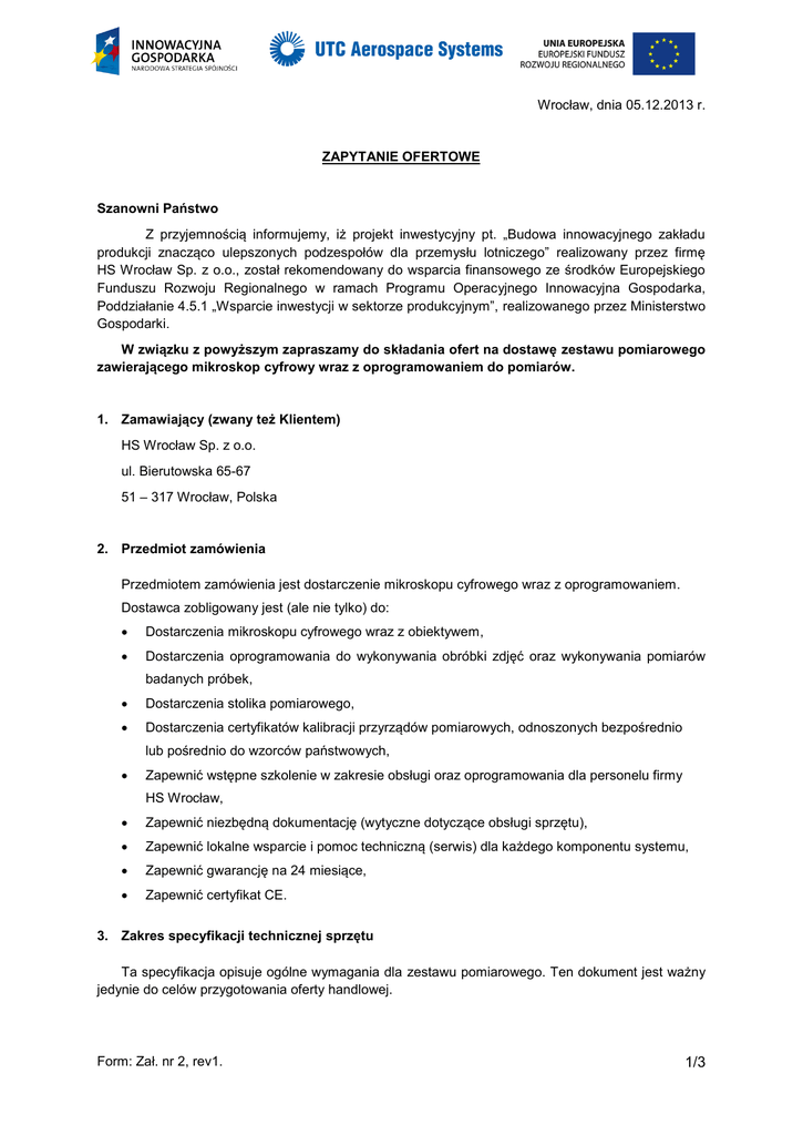 Form: Zał. nr 2, rev1. Wrocław, dnia 05.12.2013 r. ZAPYTANIE
