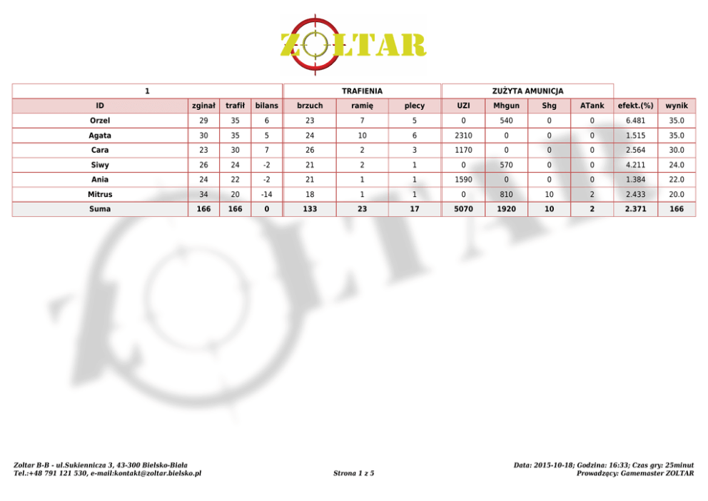 1 TRAFIENIA ZUŻYTA AMUNICJA ID zginał trafił bilans brzuch ramię plecy UZI Mhgun Shg ATank efekt.(%) wynik Orzel 29 35 6 23 7 5 0 540 0 0 6.481 35.0 Agata 30 35 5 24 10 6 2310 0 0 0 1.515 35.0 Cara 23 30 7 26 2 3 1170 0 0 0 2.564 30.0 Siwy 26 24 -2 21 2 1 0 570 0 0 4.211 24.0 Ania 24 22 -2 21 1 1 1590 0 0 0 1.384 22.0 Mitrus 34 20 -14 18 1 1 0 810 10 2 2.433 20.0 Suma 166 166 0 133 23 17 5070 1920 10 2 2.371 166 Zoltar B-B - ul.Sukiennicza 3, 43-300 Bielsko-Biała Tel.:+48 791 121 530, e-mail:[email protected] Strona 1 z 5 Data: 2015-10-18; Godzina: 16:33; Czas gry: 25minut Prowadzący: Gamemaster ZOLTAR Team 1 TRAFIENIA ZUŻYTA AMUNICJA ID zginał trafił bilans brzuch ramię plecy UZI D-D Mhgun Shg efekt.(%) wynik Orzel 25 34 9 26 6 2 0 0 840 2 4.038 34.0 Siwy 29 29 0 22 2 5 0 0 1080 0 2.685 29.0 Mitrus 21 20 -1 13 3 4 0 0 1860 0 1.075 20.0 Suma 75 83 8 61 11 11 0 0 3780 2 2.195 83 2 TRAFIENIA ZUŻYTA AMUNICJA ID zginał trafił bilans brzuch ramię plecy UZI D-D Mhgun Shg efekt.(%) wynik Agata 37 33 -4 31 6 0 2520 2 0 0 1.308 33.0 Ania 23 22 -1 19 0 3 2130 0 0 0 1.033 22.0 Cara 23 20 -3 13 5 2 1590 0 0 0 1.258 20.0 Suma 83 75 -8 63 11 5 6240 2 0 0 1.202 75 Zoltar B-B - ul.Sukiennicza 3, 43-300 Bielsko-Biała Tel.:+48 791 121 530, e-mail:[email protected] Team 1 2 83 75 Strona 2 z 5 Data: 2015-10-18; Godzina: 17:03; Czas gry: 25minut Prowadzący: Gamemaster ZOLTAR Drużyny Miejsce Zoltar B-B - ul.Sukiennicza 3, 43-300 Bielsko-Biała Tel.:+48 791 121 530, e-mail:[email protected] Rozgrywki Nazwa 1 2 Suma Team 1 - 83 83 2 - 75 75 Strona 3 z 5 Data: 2015-10-18 Prowadzący: Gamemaster ZOLTAR Zestawienie wg wyniku Miejsce TRAFIENIA ZUŻYTA AMUNICJA ID zginał trafił bilans brzuch ramię plecy UZI D-D Mhgun Shg aTank efekt.(%) wynik Orzel 64.80 82.80 18.00 58.80 15.60 8.40 0.00 0.00 1656.00 2.40 0.00 4.993 82.80 Agata 80.40 81.60 1.20 66.00 19.20 7.20 5796.00 2.40 0.00 0.00 0.00 1.407 81.60 Siwy 66.00 63.60 -2.40 51.60 4.80 7.20 0.00 0.00 1980.00 0.00 0.00 3.212 63.60 4 Cara 55.20 60.00 4.80 46.80 8.40 6.00 3312.00 0.00 0.00 0.00 0.00 1.812 60.00 5 Ania 56.40 52.80 -3.60 48.00 1.20 4.80 4464.00 0.00 0.00 0.00 0.00 1.183 52.80 6 Mitrus 66.00 48.00 -18.00 37.20 4.80 6.00 0.00 0.00 3204.00 12.00 2.40 1.491 48.00 Zestawienie wg bilansu Miejsce TRAFIENIA ZUŻYTA AMUNICJA ID zginał trafił bilans brzuch ramię plecy UZI D-D Mhgun Shg aTank efekt.(%) wynik Orzel 64.80 82.80 18.00 58.80 15.60 8.40 0.00 0.00 1656.00 2.40 0.00 4.993 82.80 Cara 55.20 60.00 4.80 46.80 8.40 6.00 3312.00 0.00 0.00 0.00 0.00 1.812 60.00 Agata 80.40 81.60 1.20 66.00 19.20 7.20 5796.00 2.40 0.00 0.00 0.00 1.407 81.60 4 Siwy 66.00 63.60 -2.40 51.60 4.80 7.20 0.00 0.00 1980.00 0.00 0.00 3.212 63.60 5 Ania 56.40 52.80 -3.60 48.00 1.20 4.80 4464.00 0.00 0.00 0.00 0.00 1.183 52.80 6 Mitrus 66.00 48.00 -18.00 37.20 4.80 6.00 0.00 0.00 3204.00 12.00 2.40 1.491 48.00 Zoltar B-B - ul.Sukiennicza 3, 43-300 Bielsko-Biała Tel.:+48 791 121 530, e-mail:[email protected] Strona 4 z 5 Data: 2015-10-18 Prowadzący: Gamemaster ZOLTAR Zestawienie wg efektywności Miejsce TRAFIENIA ZUŻYTA AMUNICJA ID zginał trafił bilans brzuch ramię plecy UZI D-D Mhgun Shg aTank efekt.(%) wynik Orzel 64.80 82.80 18.00 58.80 15.60 8.40 0.00 0.00 1656.00 2.40 0.00 4.993 82.80 Siwy 66.00 63.60 -2.40 51.60 4.80 7.20 0.00 0.00 1980.00 0.00 0.00 3.212 63.60 Cara 55.20 60.00 4.80 46.80 8.40 6.00 3312.00 0.00 0.00 0.00 0.00 1.812 60.00 4 Mitrus 66.00 48.00 -18.00 37.20 4.80 6.00 0.00 0.00 3204.00 12.00 2.40 1.491 48.00 5 Agata 80.40 81.60 1.20 66.00 19.20 7.20 5796.00 2.40 0.00 0.00 0.00 1.407 81.60 6 Ania 56.40 52.80 -3.60 48.00 1.20 4.80 4464.00 0.00 0.00 0.00 0.00 1.183 52.80 Zoltar B-B - ul.Sukiennicza 3, 43-300 Bielsko-Biała Tel.:+48 791 121 530, e-mail:[email protected] Strona 5 z 5 Data: 2015-10-18 Prowadzący: Gamemaster ZOLTAR