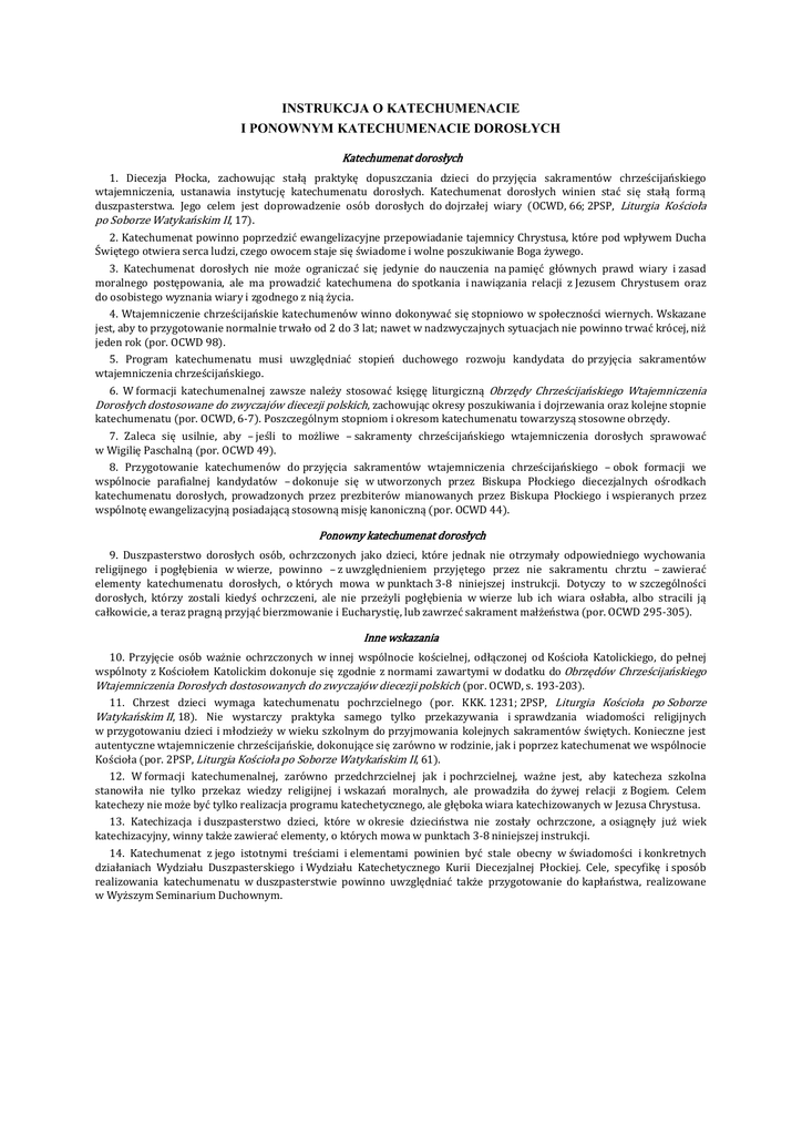 INSTRUKCJA O KATECHUMENACIE I PONOWNYM KATECHUMENACIE DOROSŁYCH Katechumenat dorosłych 1. Diecezja Płocka, zachowując stałą praktykę dopuszczania dzieci do przyjęcia sakramentów chrześcijańskiego wtajemniczenia, ustanawia instytucję katechumenatu dorosłych. Katechumenat dorosłych winien stać się stałą formą duszpasterstwa. Jego celem jest doprowadzenie osób dorosłych do dojrzałej wiary (OCWD, 66; 2PSP, Liturgia Kościoła po Soborze Watykańskim II, 17). 2. Katechumenat powinno poprzedzić ewangelizacyjne przepowiadanie tajemnicy Chrystusa, które pod wpływem Ducha Świętego otwiera serca ludzi, czego owocem staje się świadome i wolne poszukiwanie Boga żywego. 3. Katechumenat dorosłych nie może ograniczać się jedynie do nauczenia na pamięć głównych prawd wiary i zasad moralnego postępowania, ale ma prowadzić katechumena do spotkania i nawiązania relacji z Jezusem Chrystusem oraz do osobistego wyznania wiary i zgodnego z nią życia. 4. Wtajemniczenie chrześcijańskie katechumenów winno dokonywać się stopniowo w społeczności wiernych. Wskazane jest, aby to przygotowanie normalnie trwało od 2 do 3 lat; nawet w nadzwyczajnych sytuacjach nie powinno trwać krócej, niż jeden rok (por. OCWD 98). 5. Program katechumenatu musi uwzględniać stopień duchowego rozwoju kandydata do przyjęcia sakramentów wtajemniczenia chrześcijańskiego. 6. W formacji katechumenalnej zawsze należy stosować księgę liturgiczną Obrzędy Chrześcijańskiego Wtajemniczenia Dorosłych dostosowane do zwyczajów diecezji polskich, zachowując okresy poszukiwania i dojrzewania oraz kolejne stopnie katechumenatu (por. OCWD, 6-7). Poszczególnym stopniom i okresom katechumenatu towarzyszą stosowne obrzędy. 7. Zaleca się usilnie, aby – jeśli to możliwe – sakramenty chrześcijańskiego wtajemniczenia dorosłych sprawować w Wigilię Paschalną (por. OCWD 49). 8. Przygotowanie katechumenów do przyjęcia sakramentów wtajemniczenia chrześcijańskiego – obok formacji we wspólnocie parafialnej kandydatów – dokonuje się w utworzonych przez Biskupa Płockiego diecezjalnych ośrodkach katechumenatu dorosłych, prowadzonych przez prezbiterów mianowanych przez Biskupa Płockiego i wspieranych przez wspólnotę ewangelizacyjną posiadającą stosowną misję kanoniczną (por. OCWD 44). Ponowny katechumenat dorosłych 9. Duszpasterstwo dorosłych osób, ochrzczonych jako dzieci, które jednak nie otrzymały odpowiedniego wychowania religijnego i pogłębienia w wierze, powinno – z uwzględnieniem przyjętego przez nie sakramentu chrztu – zawierać elementy katechumenatu dorosłych, o których mowa w punktach 3-8 niniejszej instrukcji. Dotyczy to w szczególności dorosłych, którzy zostali kiedyś ochrzczeni, ale nie przeżyli pogłębienia w wierze lub ich wiara osłabła, albo stracili ją całkowicie, a teraz pragną przyjąć bierzmowanie i Eucharystię, lub zawrzeć sakrament małżeństwa (por. OCWD 295-305). Inne wskazania 10. Przyjęcie osób ważnie ochrzczonych w innej wspólnocie kościelnej, odłączonej od Kościoła Katolickiego, do pełnej wspólnoty z Kościołem Katolickim dokonuje się zgodnie z normami zawartymi w dodatku do Obrzędów Chrześcijańskiego Wtajemniczenia Dorosłych dostosowanych do zwyczajów diecezji polskich (por. OCWD, s. 193-203). 11. Chrzest dzieci wymaga katechumenatu pochrzcielnego (por. KKK. 1231; 2PSP, Liturgia Kościoła po Soborze Watykańskim II, 18). Nie wystarczy praktyka samego tylko przekazywania i sprawdzania wiadomości religijnych w przygotowaniu dzieci i młodzieży w wieku szkolnym do przyjmowania kolejnych sakramentów świętych. Konieczne jest autentyczne wtajemniczenie chrześcijańskie, dokonujące się zarówno w rodzinie, jak i poprzez katechumenat we wspólnocie Kościoła (por. 2PSP, Liturgia Kościoła po Soborze Watykańskim II, 61). 12. W formacji katechumenalnej, zarówno przedchrzcielnej jak i pochrzcielnej, ważne jest, aby katecheza szkolna stanowiła nie tylko przekaz wiedzy religijnej i wskazań moralnych, ale prowadziła do żywej relacji z Bogiem. Celem katechezy nie może być tylko realizacja programu katechetycznego, ale głęboka wiara katechizowanych w Jezusa Chrystusa. 13. Katechizacja i duszpasterstwo dzieci, które w okresie dzieciństwa nie zostały ochrzczone, a osiągnęły już wiek katechizacyjny, winny także zawierać elementy, o których mowa w punktach 3-8 niniejszej instrukcji. 14. Katechumenat z jego istotnymi treściami i elementami powinien być stale obecny w świadomości i konkretnych działaniach Wydziału Duszpasterskiego i Wydziału Katechetycznego Kurii Diecezjalnej Płockiej. Cele, specyfikę i sposób realizowania katechumenatu w duszpasterstwie powinno uwzględniać także przygotowanie do kapłaństwa, realizowane w Wyższym Seminarium Duchownym.