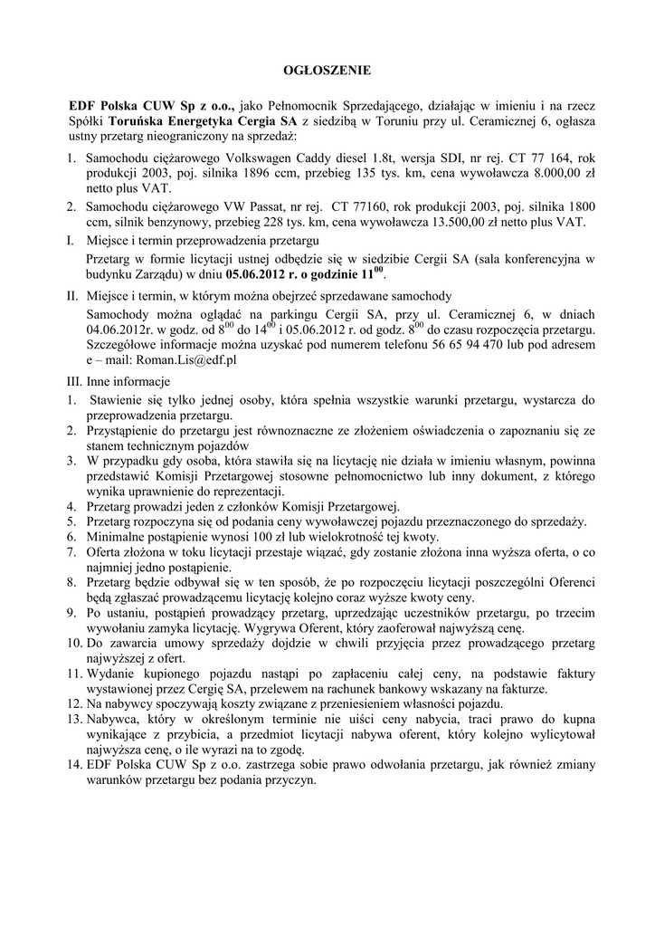 OGŁOSZENIE EDF Polska CUW Sp z o.o., jako Pełnomocnik Sprzedającego, działając w imieniu i na rzecz Spółki Toruńska Energetyka Cergia SA z siedzibą w Toruniu przy ul. Ceramicznej 6, ogłasza ustny przetarg nieograniczony na sprzedaż: 1. Samochodu ciężarowego Volkswagen Caddy diesel 1.8t, wersja SDI, nr rej. CT 77 164, rok produkcji 2003, poj. silnika 1896 ccm, przebieg 135 tys. km, cena wywoławcza 8.000,00 zł netto plus VAT. 2. Samochodu ciężarowego VW Passat, nr rej. CT 77160, rok produkcji 2003, poj. silnika 1800 ccm, silnik benzynowy, przebieg 228 tys. km, cena wywoławcza 13.500,00 zł netto plus VAT. I. Miejsce i termin przeprowadzenia przetargu Przetarg w formie licytacji ustnej odbędzie się w siedzibie Cergii SA (sala konferencyjna w budynku Zarządu) w dniu 05.06.2012 r. o godzinie 1100. II. Miejsce i termin, w którym można obejrzeć sprzedawane samochody Samochody można oglądać na parkingu Cergii SA, przy ul. Ceramicznej 6, w dniach 04.06.2012r. w godz. od 800 do 1400 i 05.06.2012 r. od godz. 800 do czasu rozpoczęcia przetargu. Szczegółowe informacje można uzyskać pod numerem telefonu 56 65 94 470 lub pod adresem e – mail: [email protected] III. Inne informacje 1. Stawienie się tylko jednej osoby, która spełnia wszystkie warunki przetargu, wystarcza do przeprowadzenia przetargu. 2. Przystąpienie do przetargu jest równoznaczne ze złożeniem oświadczenia o zapoznaniu się ze stanem technicznym pojazdów 3. W przypadku gdy osoba, która stawiła się na licytację nie działa w imieniu własnym, powinna przedstawić Komisji Przetargowej stosowne pełnomocnictwo lub inny dokument, z którego wynika uprawnienie do reprezentacji. 4. Przetarg prowadzi jeden z członków Komisji Przetargowej. 5. Przetarg rozpoczyna się od podania ceny wywoławczej pojazdu przeznaczonego do sprzedaży. 6. Minimalne postąpienie wynosi 100 zł lub wielokrotność tej kwoty. 7. Oferta złożona w toku licytacji przestaje wiązać, gdy zostanie złożona inna wyższa oferta, o co najmniej jedno postąpienie. 8. Przetarg będzie odbywał się w ten sposób, że po rozpoczęciu licytacji poszczególni Oferenci będą zgłaszać prowadzącemu licytację kolejno coraz wyższe kwoty ceny. 9. Po ustaniu, postąpień prowadzący przetarg, uprzedzając uczestników przetargu, po trzecim wywołaniu zamyka licytację. Wygrywa Oferent, który zaoferował najwyższą cenę. 10. Do zawarcia umowy sprzedaży dojdzie w chwili przyjęcia przez prowadzącego przetarg najwyższej z ofert. 11. Wydanie kupionego pojazdu nastąpi po zapłaceniu całej ceny, na podstawie faktury wystawionej przez Cergię SA, przelewem na rachunek bankowy wskazany na fakturze. 12. Na nabywcy spoczywają koszty związane z przeniesieniem własności pojazdu. 13. Nabywca, który w określonym terminie nie uiści ceny nabycia, traci prawo do kupna wynikające z przybicia, a przedmiot licytacji nabywa oferent, który kolejno wylicytował najwyższa cenę, o ile wyrazi na to zgodę. 14. EDF Polska CUW Sp z o.o. zastrzega sobie prawo odwołania przetargu, jak również zmiany warunków przetargu bez podania przyczyn.