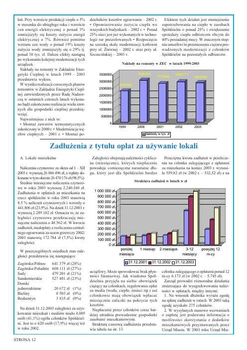 ³añ. Przy wzrocie produkcji ciep³a o 5% w stosunku do ubieg³ego roku i wzrocie cen energii elektrycznej o ponad 3% zmniejszy³y siê koszty zu¿ycia energii elektrycznej o 7%. Równie¿ pomimo wzrostu cen wody o ponad 19% koszty zu¿ycia wody zmniejszy³y siê o 29% tj. ponad 30 tys. z³. Dalsze efekty nast¹pi¹ po wykonaniu kolejnej modernizacji tych urz¹dzeñ. Nak³ady na remonty w Zak³adzie Energetyki Cieplnej w latach 1999 2003 przedstawia wykres. W wyniku realizacji corocznych planów remontów w Zak³adzie Energetyki Cieplnej zatwierdzonych przez Radê Nadzorcz¹ w ostatnich czterech latach wykonano b¹d zakoñczono realizacje wielu istotnych dla gospodarki cieplnej przedsiêwziêæ. Najwa¿niejsze z nich to: Monta¿ zaworów termostatycznych zakoñczony w 2000 r. Modernizacja wêz³ów cieplnych 2001 r. Monta¿ po- dzielników kosztów ogrzewania 2002 r. Opomiarowanie zu¿ycia ciep³a we wszystkich budynkach 2002 r. Ponad 25% sieci jest ju¿ wykonanych w technologii rur preizolowanych Rozpoczêcie na szerok¹ skale modernizacji kot³owni przy ul. ¯niwnej 2002 r. oraz przy ul. Szczeciñskiej 2003 r. Efektem tych dzia³añ jest zmniejszenie zapotrzebowania na ciep³o w zasobach Spó³dzielni o ponad 25% i zwiêkszenie sprzeda¿y ciep³a odbiorcom obcym do 40% posiadanej mocy. W znacznym stopniu umo¿liwi to przeniesienie ciê¿aru prowadzonych modernizacji z cz³onków Spó³dzielni na pozosta³ych odbiorców. Nak³ady na remonty w ZEC w latach 1999-2003 3500000 3000000 2500000 3020310 2775426 2903771 2842260 2255580 2000000 1500000 1000000 500000 0 1999 2000 2001 2002 2003 Nak³ady w tys. z³ Zad³u¿enia z tytu³u op³at za u¿ywanie lokali A. Lokale mieszkalne Naliczenia czynszowe za okres od I XII 2003 r. wynosz¹ 26 886 496 z³, a wp³aty dokonane w tym okresie 26 470 176 z³ (98,5%). rednie miesiêczne naliczenia czynszowe w roku 2003 wynosz¹ 2.240.540 z³. Zad³u¿enia w op³atach za mieszkania na rzecz spó³dzielni w roku 2003 stanowi¹ 8,5 % naliczeñ czynszowych i wzros³y o 441.806 z³ (23,9%). Na dzieñ 31.12.2003 r. wynosz¹ 2.289.102 z³. Oznacza to, ¿e zaleg³oci czynszowe przekraczaj¹ miesiêczne naliczenia o 48.562 z³. W kwocie zad³u¿eñ, niedop³aty z rozliczenia centralnego ogrzewania za sezon grzewczy 2002/ 2003 stanowi¹ 172.784 z³ (7,5%) kwoty zaleg³oci. W poszczególnych osiedlach stan zaleg³oci przedstawia siê nastêpuj¹co: Zagórska-Pó³noc Zagórska-Po³udnie Sady Sandomierskie Domki jednorodzinne Bieliny Bodzentyn 641 379 z³ (28%) 608 111 z³ (27%) 479 201 z³ (21%) 527 401 z³ (23%) 20 672 z³ (1%) 8 503 z³ (0%) 3 835 z³ (0%) Na dzieñ 31.12.2003 zaleg³oci za u¿ytkowanie mieszkañ i mediów mia³o 4.089 osób (41,1%) ogó³u cz³onków Spó³dzielni. Jest to o 620 osób (17,9%) wiêcej ni¿ w roku 2002. STRONA 12 Zaleg³oci obejmuj¹ nale¿noci cykliczne (miesiêczne), których niep³acenie powoduje comiesiêczne narastanie d³ugu, który jest dla Spó³dzielni bardzo Przeciêtna kwota zad³u¿eñ w przeliczeniu na cz³onka zalegaj¹cego z op³atami za mieszkania na koniec 2003 r. wynosi³a 559,82 z³ (w 2002 r. 532,52 z³) a na Struktura zad³u¿eñ w latach w z³ 1 000 000 z³ 900 000 z³ 800 000 z³ 700 000 z³ 600 000 z³ 500 000 z³ 400 000 z³ 300 000 z³ 200 000 z³ 100 000 z³ 0 z³ poni¿ej miesi¹ca 1 miesi¹c 31.12.2001 2 miesi¹ce 31.12.2002 uci¹¿liwy. Mo¿e spowodowaæ brak p³ynnoci finansowej. Jak wiadomo Spó³dzielnia przyjê³a na siebie obowi¹zek ci¹¿¹cy na cz³onkach, regulowania op³at za media (woda, ciep³o, mieci itp.) za cz³onkowie maj¹ obowi¹zek wp³acaæ miesiêcznie zaliczki na pokrycie tych kosztów. Niep³acenie przez cz³onków coraz bardziej utrudnia prowadzenie gospodarki zasobami mieszkaniowymi. Strukturê czasow¹ zad³u¿enia przedstawia tabela na str. 13. 3-12 miesiêcy powy¿ej 12 m-cy 31.12.2003 cz³onka zalegaj¹cego z op³atami ponad 12 m-cy 6.173 z³ (w 2002 r. 5.745 z³). Zarz¹d prowadzi ró¿norodne dzia³ania zmierzaj¹ce do wyegzekwowania nale¿noci w op³atach, miêdzy innymi: 1. Na wniosek d³u¿nika wyra¿a zgodê na sp³atê zad³u¿eñ w ratach. W 2003 tak¹ zgodê uzyska³o 275 cz³onków. 2. W wysy³anych masowo wezwaniach o zap³atê jest podawana informacja o mo¿liwoci skorzystania z dodatków mieszkaniowych przyznawanych przez Urz¹d Miasta. W 2003 roku Urz¹d Mia-