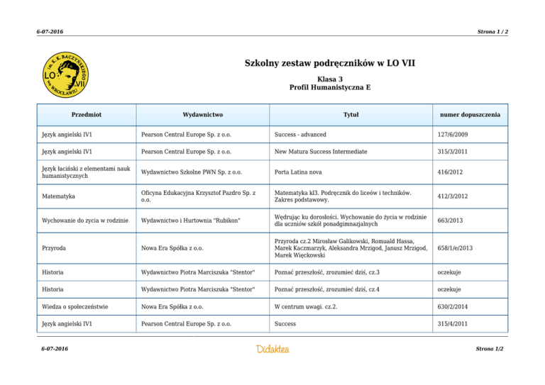 6-07-2016 Strona 1 / 2 Szkolny zestaw podręczników w LO VII Klasa 3 Profil Humanistyczna E Przedmiot Wydawnictwo Tytuł numer dopuszczenia Język angielski IV1 Pearson Central Europe Sp. z o.o. Success - advanced 127/6/2009 Język angielski IV1 Pearson Central Europe Sp. z o.o. New Matura Success Intermediate 315/3/2011 Język łaciński z elementami nauk humanistycznych Wydawnictwo Szkolne PWN Sp. z o.o. Porta Latina nova 416/2012 Matematyka Oficyna Edukacyjna Krzysztof Pazdro Sp. z o.o. Matematyka kl3. Podręcznik do liceów i techników. Zakres podstawowy. 412/3/2012 Wychowanie do zycia w rodzinie Wydawnictwo i Hurtownia "Rubikon" Wędrując ku dorosłości. Wychowanie do życia w rodzinie dla uczniów szkół ponadgimnazjalnych 663/2013 Przyroda Nowa Era Spółka z o.o. Przyroda cz.2 Mirosław Galikowski, Romuald Hassa, Marek Kaczmarzyk, Aleksandra Mrzigod, Janusz Mrzigod, Marek Więckowski 658/1/e/2013 Historia Wydawnictwo Piotra Marciszuka "Stentor" Poznać przeszłość, zrozumieć dziś, cz.3 oczekuje Historia Wydawnictwo Piotra Marciszuka "Stentor" Poznać przeszłość, zrozumieć dziś, cz.4 oczekuje Wiedza o społeczeństwie Nowa Era Spółka z o.o. W centrum uwagi. cz.2. 630/2/2014 Język angielski IV1 Pearson Central Europe Sp. z o.o. Success 315/4/2011 6-07-2016 Strona 1/2 6-07-2016 Strona 2 / 2 Język polski Wydawnictwo Pedagogiczne OPERON Sp. z o.o. Język polski. Odkrywamy na nowo. cz.4 444/4/2013 Język francuski IV0 Hachette Polska Sp. z o.o. Le nouveau Taxi 2 141/2/2010 Matematyka Oficyna Edukacyjna Krzysztof Pazdro Sp. z o.o. Matematyka kl3. Podręcznik do liceów i techników. Zakres podstawowy. 412/3/2012 Matematyka Oficyna Edukacyjna Krzysztof Pazdro Sp. z o.o. Matematyka kl3. Podręcznik do liceów i techników. Zakres podstawowy. 412/3/2012 6-07-2016 Strona 2/2