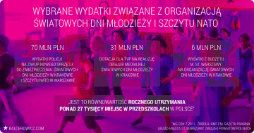 WYBRANE WYDATKI ZWIĄZANE Z ORGANIZACJĄ ŚWIATOWYCH DNI MŁODZIEŻY I SZCZYTU NATO 70 MLN PLN 31 MLN PLN 6 MLN PLN WYDATKI POLICJI NA ZAKUP NOWEGO SPRZĘTU DO ZABEZPIECZENIA ŚWIATOWYCH DNI MŁODZIEŻY W KRAKOWIE I SZCZYTU NATO W WARSZAWIE DOTACJA DLA TVP NA REALIZJĘ OBSŁUGI MEDIALNEJ ŚWIATOWYCH DNI MŁODZIEŻY W KRAKOWIE WYDATKI Z BUDŻETU M. ST. WARSZAWY NA ORGANIZACJĘ ŚWIATOWYCH DNI MŁODZIEŻY W KRAKOWIE JEST TO RÓWNOWARTOŚĆ ROCZNEGO UTRZYMANIA PONAD 27 TYSIĘCY MIEJSC W PRZEDSZKOLACH W POLSCE* WG CEN Z 2011; ŹRÓDŁA: RMF FM, GAZETA PRAWNA, URZĄD MIASTA ST. WARSZAWY, ZWIĄZEK POWIATÓW POLSKICH * BALCEROWICZ.COM
