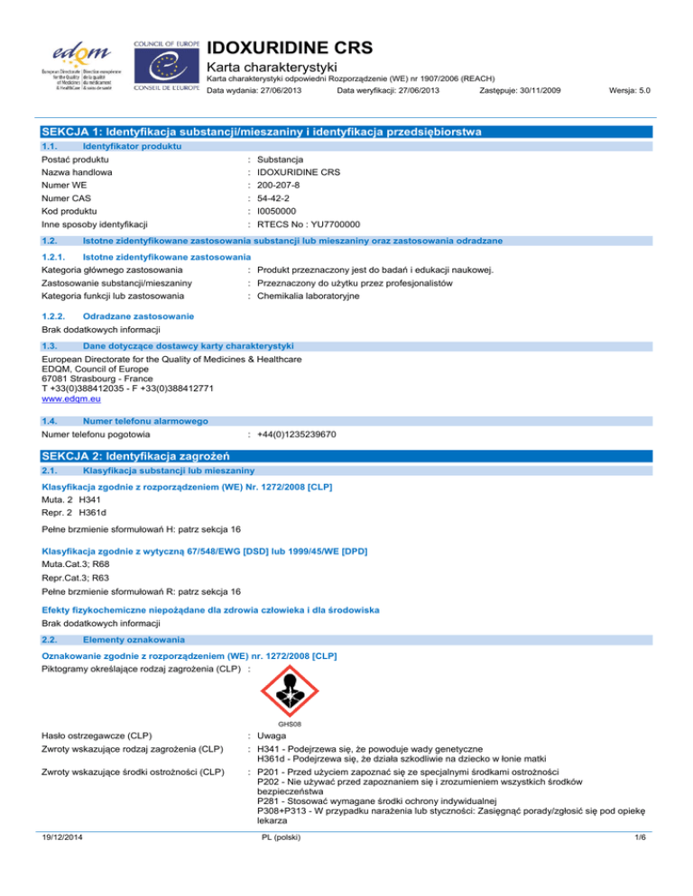 IDOXURIDINE CRS Karta charakterystyki Karta charakterystyki odpowiedni Rozporządzenie (WE) nr 1907/2006 (REACH) Data wydania: 27/06/2013 Data weryfikacji: 27/06/2013 Zastępuje: 30/11/2009 Wersja: 5.0 SEKCJA 1: Identyfikacja substancji/mieszaniny i identyfikacja przedsiębiorstwa 1.1. Identyfikator produktu Postać produktu : Substancja Nazwa handlowa : IDOXURIDINE CRS Numer WE : 200-207-8 Numer CAS : 54-42-2 Kod produktu : I0050000 Inne sposoby identyfikacji : RTECS No : YU7700000 1.2. Istotne zidentyfikowane zastosowania substancji lub mieszaniny oraz zastosowania odradzane 1.2.1. Istotne zidentyfikowane zastosowania Kategoria głównego zastosowania : Produkt przeznaczony jest do badań i edukacji naukowej. Zastosowanie substancji/mieszaniny : Przeznaczony do użytku przez profesjonalistów Kategoria funkcji lub zastosowania : Chemikalia laboratoryjne 1.2.2. Odradzane zastosowanie Brak dodatkowych informacji 1.3. Dane dotyczące dostawcy karty charakterystyki European Directorate for the Quality of Medicines & Healthcare EDQM, Council of Europe 67081 Strasbourg - France T +33(0)388412035 - F +33(0)388412771 www.edqm.eu 1.4. Numer telefonu alarmowego Numer telefonu pogotowia : +44(0)1235239670 SEKCJA 2: Identyfikacja zagrożeń 2.1. Klasyfikacja substancji lub mieszaniny Klasyfikacja zgodnie z rozporządzeniem (WE) Nr. 1272/2008 [CLP] Muta. 2 H341 Repr. 2 H361d Pełne brzmienie sformułowań H: patrz sekcja 16 Klasyfikacja zgodnie z wytyczną 67/548/EWG [DSD] lub 1999/45/WE [DPD] Muta.Cat.3; R68 Repr.Cat.3; R63 Pełne brzmienie sformułowań R: patrz sekcja 16 Efekty fizykochemiczne niepożądane dla zdrowia człowieka i dla środowiska Brak dodatkowych informacji 2.2. Elementy oznakowania Oznakowanie zgodnie z rozporządzeniem (WE) nr. 1272/2008 [CLP] Piktogramy określające rodzaj zagrożenia (CLP) : GHS08 Hasło ostrzegawcze (CLP) : Uwaga Zwroty wskazujące rodzaj zagrożenia (CLP) : H341 - Podejrzewa się, że powoduje wady genetyczne H361d - Podejrzewa się, że działa szkodliwie na dziecko w łonie matki Zwroty wskazujące środki ostrożności (CLP) : P201 - Przed użyciem zapoznać się ze specjalnymi środkami ostrożności P202 - Nie używać przed zapoznaniem się i zrozumieniem wszystkich środków bezpieczeństwa P281 - Stosować wymagane środki ochrony indywidualnej P308+P313 - W przypadku narażenia lub styczności: Zasięgnąć porady/zgłosić się pod opiekę lekarza 19/12/2014 PL (polski) 1/6 IDOXURIDINE CRS Karta charakterystyki Karta charakterystyki odpowiedni Rozporządzenie (WE) nr 1907/2006 (REACH) P501 - Zawartość/pojemnik usuwać do : Odpady niebezpieczne. Należy przestrzegać obowiązujących rozporządzeń prawnych 2.3. Inne zagrożenia Inne zagrożenia mające wpływ na klasyfikację : Ekspozycja może spowodować reakcję alergiczną. SEKCJA 3: Skład/informacja o składnikach 3.1. Substancja Nazwa : IDOXURIDINE Numer CAS : 54-42-2 Numer WE : 200-207-8 Nazwa Identyfikator produktu % Klasyfikacja zgodnie z dyrektywą 67/548/EEC IDOXURIDINE (Numer CAS) 54-42-2 (Numer WE) 200-207-8 ≤ 100 Muta.Cat.3; R68 Repr.Cat.3; R63 Nazwa Identyfikator produktu % Klasyfikacja zgodnie z rozporządzeniem (WE) Nr. 1272/2008 [CLP] IDOXURIDINE (Numer CAS) 54-42-2 (Numer WE) 200-207-8 ≤ 100 Muta. 2, H341 Repr. 2, H361d Brzmienie sformułowań R i H: patrz sekcja 16 3.2. Mieszanina Nie dotyczy SEKCJA 4: Środki pierwszej pomocy 4.1. Opis środków pierwszej pomocy Pierwsza pomoc - środki po zainhalowaniu : W razie przypadkowej inhalacji, wyprowadzić poszkodowanego na świeże powietrze. Zapewnić oddychanie świeżym powietrzem. Pierwsza pomoc - środki po kontakcie ze skórą : Spłukać skórę pod strumieniem wody/prysznicem. Pierwsza pomoc - środki po kontakcie z oczami : Płukanie w wodzie trzymając powieki szeroko rozwarte. Zdjąć soczewki kontaktowe. Pierwsza pomoc - środki po połknięciu : Przepłukać usta wodą. 4.2. Najważniejsze ostre i opóźnione objawy oraz skutki narażenia Symptomy/urazy 4.3. : Patrz Punkt 2. Wskazania dotyczące wszelkiej natychmiastowej pomocy lekarskiej i szczególnego postępowania z poszkodowanym W przypadku jakichkolwiek wątpliwości lub jeśli objawy się utrzymują, zwrócić się do lekarza. SEKCJA 5: Postępowanie w przypadku pożaru 5.1. Środki gaśnicze Odpowiednie środki gaśnicze 5.2. Szczególne zagrożenia związane z substancją lub mieszaniną Reaktywny w przypadku pożaru 5.3. : Małe ilości: Stosować odpowiednie środki do zwalczania pożaru w sąsiedztwie. Woda rozpylana. Ditlenek węgla. Suchy proszek. Piana. Duże ilości: Nie dotyczy. : Patrz Rubryka 10.1. Informacje dla straży pożarnej Środki zapobiegawcze celem uniknięcia pożaru : Małe ilości: Stosować zwykły, indywidualny sprzęt ochrony przeciwpożarowej. Duże ilości: Nie dotyczy. Instrukcja gaśnicza : Rozcieńczyć w wodzie. SEKCJA 6: Postępowanie w przypadku niezamierzonego uwolnienia do środowiska 6.1. Indywidualne środki ostrożności, wyposażenie ochronne i procedury w sytuacjach awaryjnych Ogólne środki zaradcze 6.1.1. Dla osób nienależących do personelu udzielającego pomocy Wyposażenie ochronne 6.1.2. : Unikać wydzielania się pyłów. Nosić odpowiednią odzież ochronną, odpowiednie rękawice i okulary ochronne lub osłonę twarzy. Duże ilości: Nie dotyczy. : Patrz Nagłówek 7/8. Dla osób udzielających pomocy Brak dodatkowych informacji 6.2. Środki ostrożności w zakresie ochrony środowiska Brak dodatkowych informacji 19/12/2014 PL (polski) 2/6 IDOXURIDINE CRS Karta charakterystyki Karta charakterystyki odpowiedni Rozporządzenie (WE) nr 1907/2006 (REACH) 6.3. Metody i materiały zapobiegające rozprzestrzenianiu się skażenia i służące do usuwania skażenia Metody oczyszczania 6.4. : Zamieść i zebrać rozprzestrzenioną substancję do pojemników. Należy upewnić się, że odpady zostaną zebrane i zmagazynowane w bezpiecznym miejscu. Dokładnie wyczyścić. Czyszczenie w wodzie. Odniesienia do i