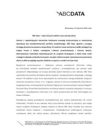 Warszawa, 13 stycznia 2016 roku ABC Data – nowy rok pod znakiem coraz szerszej oferty Jednym z najważniejszych elementów budowania przewagi konkurencyjnej w nowoczesnej dystrybucji jest komplementarność portfolio produktowego. ABC Data, zgodnie z przyjętą strategią dynamicznie poszerza swoją ofertę. W ostatnim czasie asortyment spółki wzbogacił się między innymi o kolejne rozwiązania z zakresu przechowywania i ochrony danych, alternatywnych materiałów eksploatacyjnych do urządzeń drukujących, a także nowe marki z kategorii zabawek, artykułów biurowych, narzędzi i elektronarzędzi. Systematyczne poszerzanie oferty to efekt przyjętego sposobu działania w oparciu o model one-stop-shop. Bezpieczne przechowywanie i efektywna ochrona posiadanych informacji należą do priorytetów zarówno współczesnych instytucji i przedsiębiorstw, jak również osób prywatnych. Odpowiadając na rosnące potrzeby swoich klientów w tym zakresie, ABC Data systematycznie poszerza posiadaną ofertę urządzeń i oprogramowania związanego z obsługą danych. W ostatnim czasie firma wprowadziła do asortymentu szereg produktów służących tworzeniu prywatnych chmur, m.in. magazyny danych w chmurze osobistej My Cloud Mirror drugiej generacji, renomowanej firmy Western Digital oraz sieciowe pamięci masowe Seagate® Personal Cloud. W portfolio dystrybutora nie brakuje również rozwiązań związanych z ochroną, backupem i odzyskiwaniem informacji, m.in. takich producentów jak AVG Technologies czy Veeam Software. Nieodłączną częścią prowadzenia przedsiębiorstwa jest wydruk dokumentów lub innych materiałów. Trendem w tym zakresie, który coraz bardziej zyskuje na znaczeniu, jest usługa najmu urządzeń drukujących, będąca również w ofercie ABC Data. Pozwala ona znacznie redukować koszty związane z drukowaniem. Przedsiębiorcom preferującym tradycyjne rozwiązanie, jakim jest zakup sprzętu, dystrybutor oferuje wyjątkowo szeroki wachlarz ABC Data S.A., ul. Daniszewska 14, 03-230 Warszawa, Sąd Rejonowy dla m.st. Warszawy w Warszawie, XIII Wydział Gospodarczy Krajowego Rejestru Sądowego, KRS: 0000287132, kapitał zakładowy wpłacony w całości: 125.266.899 zł, NIP: 524-26-17-178, REGON: 141054682, www.abcdata.eu drukarek i materiałów eksploatacyjnych. ABC Data poszerzyła właśnie swój asortyment w tym zakresie o wyroby marki ActiveJet, które są już dostępne w systemie InterLink. Rozbudowane portfolio produktów jest istotne dla komplementarności oferty spółki, która dąży do działania w oparciu o model one-stop-shop. Dążąc do posiadania kompleksowej oferty, ABC Data systematycznie poszerza wachlarz posiadanych towarów nie tylko o nowości produktowe, lecz także zupełnie nowe kategorie wyrobów. Już teraz klienci firmy mogą poprzez dedykowaną im platformę e-commerce zaopatrzyć się w produkty związane z szeroko pojętym IT i elektroniką użytkową, jak również artykuły papiernicze i zabawki. W ostatnim czasie oferta spółki wzbogaciła się o narzędzia i elektronarzędzia uznanych marek, m.in. Black&Decker, DeWalt, Proline czy Stanley. W najbliższym czasie planowane jest wprowadzenie nowych kategorii produktów, jak Home&Living, lifestyle czy artykuły sportowe. Model one-stop-shop pozwala klientom firmy na zakup dowolnych towarów pod jednym dachem, bez konieczności poszukiwania ich u innych dostawców. Pozwala to jednocześnie oszczędzać czas oraz korzystać z innych przewag, jakie daje współpraca z ABC Data, np. wysokiej jakości usług logistycznych czy oferowanego klientom wsparcia finansowego. Bycie konkurencyjnym w tym obszarze pozwala spółce na dynamiczne rozbudowywanie bazy klientów, a poszerzający się w ten sposób kanał dotarcia czyni ABC Data jeszcze bardziej atrakcyjnym partnerem dla producentów. Dzięki temu osiągnięcie postawionego celu strategicznego, jakim jest zdobycie do 2018 roku pozycji lidera dystrybucji IT w regionie CEE, jest coraz bliżej. O ABC Data S.A. ABC Data S.A. jest liderem rynku dystrybucji sprzętu IT i elektroniki użytkowej w Polsce oraz jedynym podmiotem działającym bezpośrednio w ośmiu państwach Europy Środkowej i Wschodniej (należących do UE). Firma od ponad 25 lat oferuje sprzęt komputerowy, oprogramowanie i elektronikę użytkową. ABC Data dysponuje największą na rynku ofertą ABC Data S.A., ul. Daniszewska 14, 03-230 Warszawa, Sąd Rejonowy dla m.st. Warszawy w Warszawie, XIII Wydział Gospodarczy Krajowego Rejestru Sądowego, KRS: 0000287132, kapitał zakładowy wpłacony w całości: 125.266.899 zł, NIP: 524-26-17-178, REGON: 141054682, www.abcdata.eu ponad 100 tys. produktów, ponad 700 renomowanych marek. W ostatnich miesiącach do portfolio produktowego włączone zostały nowe kategorie takie jak produkty smart, artykuły papiernicze i biurowe, zabawki oraz narzędzia i elektronarzędzia. Dzięki systematycznemu rozwojowi i wieloletnim inwestycjom w internetowe platformy obsługi klientów, firma zajmuje czołową pozycję w zakresie sprzedaży on-line. W latach 2009 – 2014 ABC Data została pięciokrotnie wyróżniona nagrodą EMEA Channel Academy dla najlepszego dystrybutora regionu Europy Środkowo-Wschodniej. W 2015 roku spółka po raz kolejny zajęła pierwsze miejsce w głównym rankingu raportu Computerworld TOP 200 utrzymując status największej firmy informatycznej na rynku polskim. Jako pierwsza firma z Polski została członkiem GTDC, prestiżowego stowarzyszenia obejmującego 24 największych dystrybutorów IT na świecie. W 2010 roku ABC Data S.A. zadebiutowała na Giełdzie Papierów Wartościowych w Warszawie. Za kontakty z mediami odpowiada: Agnieszka Forasińska ABC Data S.A. [email protected] +48 22 591 67 83 ABC Data S.A., ul. Daniszewska 14, 03-230 Warszawa, Sąd Rejonowy dla m.st. Warszawy w Warszawie, XIII Wydział Gospodarczy Krajowego Rejestru Sądowego, KRS: 0000287132, kapitał zakładowy wpłacony w całości: 125.266.89