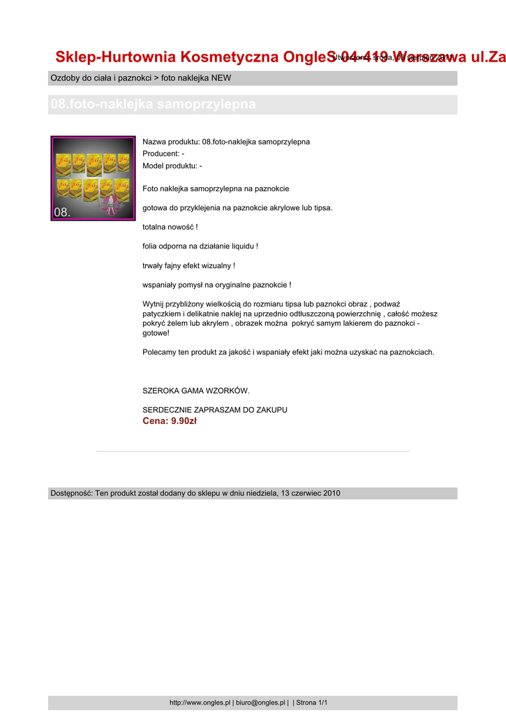 środa,Warszawa 03 sierpień 2011 Sklep-Hurtownia Kosmetyczna OngleSUtworzono: 04-419 ul.Za Ozdoby do ciała i paznokci > foto naklejka NEW 08.foto-naklejka samoprzylepna Nazwa produktu: 08.foto-naklejka samoprzylepna Producent: Model produktu: Foto naklejka samoprzylepna na paznokcie gotowa do przyklejenia na paznokcie akrylowe lub tipsa. totalna nowość ! folia odporna na działanie liquidu ! trwały fajny efekt wizualny ! wspaniały pomysł na oryginalne paznokcie ! Wytnij przybliżony wielkością do rozmiaru tipsa lub paznokci obraz , podważ patyczkiem i delikatnie naklej na uprzednio odtłuszczoną powierzchnię , całość możesz pokryć żelem lub akrylem , obrazek można pokryć samym lakierem do paznokci gotowe! Polecamy ten produkt za jakość i wspaniały efekt jaki można uzyskać na paznokciach. SZEROKA GAMA WZORKÓW. SERDECZNIE ZAPRASZAM DO ZAKUPU Cena: 9.90zł Dostępność: Ten produkt został dodany do sklepu w dniu niedziela, 13 czerwiec 2010 http://www.ongles.pl | [email protected] | | Strona 1/1
