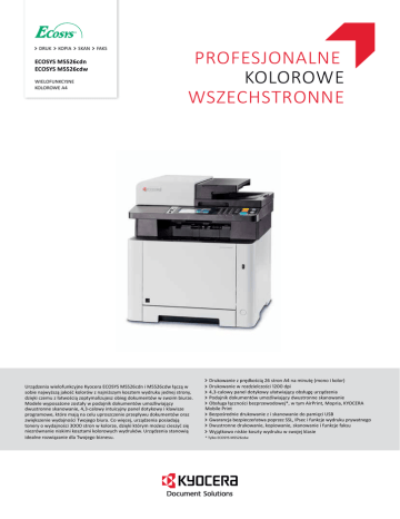 DRUK KOPIA SKAN ECOSYS M5526cdn ECOSYS M5526cdw WIELOFUNKCYJNE KOLOROWE A4 FAKS Profesjonalne kolorowe wszechstronne Urządzenia wielofunkcyjne Kyocera ECOSYS M5526cdn i M5526cdw łączą w sobie najwyższą jakość kolorów z najniższym kosztem wydruku jednej strony, dzięki czemu z łatwością zoptymalizujesz obieg dokumentów w swoim biurze. Modele wyposażone zostały w podajnik dokumentów umożliwiający dwustronne skanowanie, 4,3-calowy intuicyjny panel dotykowy i klawisze programowe, które mają na celu uproszczenie przepływu dokumentów oraz zwiększenie wydajności Twojego biura. Co więcej, urządzenia posiadają tonery o wydajności 3000 stron w kolorze, dzięki którym możesz cieszyć się niezrównanie niskimi kosztami kolorowych wydruków. Urządzenia stanowią idealne rozwiązanie dla Twojego biznesu. Drukowanie z prędkością 26 stron A4 na minutę (mono i kolor) Drukowanie w rozdzielczości 1200 dpi 4,3-calowy panel dotykowy ułatwiający obsługę urządzenia Podajnik dokumentów umożliwiający dwustronne skanowanie Obsługa łączności bezprzewodowej*, w tym AirPrint, Mopria, KYOCERA Mobile Print Bezpośrednie drukowanie z i skanowanie do pamięci USB Gwarancja bezpieczeństwa poprzez SSL, IPsec i funkcje wydruku prywatnego Dwustronne drukowanie, kopiowanie, skanowanie i funkcje faksu Wyjątkowo niskie koszty wydruku w swojej klasie * Tylko ECOSYS M5526cdw ECOSYS oznacza ECOlogię, ECOnomię oraz rozwiązania SYStemowe. Dzięki długowiecznym podzespołom, urządzenia ECOSYS odznaczają się zwiększoną trwałością i niskimi kosztami posiadania w zakresie utrzymania, administracji oraz eksploatacji. Dzięki rozdzielności bębna i tonera, jedynie toner jest uzupełniany regularnie. Modularna budowa umożliwia elastyczne dopasowanie urządzenia do własnych potrzeb. Zintegrowane oprogramowanie systemowe umożliwia dostosowanie urządzenia do posiadanej przez użytkownika sieci informatycznej. DANE OGÓLNE Technologia: KYOCERA ECOSYS, Kolor Laser Wyświetlacz: 10,9 cm (4,3-calowy) kolorowy panel dotykowy Prędkość drukowania: Do 26 stron A4 na minutę w kolorze i mono Rozdzielczość: 1200 x 1200 dpi przy zmniejszonej prędkości druku, technologia multibit dla drukowania w jakości równoważnej 9600 x 600 dpi (druk), 600 x 600 dpi, 256 odcieni szarości na kolor (skan/kopia) Wydajność: Maks. 50 000 stron na miesiąc Czas nagrzewania: Ok. 29 sekund lub mniej Czas pierwszego wydruku: Ok. 9,5/10,5 sekundy lub mniej w mono/w kolorze Czas pierwszej kopii: Ok. 8/10 sekund lub mniej w mono/w kolorze Procesor: 800 MHz Pamięć: Standard 512 MB, maks. 1536 MB Interfejsy: ECOSYS M5526cdn: USB 2.0 (Hi-Speed), USB Host Interface, Gigabit Ethernet (10BaseT/100BaseTX/1000BaseT), gniazdo dodatkowej karty SD/SDHC ECOSYS M5526cdw: USB 2.0 (Hi-Speed), USB Host Interface, Gigabit Ethernet (10BaseT/100BaseTX/1000BaseT), Wireless LAN, gniazdo dodatkowej karty SD/SDHC Wymiary (szer x głęb x wys): 417 x 429 x 495 mm Waga: Ok. 26 kg Napięcie zasilania: AC 220 ~ 240 V, 50/60 Hz Pobór mocy: Kopiowanie/drukowanie mono/w kolorze: 345 W Tryb gotowości: 41 W Tryb uśpienia: 1 W Poziom hałasu (ISO 7779/ISO 9296): Kopiowanie/drukowanie mono/kolor: 48/48 dB(A) LpA Tryb gotowości: 30 dB(A) LpA Certyfikaty: TÜV/GS, CE - urządzenie jest produkowane zgodnie z normą ISO 9001 oraz normą ochrony środowiska ISO 14001 OBSŁUGA PAPIERU Wszystkie podane pojemności dotyczą papieru o grubości maks. 0,11 mm. Pojemność wejściowa: 50-kartkowy podajnik wielofunkcyjny; 60–220 g/m2; A4, A5, A6, B5, B6, Letter, Legal, inne w zakresie 70 x 148 mm–216 x 356 mm; kaseta uniwersalna na 250 arkuszy; 60–163 g/m2; A4, A5, A6, B5, B6, Letter, Legal, inne w zakresie 105 x 148–216 x 356 mm. Maks. pojemność wejściowa z opcjami: 550 ark. Moduł dupleksu w standardzie: Dwustronne drukowanie: 60–120 g/m²; A4, A5, B5, Letter, Legal Podajnik dokumentów umożliwiający dwustronne skanowanie: 50 arkuszy, 50–160 g/m², A4, A5, A6, B5, Letter, Legal, inne w zakresie 105 x 148 mm do 216 x 356 mm Pojemność wyjściowa: Maks. 150 arkuszy wydrukiem do dołu z czujnikiem przepełnienia DRUKOWANIE Język kontrolera: PRESCRIBE IIc Emulacje: PCL 6 (PCL 5c/PCL-XL), PostScript 3 (KPDL 3), PDF Direct Print, XPS Direct Print Obsługiwane systemy operacyjne: Wszystkie aktualne wersje Windows, MAC OS X wersja 10,8 lub wyższa, Unix, Linux oraz inne według potrzeb Czcionki: 93 czcionki PCL/PostScript, 8 czcionek Windows Vista, 1 czcionka bitmapowa, 45 kodów kreskowych (np. EAN8, EAN13, EAN128) z automatycznym generowaniem sum kontrolnych, obsługa 2-wymiarowych kodów PDF-417 pod PRESCRIBE (PCL i inne kody dostępne jako opcja) KOPIOWANIE Maksymalny format oryginału: A4/Legal Kopiowanie ciągłe: 1 – 9 99 Typ pliku: TIFF, PDF, PDF/A, wysoko skompresowany PDF, szyfrowany PDF, JPEG, XPS Metody kompresji: MMR/JPEG Funkcje: Wewnętrzna książka adresowa, obsługa Active directory, szyfrowany transfer danych, pomijanie pustych stron FAKS Kompatybilność: ITU-T Super G3 Szybkość modemu: Maks. 33,6 kbps Szybkość transmisji: Mniej niż 3 sekundy Prędkość skanowania: 2 sekundy/arkusz lub mniej Książka adresowa: 100 pozycji Dostępne rozdzielczości: Normal: 200 x 100 dpi, Fine: 200 x 200 dpi, Superfine: 200 x 400 dpi, Ultrafine: 400 x 400 dpi Maksymalny format oryginału: A4, Legal Metody kompresji: JBIG, MMR, MR, MH Funkcje: Faks sieciowy, wysyłanie i odbiór dokumentów 2-stronnych, transmisja i odbiór polling Odbiór do pamięci: 256 arkuszy lub więcej Funkcje: Faks sieciowy, wysyłanie i odbiór dokumentów 2-stronnych, transmisja i odbiór polling Zakres zoom: 25 – 400% co 1% Współczynniki zoom: 7 zmniejszeń / 5 powiększeń EKSPLOATACJA Typy ekspozycji: Ręczna: 9 stopni Średnia wydajność zgodnie z ISO/IEC 19798 TK-5240K: Czarny toner o wydajności 4000 stron A4; toner startowy: czarny toner o wydajności 1200 stron A4 TK-5240C, TK-5240M, TK-5240Y: cyan, magenta, yellow o wydajno