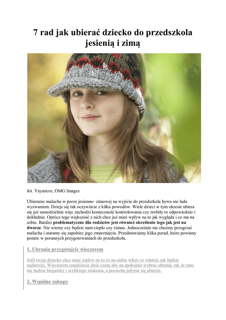 7 rad jak ubierać dziecko do przedszkola jesienią i zimą fot. Yaymicro, OMG Images Ubieranie malucha w porze jesienno- zimowej na wyjście do przedszkola bywa nie lada wyzwaniem. Dzieje się tak oczywiście z kilku powodów. Wiele dzieci w tym okresie ubiera się już samodzielnie więc zachodzi konieczność kontrolowania czy zrobiły to odpowiednio i dokładnie. Oprócz tego większość z nich chce już mieć wpływ na to jak wygląda i co ma na sobie. Bardzo problematyczne dla rodziców jest również określenie tego jak jest na dworze. Nie wiemy czy będzie nam ciepło czy zimno. Jednocześnie nie chcemy przegrzać malucha i staramy się zapobiec jego zmarznięciu. Przedstawiamy klika porad, które powinny pomóc w porannych przygotowaniach do przedszkola. 1. Ubrania przygotujcie wieczorem Jeśli twoje dziecko chce mieć wpływ na to co na siebie włoży to właśnie tak będzie najłatwiej. Wieczorem znajdziecie dość czasu aby na spokojnie wybrać ubrania, tak że rano nie będzie bieganiny i szybkiego szukania, a pociecha jedynie się ubierze. 2. Wspólne zakupy Dzieci lubią czuć, że mają wpływ na ważne decyzje. Na zakupy wybierzcie się wspólnie, pokazuj ubrania, pytaj czy się podobają, pozwól przymierzyć lub zdecydować na jedno z dwóch. Twój maluch z cała pewnością chętniej będzie nosić „samodzielnie” zakupione ciuszki. 3. Na cebulkę Ułatwia to wyjście zarówno tobie jak i paniom w przedszkolu i dziecku. Kilka warstw cienkich ubrań, z których w każdej chwili można coś zdjąć jak i założyć, pomoże uchronić zarówno przed przegrzaniem jak i zmarznięciem. 4. Naturalne tkaniny ,np. bawełna Materiał wówczas oddycha, skóra nie swędzi. Włókna są również bardziej miękkie, nie odznaczają się taką sztywnością jak sztuczne. Dziecko będzie się w nich czuło bardziej komfortowo i nie powinny pojawiać się podrażnienia. 5. Metki Jeśli w ubraniach znajdują się sztywne metki, które ocierając się o skórę mogą powodować dyskomfort i podrażnienia koniecznie je usuń. 6. Łatwe do ubierania Dzieci w przedszkolu muszą radzić sobie same zarówno w toalecie jak i podczas wyjść z przedszkola. Z tego powodu warto aby części garderoby jakie zapewnisz swojemu maluchowi były łatwe do ubrania. Spodnie wybierz na gumkę lub zatrzask, bluzy lub bluzki powinny być raczej wciągane przez głowę, jednak dobrze aby z przodu znajdowała się charakterystyczna aplikacja dziecku łatwiej wówczas odróżnić gdzie jest przód a gdzie tył. 7. Odrobinę za duże Jesienią i zimą powinniśmy zadbać aby dziecku np. plecki nie wystawały po schyleniu się tylko dlatego, że koszulka jest za krótka. Wybierz niektóre części garderoby nieco za duże na twojego szkraba, dzięki temu będzie mu cieplej. Marta