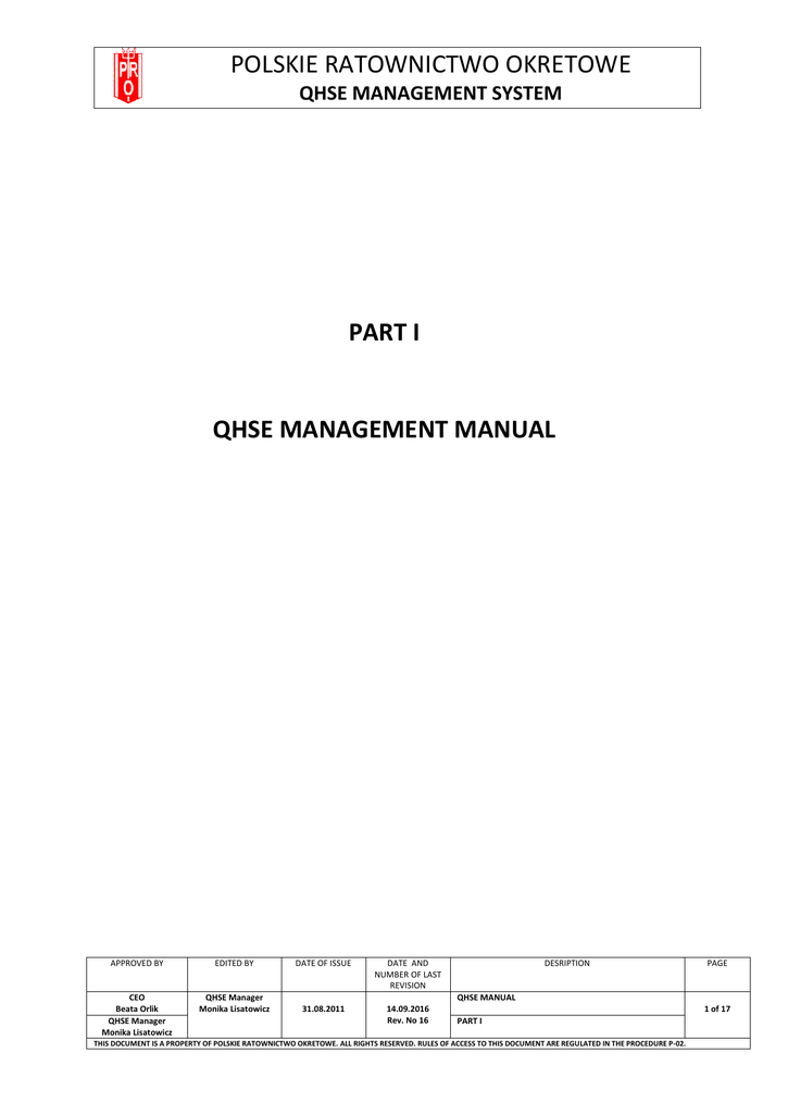 POLSKIE RATOWNICTWO OKRETOWE QHSE MANAGEMENT SYSTEM PART I QHSE MANAGEMENT MANUAL APPROVED BY EDITED BY DATE OF ISSUE DATE AND NUMBER OF LAST REVISION CEO Beata Orlik QHSE Manager Monika Lisatowicz QHSE Manager Monika Lisatowicz 31.08.2011 14.09.2016 Rev. No 16 DESRIPTION PAGE QHSE MANUAL 1 of 17 PART I THIS DOCUMENT IS A PROPERTY OF POLSKIE RATOWNICTWO OKRETOWE. ALL RIGHTS RESERVED. RULES OF ACCESS TO THIS DOCUMENT ARE REGULATED IN THE PROCEDURE P-02. POLSKIE RATOWNICTWO OKRETOWE QHSE MANAGEMENT SYSTEM List of Contents Chapter I QHSE policy - quality (ISO 9001:2008), health protection (HSE), safety, environment protection (ISM-CODE), vessel’s security (ISPS-CODE) Chapter II Definitions of terms and abbreviations in use Chapter III Profile and structure of the QHSE Management System Chapter IV Designated Person Ashore, QHSE Manager, ISPS Security Officer, Operator’s Safety Committee, Ship’s Safety Committee, Postaccident Committee, Post-failure Committee Chapter V Operator’s authority and responsibility Chapter VI Master’s authority and responsibility — the vessel’s crew Chapter VII Certification and periodical verification Chapter VIII List of the main legal instruments regulating the Company policy within safety, environment protection, health protection and quality Chapter IX List of the QHSE Management System documentation APPROVED BY EDITED BY DATE OF ISSUE DATE AND NUMBER OF LAST REVISION CEO Beata Orlik QHSE Manager Monika Lisatowicz QHSE Manager Monika Lisatowicz 31.08.2011 14.09.2016 Rev. No 16 DESRIPTION PAGE QHSE MANUAL 2 of 17 PART I THIS DOCUMENT IS A PROPERTY OF POLSKIE RATOWNICTWO OKRETOWE. ALL RIGHTS RESERVED. RULES OF ACCESS TO THIS DOCUMENT ARE REGULATED IN THE PROCEDURE P-02. POLSKIE RATOWNICTWO OKRETOWE QHSE MANAGEMENT SYSTEM Chapter I Quality (ISO 9001:2008), health protection (HSE), safety, environment protection (ISMCODE), vessel’s security (ISPS-CODE) QHSE POLICY Polskie Ratownictwo Okretowe is a ship operating company providing shipping and crane services for the shipping offshore industry, and in particular: offshore installations service, ocean towage, transhipment and transport of goods. The Company intends to achieve and maintain the highest possible level of quality and safety in all types of its activity. The mission of the Company is to operate the modern fleet, taking into account the highest level of safety of personnel, natural environment, property and quality. The Company takes into account the safety of other persons and entities that are influenced by its activities. The Company requires all its employees to be engaged in achieving the high level of quality, health, safety and environment protection. 1. Main objectives of the QHSE Policy: Promote and support a pro-active QHSE culture, outstanding QHSE performance and manage this as a line responsibility with clear authorities and accountabilities. 2. Emphasis on understanding our client’s requirements prior to provide solutions, which often surpass their expectations in order to achieve customer satisfaction . 3. Preservation of human and environmental assets which is vital to the success and efficiency of our business. 4. Involve all the staff in Health, Safety, Quality and prevention of pollution. 5. Establish objectives and review them at necessary intervals, to identify improvement opportunities and take suitable actions for continual improvement. 6. Management of Subcontractors and Suppliers to ensure that their activities meet PRO requirements as a minimum. 7. Compliance with applicable law and contractually committed requirements as a minimum by: • Implementation of applicable Lessons Learnt, • Systematic identification, assessment and management of changes. 8. The clear responsibility that everyone has the obligation to stop the job when it is not safe. No job is that important that it cannot be done safely. APPROVED BY EDITED BY DATE OF ISSUE DATE AND NUMBER OF LAST REVISION CEO Beata Orlik QHSE Manager Monika Lisatowicz QHSE Manager Monika Lisatowicz 31.08.2011 14.09.2016 Rev. No 16 DESRIPTION PAGE QHSE MANUAL 3 of 17 PART I THIS DOCUMENT IS A PROPERTY OF POLSKIE RATOWNICTWO OKRETOWE. ALL RIGHTS RESERVED. RULES OF ACCESS TO THIS DOCUMENT ARE REGULATED IN THE PROCEDURE P-02. POLSKIE RATOWNICTWO OKRETOWE QHSE MANAGEMENT SYSTEM 9. Consultation of employees about QHSE related subjects by means of recognized representation and meetings. 10. Ensure the proper organisational structure and highly qualified seagoing and shorebased personnel. 11. Ensure the work conditions that are safe and harmless for health in the entirety of the Company activities. 12. Risk management through identification of possible hazards. 13. Prepare the personnel to act in the emergency situations. 14. Prevent any damage and injury at the workplace. 15. Conduct necessary training for all personnel and ensure support to the personnel from the part of management, allowing them performance of their duties according to the rules of this Policy. 16. Prevent damage to the natural environment resulting from the Company activity. 17. Operate modern fleet and maintain all the units and their equipment according to the requirements of the Company, charterers and supervising institutions. 18. Apply any relevant rules and regulations within safety, health protection, natural environment and high quality in all its operations. 19. Ensure supervision and certification of the QHSE Management System according to the requirements of the ISM Code with taking into account the ISPS Code, MLC 2006, ISO 9001:2008. 20. Follow the QHSE Policy that is the overriding document for all areas of the Company activity. In order to implement and to achieve the QHSE Policy objectives, the Company established and applies the QHSE Management System. CEO Beata Orlik APPROVED BY EDITED BY DATE OF ISSUE DATE AND NUMBER OF LAST REVISION CEO Beata Orlik QHSE Manager Monika Lisatowicz QHSE Manager Monika Lisatowicz 31.08.2011 14.09.2016 Rev
