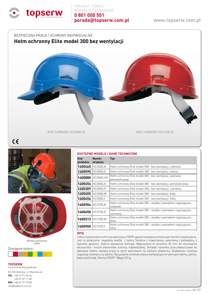 KONTAKT, POMOC, WSPARCIE TECHNICZNE 0 801 000 501 [email protected] www.topserw.com.pl BEZPIECZNA PRACA / OCHRONY INDYWIDUALNE Hełm ochronny Elite model 300 bez wentylacji KOD 1400460 /HC300ELB KOD 1400650 /HC315ELR DOSTĘPNE MODELE / DANE TECHNICZNE Kod produktu Numer artykułu Typ 1400460 1400595 HC300ELB Hełm ochronny Elite model 300 - bez wentylacji, niebieski HC300ELG Hełm ochronny Elite model 300 - bez wentylacji, zielony 1400880 HC300ELHO Hełm ochronny Elite model 300 - bez wentylacji, jaskrawo pomarańczowy 1400454 1400309 1400455 1400456 HC300ELO Hełm ochronny Elite model 300 - bez wentylacji, pomarańczowy 1400904 HC315ELB 1400650 HC315ELR 1400313 HC315ELW 1400900 HC315ELY HC300ELR Hełm ochronny Elite model 300 - bez wentylacji, czerwony HC300ELW Hełm ochronny Elite model 300 - bez wentylacji, biały HC300ELY Hełm ochronny Elite model 300 - bez wentylacji, żółty Hełm ochronny Elite model 300 - więźba z pokrętłem regulującym, niebieski Hełm ochronny Elite model 300 - więźba z pokrętłem regulującym, czerwony Hełm ochronny Elite model 300 - więźba z pokrętłem regulującym, biały Hełm ochronny Elite model 300 - więźba z pokrętłem regulującym, żółty OPIS Więźba plastykowa HDPE Dostępne kolory: Lekki i stylowy hełm ochronny wykonany z HDPE zapewnia bezpieczeństwo jak i komfort użytkowania. Jest to połączenie wygodnej więźby z taśmy Terylene z nowoczesną, wykonaną z polietylenu o wysokiej gęstości, dobrze wyważoną skorupą. Wyposażony w szczeliny 30 mm do mocowania akcesoriów i innych elementów ochrony indywidualnej. Ponadto rynienka przeciwdeszczowa na obwodzie hełmu ułatwia pracę w złych warunkach na wolnym powietrzu. Dodatkowo możliwa regulacja rozmiaru na taśmie. Opcjonalnie możliwe otwory wentylacyjne w skorupie hełmu, potnik, paski pod brodę. Norma EN397. Waga 310 g. TOPSERW POCZUCIE BEZPIECZEŃSTWA 05-220 Zielonka, ul. Marecka 66 TEL +48 22 771 04 56 +48 22 761 11 80 FAX +48 22 771 93 80 [email protected] KOD 1400309 HC300ELR str. 1/1
