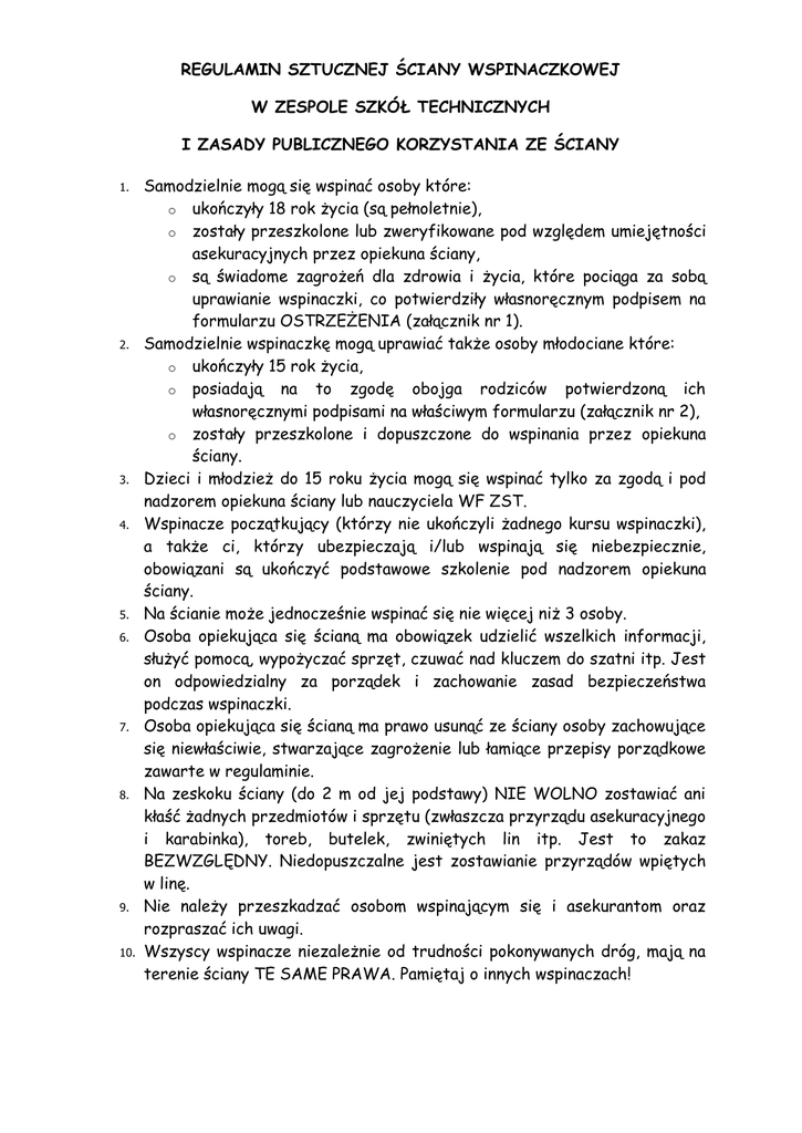 REGULAMIN SZTUCZNEJ ŚCIANY WSPINACZKOWEJ W ZESPOLE SZKÓŁ TECHNICZNYCH I ZASADY PUBLICZNEGO KORZYSTANIA ZE ŚCIANY 1. 2. 3. 4. 5. 6. 7. 8. 9. 10. Samodzielnie mogą się wspinać osoby które: o ukończyły 18 rok życia (są pełnoletnie), o zostały przeszkolone lub zweryfikowane pod względem umiejętności asekuracyjnych przez opiekuna ściany, o są świadome zagrożeń dla zdrowia i życia, które pociąga za sobą uprawianie wspinaczki, co potwierdziły własnoręcznym podpisem na formularzu OSTRZEŻENIA (załącznik nr 1). Samodzielnie wspinaczkę mogą uprawiać także osoby młodociane które: o ukończyły 15 rok życia, o posiadają na to zgodę obojga rodziców potwierdzoną ich własnoręcznymi podpisami na właściwym formularzu (załącznik nr 2), o zostały przeszkolone i dopuszczone do wspinania przez opiekuna ściany. Dzieci i młodzież do 15 roku życia mogą się wspinać tylko za zgodą i pod nadzorem opiekuna ściany lub nauczyciela WF ZST. Wspinacze początkujący (którzy nie ukończyli żadnego kursu wspinaczki), a także ci, którzy ubezpieczają i/lub wspinają się niebezpiecznie, obowiązani są ukończyć podstawowe szkolenie pod nadzorem opiekuna ściany. Na ścianie może jednocześnie wspinać się nie więcej niż 3 osoby. Osoba opiekująca się ścianą ma obowiązek udzielić wszelkich informacji, służyć pomocą, wypożyczać sprzęt, czuwać nad kluczem do szatni itp. Jest on odpowiedzialny za porządek i zachowanie zasad bezpieczeństwa podczas wspinaczki. Osoba opiekująca się ścianą ma prawo usunąć ze ściany osoby zachowujące się niewłaściwie, stwarzające zagrożenie lub łamiące przepisy porządkowe zawarte w regulaminie. Na zeskoku ściany (do 2 m od jej podstawy) NIE WOLNO zostawiać ani kłaść żadnych przedmiotów i sprzętu (zwłaszcza przyrządu asekuracyjnego i karabinka), toreb, butelek, zwiniętych lin itp. Jest to zakaz BEZWZGLĘDNY. Niedopuszczalne jest zostawianie przyrządów wpiętych w linę. Nie należy przeszkadzać osobom wspinającym się i asekurantom oraz rozpraszać ich uwagi. Wszyscy wspinacze niezależnie od trudności pokonywanych dróg, mają na terenie ściany TE SAME PRAWA. Pamiętaj o innych wspinaczach! II. OBOWIĄZUJĄCE ZASADY WSPINANIA 1. 2. 3. 4. 5. 6. 7. 8. Na ścianie można się wspinać: o BEZ ASEKURACJI – na dowolnej połaci ściany, ale nie wolno wykorzystywać chwytów umieszczonych wyżej niż 3 m ponad zeskokiem (powyżej czerwonej przerywanej linii), o Z ASEKURACJĄ GÓRNĄ (w układzie wędki) – wszędzie, gdzie umieszczone są górne punkty asekuracyjne (plakietki i łańcuchy) Wspinacze są zobowiązani do używania wyłącznie sprzętu dobrej jakości i właściwego przeznaczenia. Do asekuracji wolno używać przyrządów bezpiecznych, posiadających atest (UIAA, CE, DIN), takich jak np. płytka Stichta, kubek Lowe’a, Gri-gri, Reverso, Piu itp. Na ścianie NIE WOLNO asekurować za pomocą ósemek zjazdowych. Asekurować należy bezpiecznie i skutecznie według najlepszych zasad. W szczególności zabrania się zbyt szybkiego opuszczania wspinaczy zjeżdżających pod ścianę. Zabrania się opuszczać wspinacza zjeżdżającego pod ścianę metodą „prześlizgiwania” liny trzymanej w dłoniach. Linę z uprzężą łączyć można jedynie przy pomocy następujących węzłów: a) TATRZAŃSKIEGO skrajnego z podwójnym zabezpieczeniem, b) ÓSEMKOWEGO (zalecane). Nie jest dozwolone łączenie liny z uprzężą za pomocą karabinka!!! Asekurant podczas ubezpieczania partnera „na wędce” powinien stać co najmniej 2 metry wstecz i nieco w bok od punktu przełożenia liny. Na linie asekuracyjnej za przyrządem należy luźno zawiązać węzeł zabezpieczający. Uprząż wspinaczkowa musi by właściwie dobrana pod względem rozmiaru oraz prawidłowo włożona i zapięta; nie wolno wkładać uprzęży na kilka grubych warstw ubrania, nie należy także zakrywać klamry uprzęży oraz węzła liny. W przypadku korzystania z materacy należy układać je warstwą o jednakowej grubości bez szczelin i „nakładek”, tak by przewidywane lądowanie po odpadnięciu nastąpiło mniej więcej w centrum materaca. Chcąc zabrać lub przesunąć materac należy najpierw sprawdzić czy nikt się nad nim nie wspina. III. PRZEPISY PORZĄDKOWE 1. 2. 3. 4. 5. 6. Wstęp na salę dozwolony jest tylko w obuwiu treningowym, zabronione jest wchodzenie w obuwiu wyjściowym. Wspinacze powinni zostawić okrycie i ubrania w szatni. Pod ścianę można zabrać ze sobą podręczną torbę, sprzęt itp. Dyrekcja placówki, ani osoba opiekująca się ścianą nie biorą odpowiedzialności za rzeczy wartościowe pozostawione w szatni bądź na sali. Osoby przebywające na terenie ściany powinny zachowywać się możliwie dyskretnie. Zabrania się zbędnego hałasowania, wrzasków i bieganiny. Zabronione jest niszczenie urządzeń sali i jej wyposażenia, pisanie po ścianach, brudzenie podłogi. Za poczynione szkody ściągane będą odszkodowania pieniężne. Obsługę ściany wspinaczkowej (zawieszanie lin, montaż i demontaż chwytów, układanie dróg wspinaczkowych) może prowadzić tylko osoba wcześniej do tego wyznaczona. Miłego wspinania!!! Interpretacja przepisów należy do Dyrekcji Zespołu Szkół Technicznych oraz opiekuna ściany. OSTRZEŻENIE! Wspinanie może być niebezpieczne! Wspinaczka, zwłaszcza gdy jest robiona niefachowo, z lekceważeniem zasad bezpiecznej asekuracji i obowiązującego użytkowników ściany regulaminu, może doprowadzić do niebezpiecznego wypadku, a w konsekwencji – utraty zdrowia a nawet życia wspinacza lub osób postronnych. Dyrekcja placówki nie bierze odpowiedzialności za konsekwencje wypadku, który zdarzy się osobie postępującej w opisany wyżej sposób i nie uwzględni żadnych roszczeń osób poszkodowanych. Osoby wspinające się na ścianie muszą przestrzegać przepisów obowiązującego regulaminu (przepisy porządkowe, zasady wspinania)