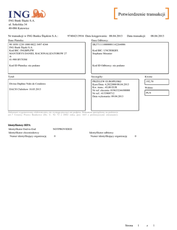 Potwierdzenie transakcji ING Bank Śląski S.A. ul. Sokolska 34 40-086 Katowice Nr transakcji w ING Banku Śląskim S.A.: 97404213916 Data księgowania: 08.04.2013 Dane Płatnika: Data transakcji: 08.04.2013 Dane Odbiorcy: 90 1050 1230 1000 0022 5497 4344 ING Bank Śląski S.A. Kod BIC: INGBPLPW MANTERYS DANIEL RACJONALIZATOROW 27 /6 41-908 BYTOM SK5711110000001142264006 Kod ID Płatnika: nie podano Kod ID Odbiorcy: nie podano Tytuł: Kod BIC: UNCRSKBX Stephane Mounier Szczegóły: Kwota: PRZELEW EUROPEJSKI Kurs/Data: 4,2822000/08.04.2013 Kw. trans.: 45,00 EUR Nr ref. zlecenia: 019633244/00000 Nr ref.: 4153909712 Data wykonania: 09.04.2013 Divina Daphne Nido de Condores DACH Clubshow 18.05.2013 192,70 Waluta: PLN Dokument wygenerowany elektronicznie, nie wymaga pieczęci ani podpisu. Dokument sporządzony na podstawie art.7 Ustawy Prawo Bankowe (Dz. U. Nr 72 z 2002 roku, poz. 665 z późniejszymi zmianami). Identyfikatory SEPA Identyfikator End-to-End Identyfikator zleceniodawcy Numer identyfikujący organizację NOTPROVIDED 0 Identyfikator odbiorcy Numer identyfikujący organizację Strona 0 1 z 1