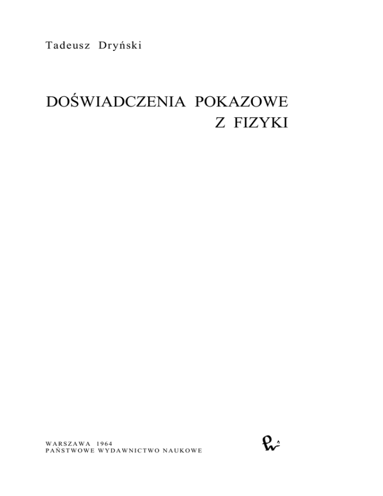 Tadeusz Dryński DOŚWIADCZENIA POKAZOWE Z FIZYKI WARSZAWA 1964 PAŃSTWOWE WYDAWNICTWO NAUKOWE PAŃSTWOWE WYDAWNICTWO NAUKOWE Red. Barbara Górska Red. techn.: Maria Zielińska Wydanie I. Nakład 4000+250 egz. Ark. wyd. 43,75. Ark. druk. 40,25 + 3 wkładki Papier drukowany sat. kl. V, 70 g 70 × 100. Oddano do składania 1 X 1963. Podpisano Do druku 15 IV 1964. Druk ukończono w kwietniu 1964. Zam. nr 455/5 O-2 Cena zł 60,- DRUKARNIA UNIWERSYTETU im. ADAMA MICKIEWICZA W POZNANIU Obwolutę projektowała Sława Gospodarek Copyright by Państwowe Wydawnictwo Naukowe Warszawa 1964 Printed in Poland Spis rzeczy I. I. I. I. I. UWAGI OGÓLNE 1. 2. 3. 4. Wstęp ........................................................................................................................... 9 Zasady demonstracji ................................................................................................... 10 Metody demonstracji .................................................................................................. 12 Technika demonstracji ................................................................................................ 15 1. Ustawienie doświadczeń .........................................................................................15 2. Sprawdzanie przygotowania doświadczeń ............................................................ 16 3. Rysunki na tablicy ................................................................................................. 16 4. Projekcja na ekran ................................................................................................. 18 I. 5. Przyrządy demonstracyjne ........................................................................................... 34 I. 6. Sala wykładowa ........................................................................................................... 35 I. 7. Wystawy przyrządów ................................................................................................... 36 II. MECHANIKA II. 1. Pomiary fizyczne ....................................................................................................... 39 II. 2. Kinematyka ................................................................................................................ 40 1. Ruch jednostajny .................................................................................................. 40 2. Ruch jednostajnie zmienny .................................................................................. 41 3. Względność ruchu ................................................................................................ 47 4. Ruchy złożone ...................................................................................................... 47 II. 3. Dynamika ruchu prostoliniowego ............................................................................. 53 1. I i II zasada dynamiki .......................................................................................... 53 2. III zasada dynamiki .............................................................................................. 55 3. Zasada zachowania pędów ................................................................................... 57 4. Pomiar statystyczny sił ......................................................................................... 59 II. 4. Siły bezwładności w układzie przyspieszonym prostoliniowo ................................. 60 II. 5. Dynamika ruchu jednostajnego po kole (obserwator nieruchomy) ........................... 67 II. 6. Siły bezwładności w układzie wirującym (obserwator ruchomy) ............................. 73 1. Odśrodkowa siła bezwładności ............................................................................ 73 2. Siła Coriolisa ........................................................................................................ 74 II. 7. Tarcie zewnętrzne ...................................................................................................... 78 1. Tarcie przesuwania albo poślizgu ........................................................................ 78 2. Tarcie toczne ........................................................................................................ 81 II. 8. Praca i energia ........................................................................................................... 82 II. 9. Statystyka ................................................................................................................... 88 1. Równowaga sił ..................................................................................................... 88 2. Środek ciężkości ................................................................................................... 92 II. 10. Ruch obrotowy ciała sztywnego ............................................................................... 95 1. Kinematyka ruchu obrotowego ........................................................................... 95 2. Dynamika ruchu obrotowego .............................................................................. 96 II. 11. Właściwości sprężyste ciał ..................................................................................... 109 II. 12. Ciecze w spoczynku ............................................................................................... 116 1. Zasadnicze właściwości i prawa ....................................................................... 116 2. Zjawiska powierzchniowe w cieczach .............................................................. 120 II. 13. Gazy w spoczynku .................................................................................................. 130 II. 14. Ruch płynów doskonałych (cieczy i gazów) .......................................................... 136 II. 15. Ruch płynów rzeczywistych (cieczy i gazów) ....................................................... 14