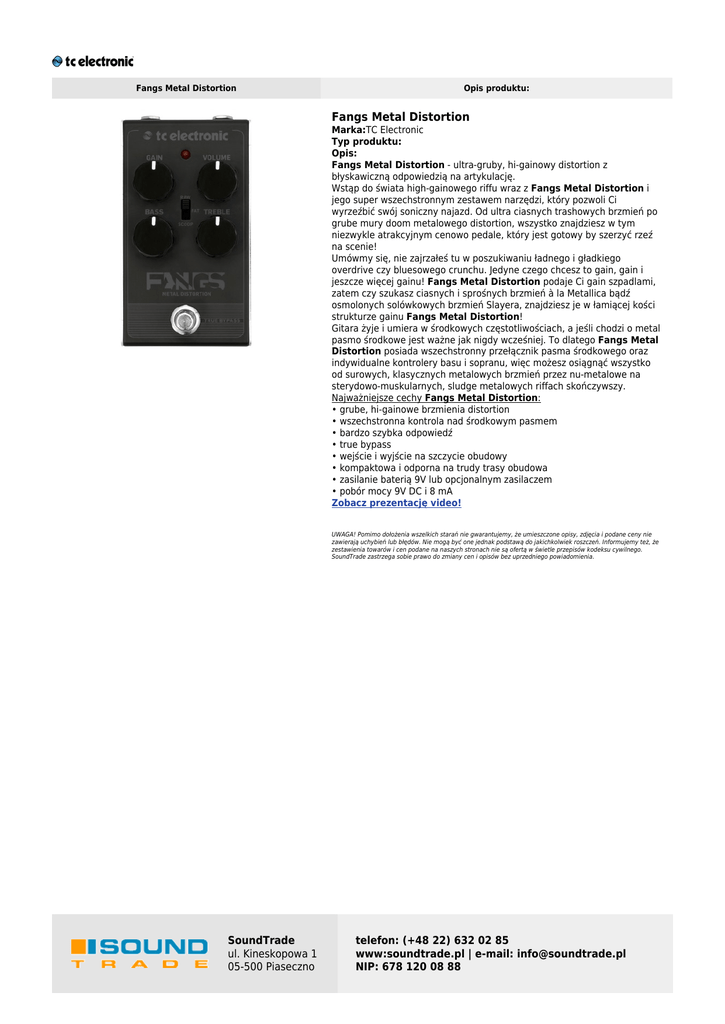 Fangs Metal Distortion Opis produktu: Fangs Metal Distortion Marka:TC Electronic Typ produktu: Opis: Fangs Metal Distortion - ultra-gruby, hi-gainowy distortion z błyskawiczną odpowiedzią na artykulację. Wstąp do świata high-gainowego riffu wraz z Fangs Metal Distortion i jego super wszechstronnym zestawem narzędzi, który pozwoli Ci wyrzeźbić swój soniczny najazd. Od ultra ciasnych trashowych brzmień po grube mury doom metalowego distortion, wszystko znajdziesz w tym niezwykle atrakcyjnym cenowo pedale, który jest gotowy by szerzyć rzeź na scenie! Umówmy się, nie zajrzałeś tu w poszukiwaniu ładnego i gładkiego overdrive czy bluesowego crunchu. Jedyne czego chcesz to gain, gain i jeszcze więcej gainu! Fangs Metal Distortion podaje Ci gain szpadlami, zatem czy szukasz ciasnych i sprośnych brzmień à la Metallica bądź osmolonych solówkowych brzmień Slayera, znajdziesz je w łamiącej kości strukturze gainu Fangs Metal Distortion! Gitara żyje i umiera w środkowych częstotliwościach, a jeśli chodzi o metal pasmo środkowe jest ważne jak nigdy wcześniej. To dlatego Fangs Metal Distortion posiada wszechstronny przełącznik pasma środkowego oraz indywidualne kontrolery basu i sopranu, więc możesz osiągnąć wszystko od surowych, klasycznych metalowych brzmień przez nu-metalowe na sterydowo-muskularnych, sludge metalowych riffach skończywszy. Najważniejsze cechy Fangs Metal Distortion: • grube, hi-gainowe brzmienia distortion • wszechstronna kontrola nad środkowym pasmem • bardzo szybka odpowiedź • true bypass • wejście i wyjście na szczycie obudowy • kompaktowa i odporna na trudy trasy obudowa • zasilanie baterią 9V lub opcjonalnym zasilaczem • pobór mocy 9V DC i 8 mA Zobacz prezentację video! UWAGA! Pomimo dołożenia wszelkich starań nie gwarantujemy, że umieszczone opisy, zdjęcia i podane ceny nie zawierają uchybień lub błędów. Nie mogą być one jednak podstawą do jakichkolwiek roszczeń. Informujemy też, że zestawienia towarów i cen podane na naszych stronach nie są ofertą w świetle przepisów kodeksu cywilnego. SoundTrade zastrzega sobie prawo do zmiany cen i opisów bez uprzedniego powiadomienia. SoundTrade ul. Kineskopowa 1 05-500 Piaseczno telefon: (+48 22) 632 02 85 www:soundtrade.pl | e-mail: [email protected] NIP: 678 120 08 88